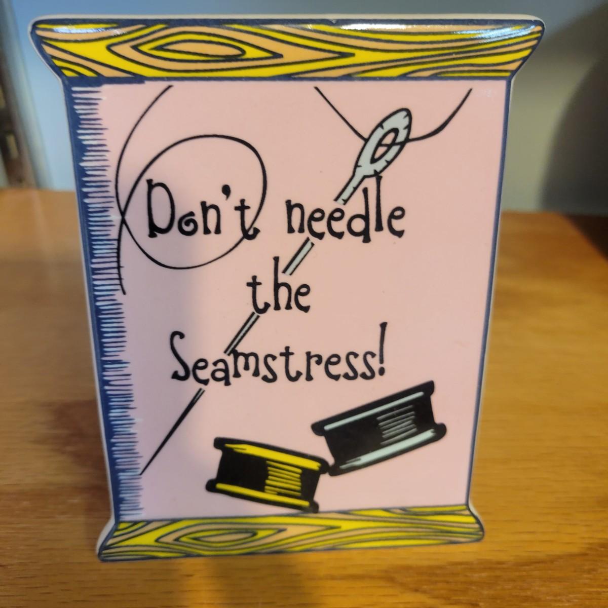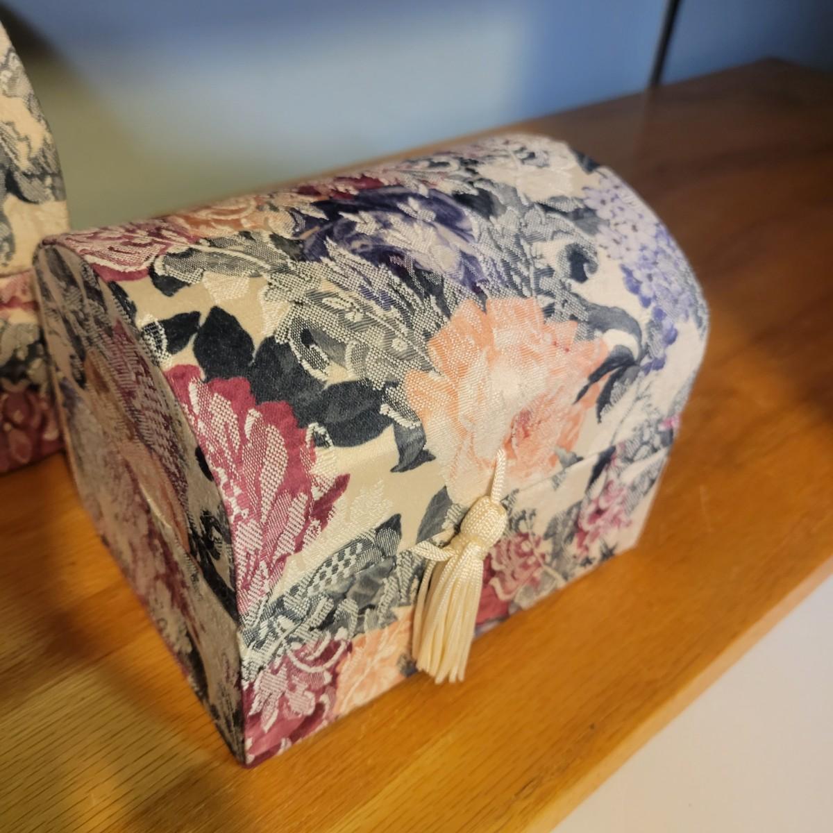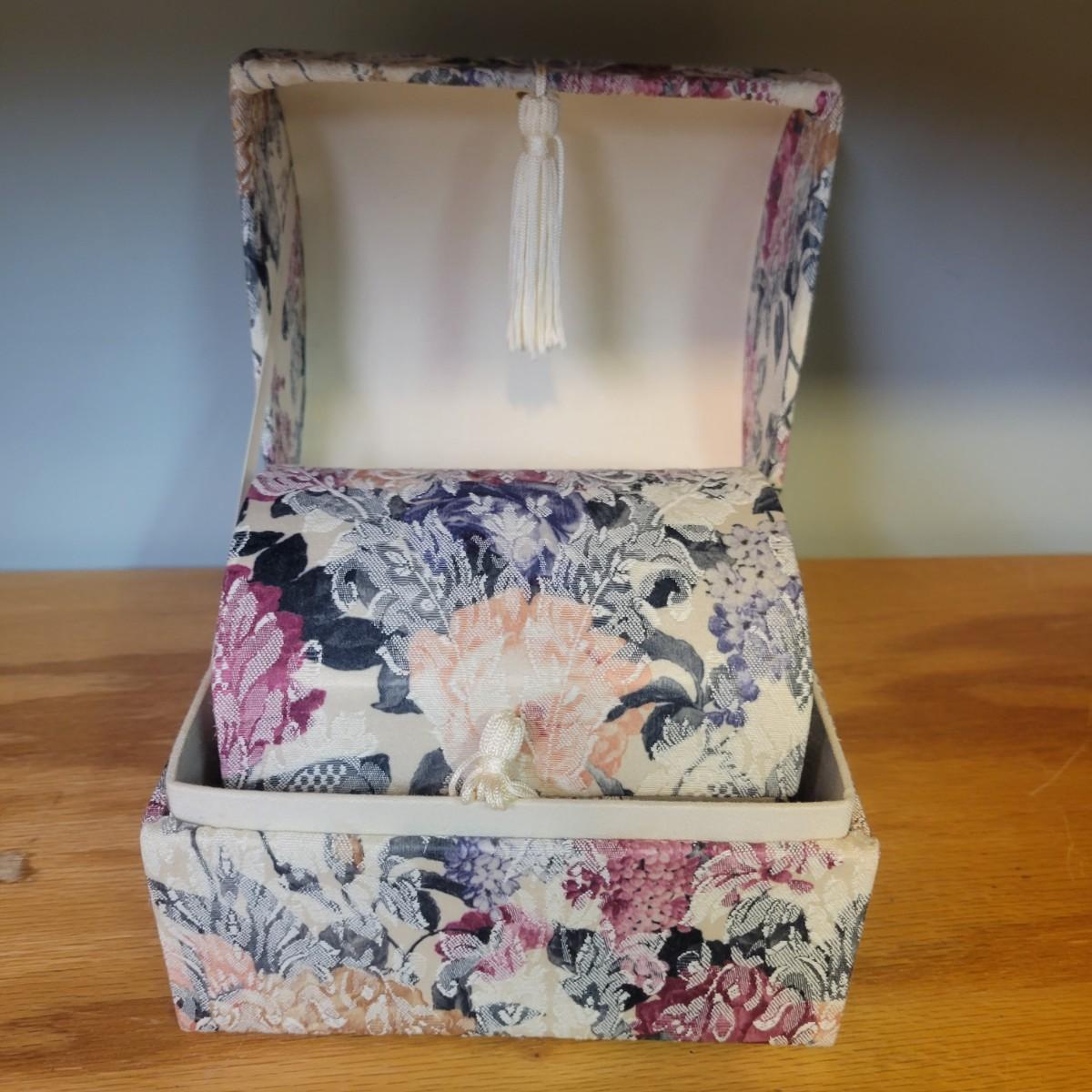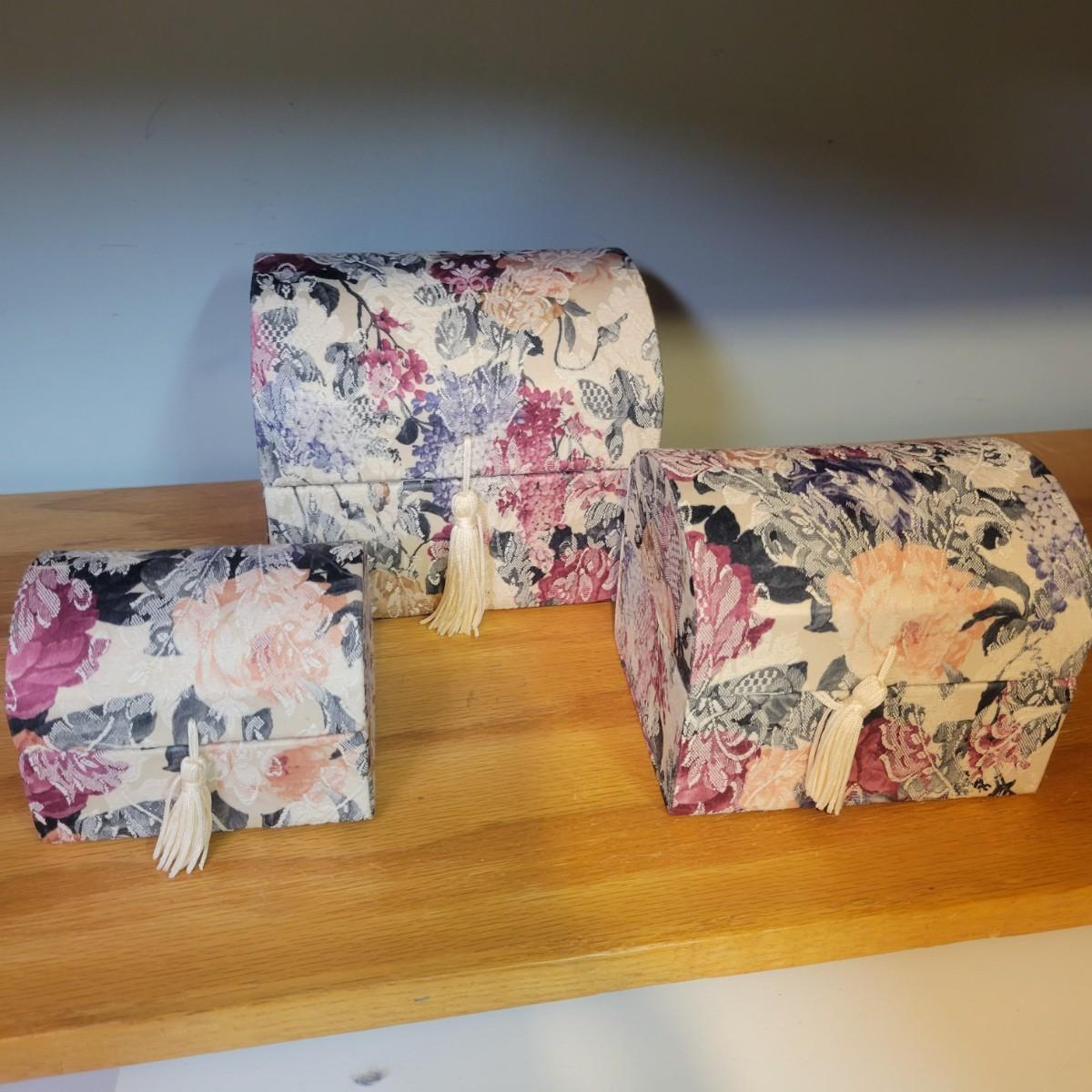 An assortment of sewing room decor items in good condition. Included in this lot is a decorative ceramic tea pot, two sewing boxes with trays to hold needles and whatnot, a set of nesting boxes with a fabric exterior and more. Largest sewing box measures approximately 7.5 " x 4.5" Shipping available