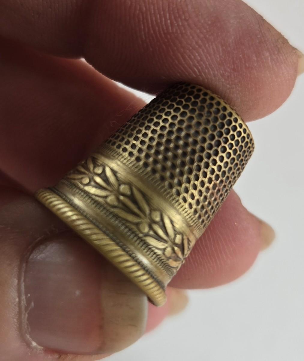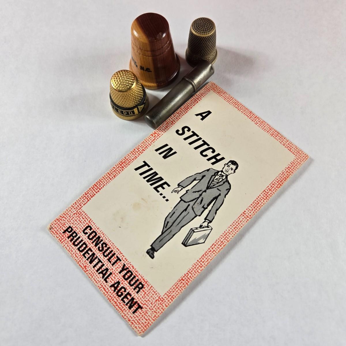 This auction lot is for Sewing Collectibles. This is a nice small collection of sewing items which includes 2 metal thimbles, one wood thimble, a needle holder and an advertising sewing kit from Prudential Insurance.
