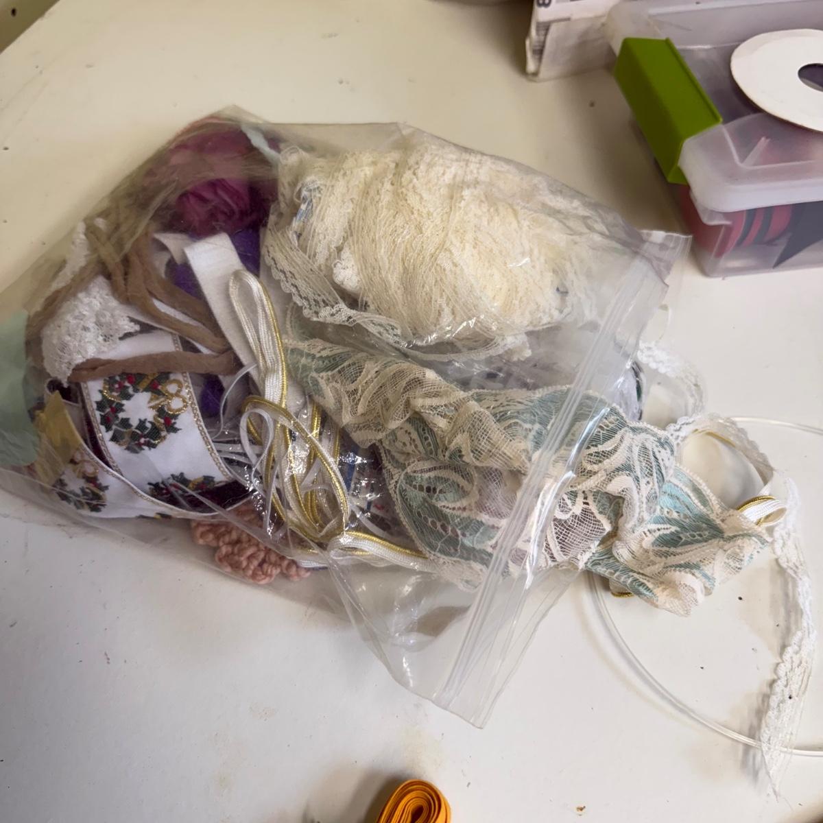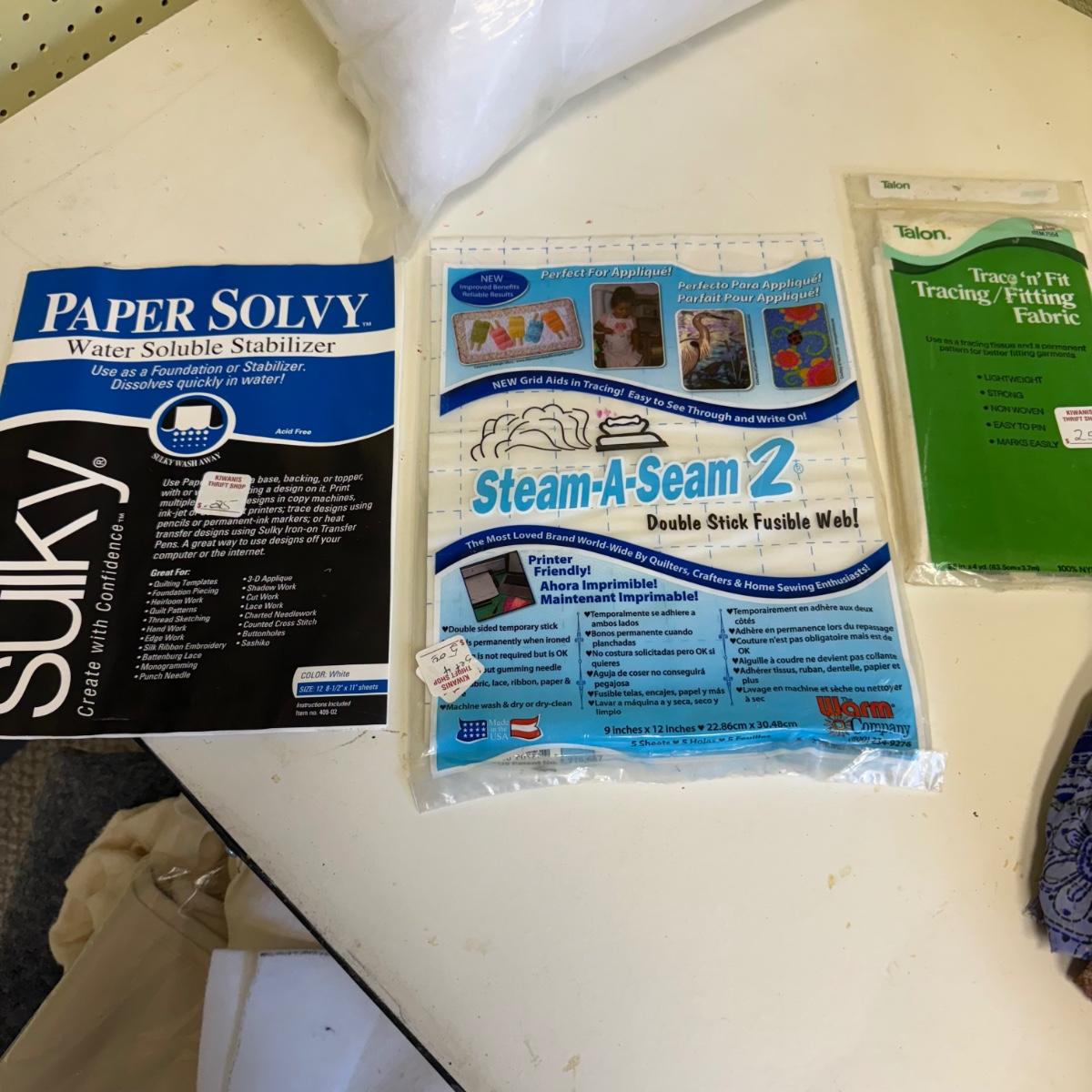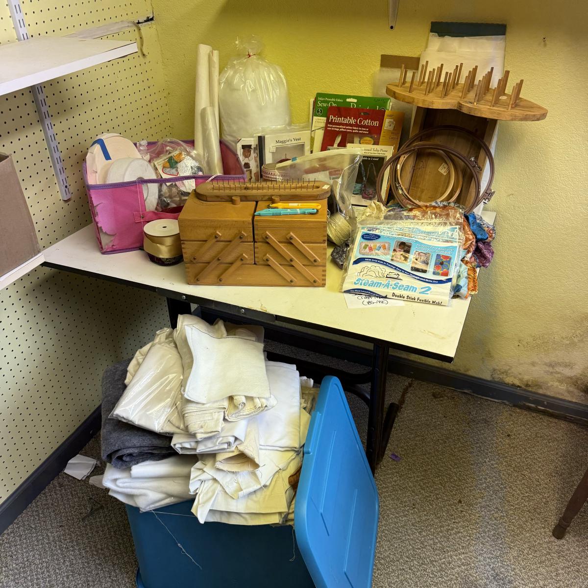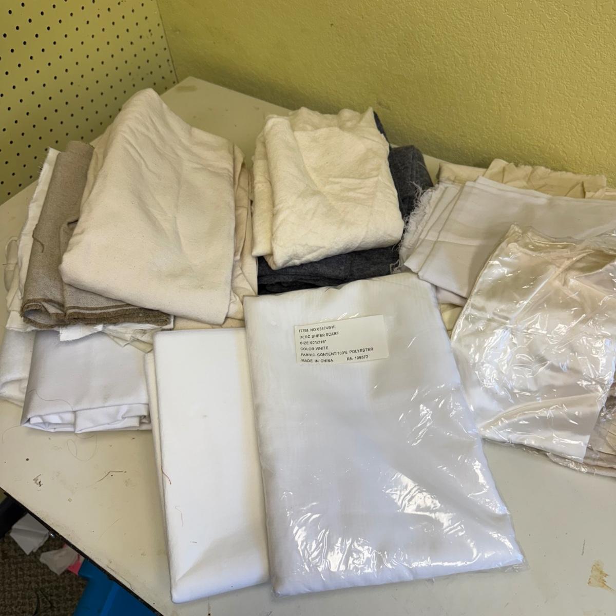 An eclectic collection of sewing materials. See photographs for entire collection. The large selection of white/cream fabric are multiple sample sizes of each fabric (not large). Also iron on transfer paper and a collection of polyfil and interfacing. The blue covered bin included in lot and the white table shown in the photograph photo is not included in this lot.