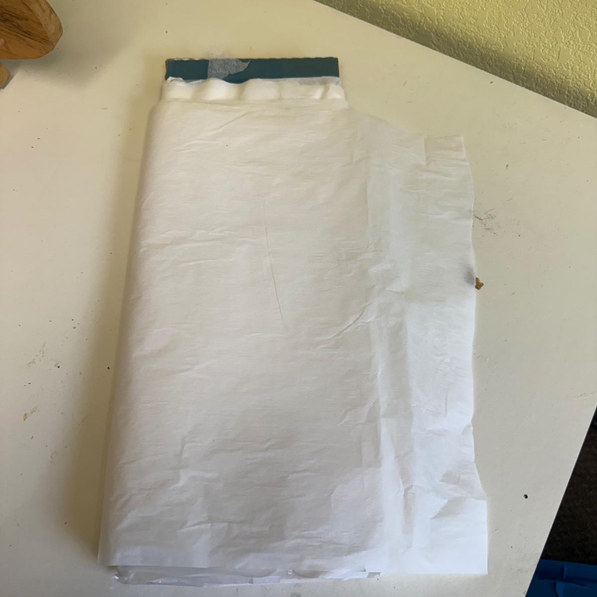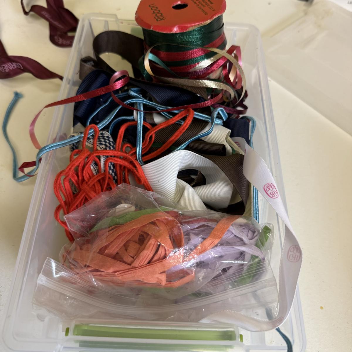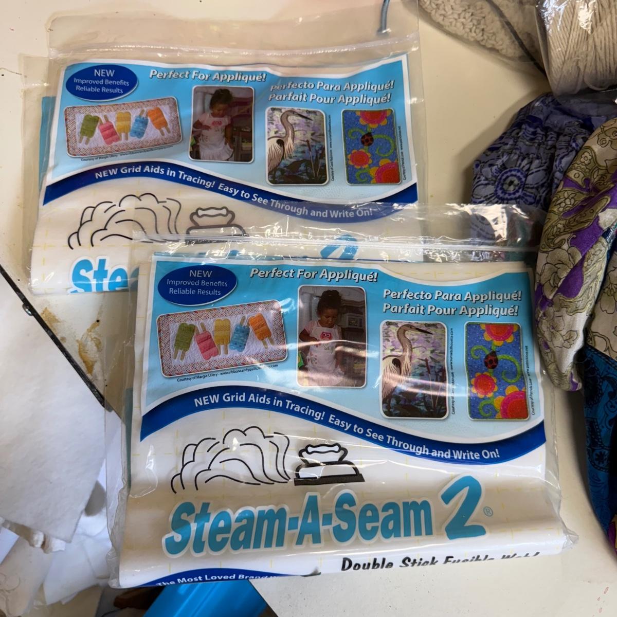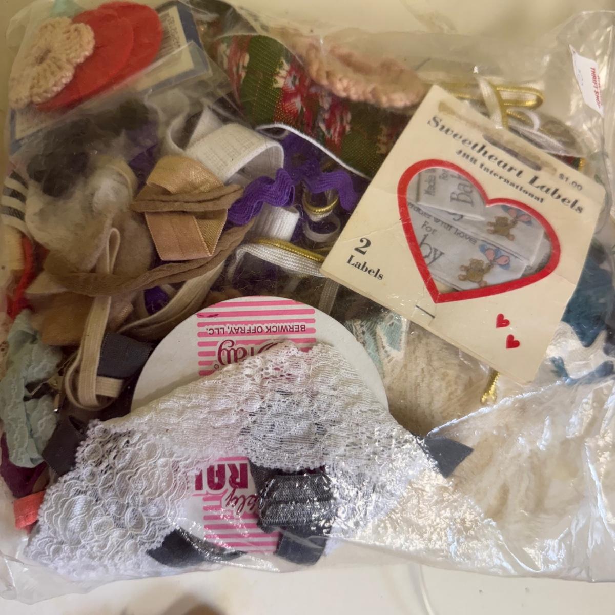 An eclectic collection of sewing materials. See photographs for entire collection. The large selection of white/cream fabric are multiple sample sizes of each fabric (not large). Also iron on transfer paper and a collection of polyfil and interfacing. The blue covered bin included in lot and the white table shown in the photograph photo is not included in this lot.