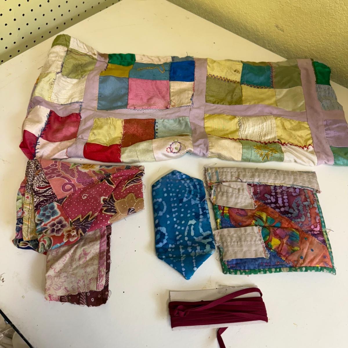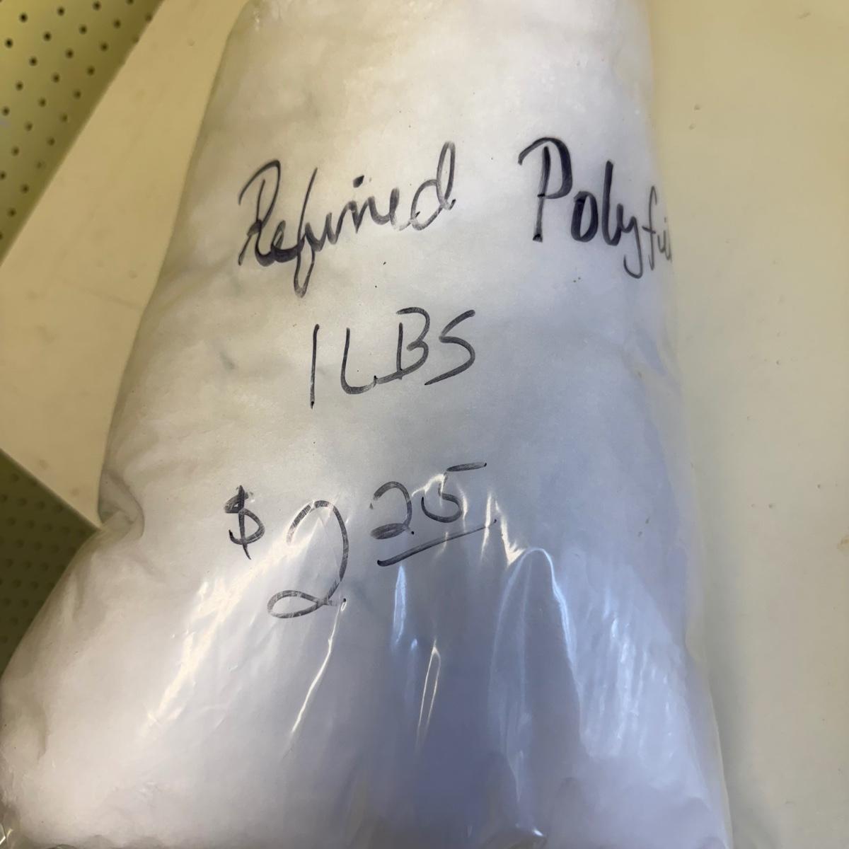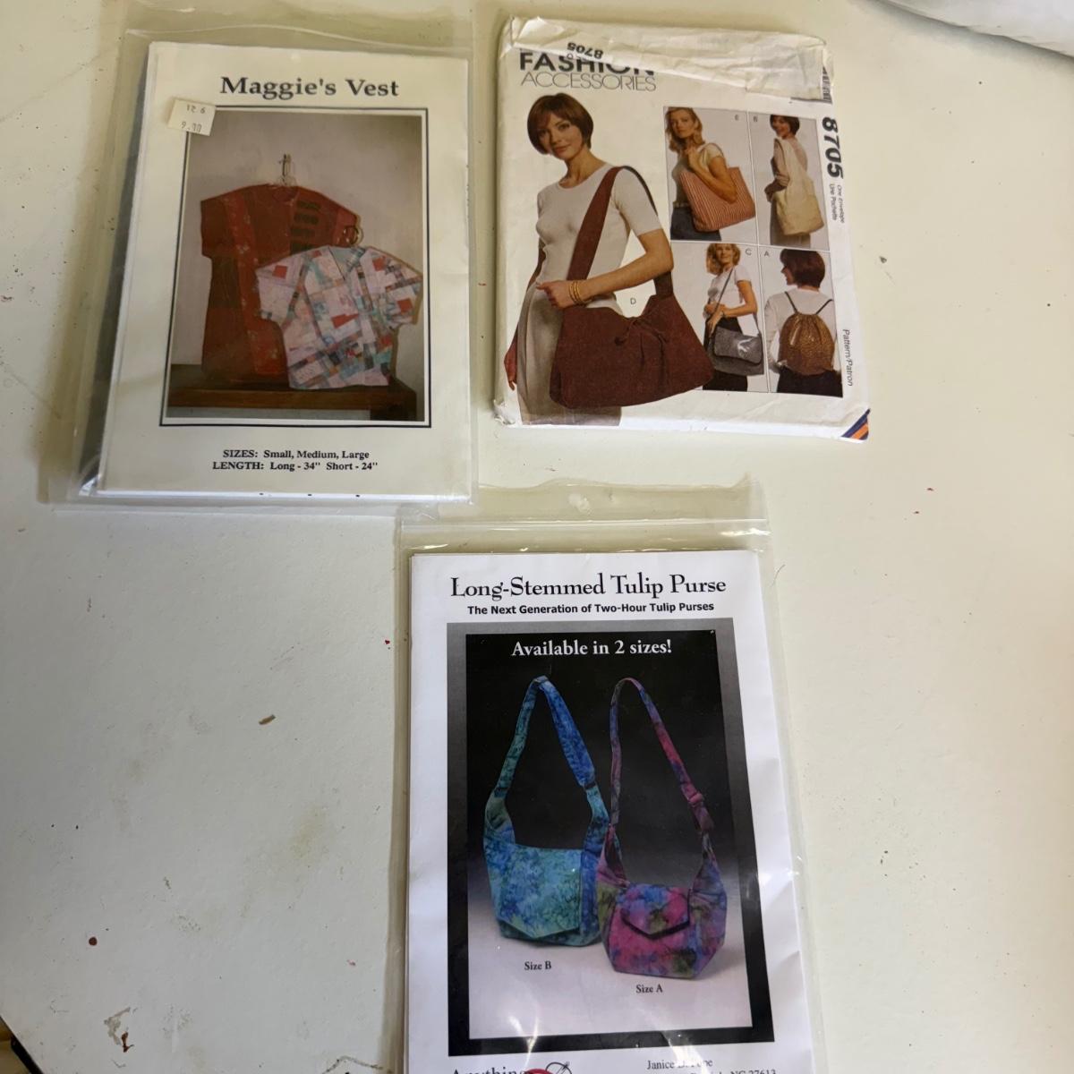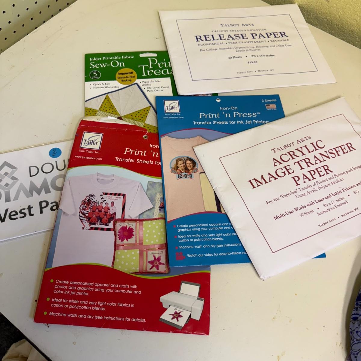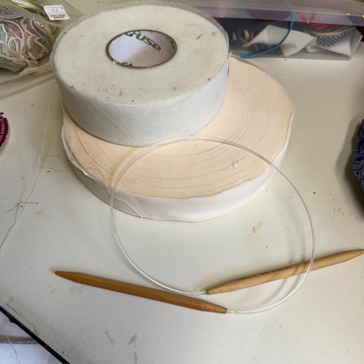 An eclectic collection of sewing materials. See photographs for entire collection. The large selection of white/cream fabric are multiple sample sizes of each fabric (not large). Also iron on transfer paper and a collection of polyfil and interfacing. The blue covered bin included in lot and the white table shown in the photograph photo is not included in this lot.