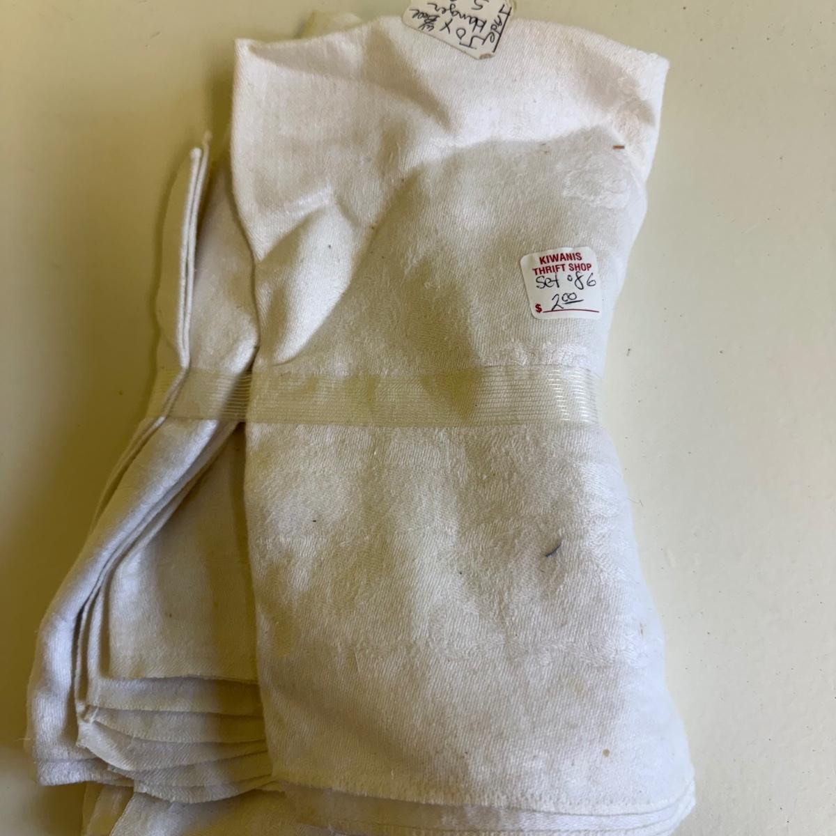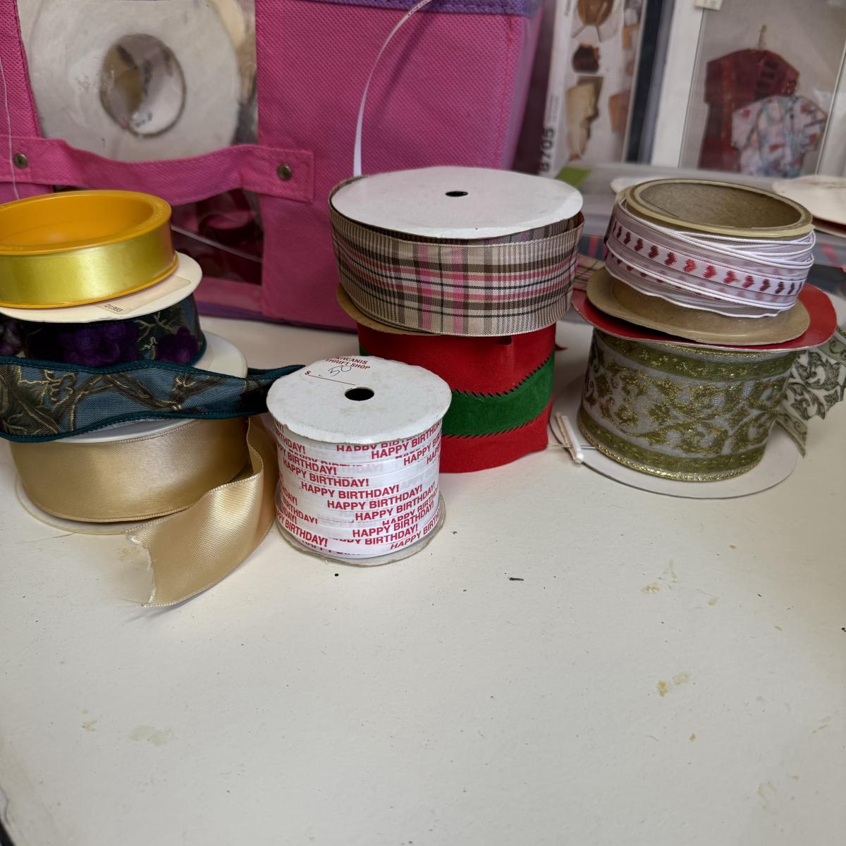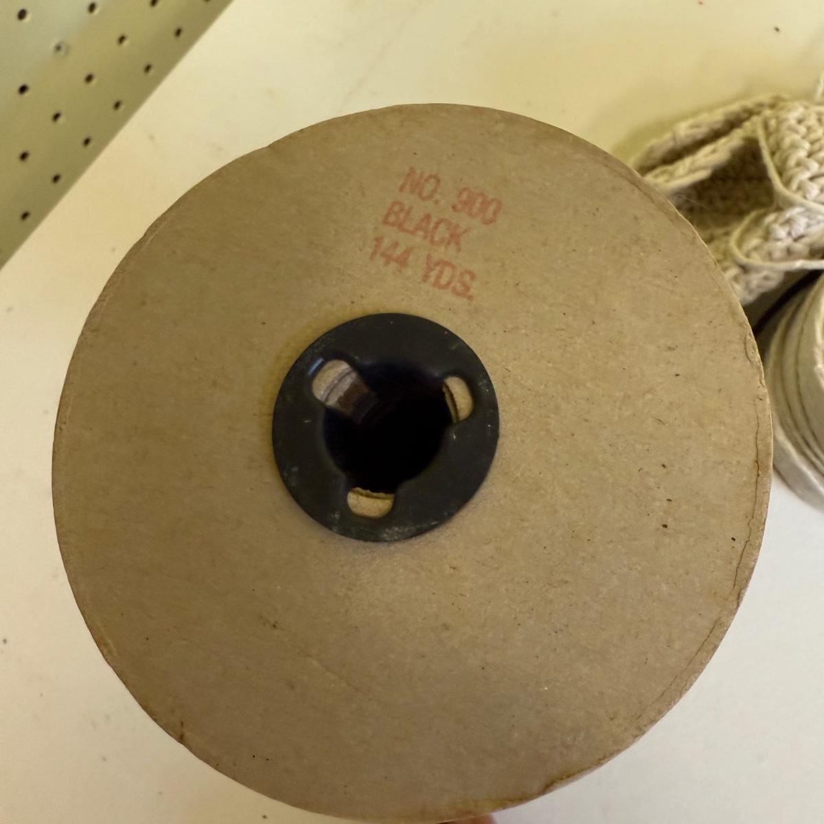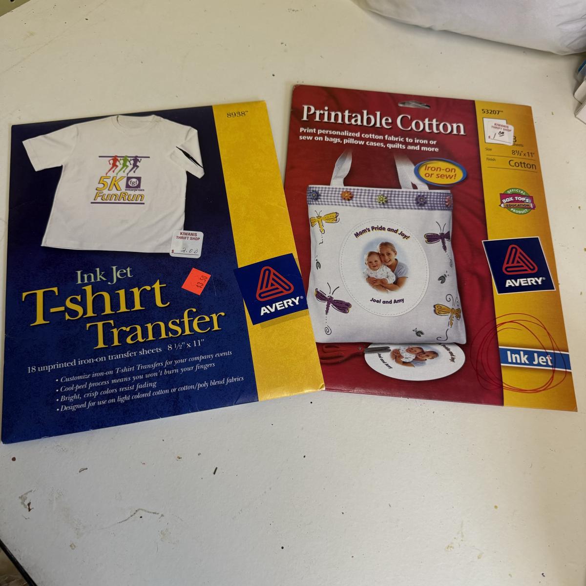 An eclectic collection of sewing materials. See photographs for entire collection. The large selection of white/cream fabric are multiple sample sizes of each fabric (not large). Also iron on transfer paper and a collection of polyfil and interfacing. The blue covered bin included in lot and the white table shown in the photograph photo is not included in this lot.
