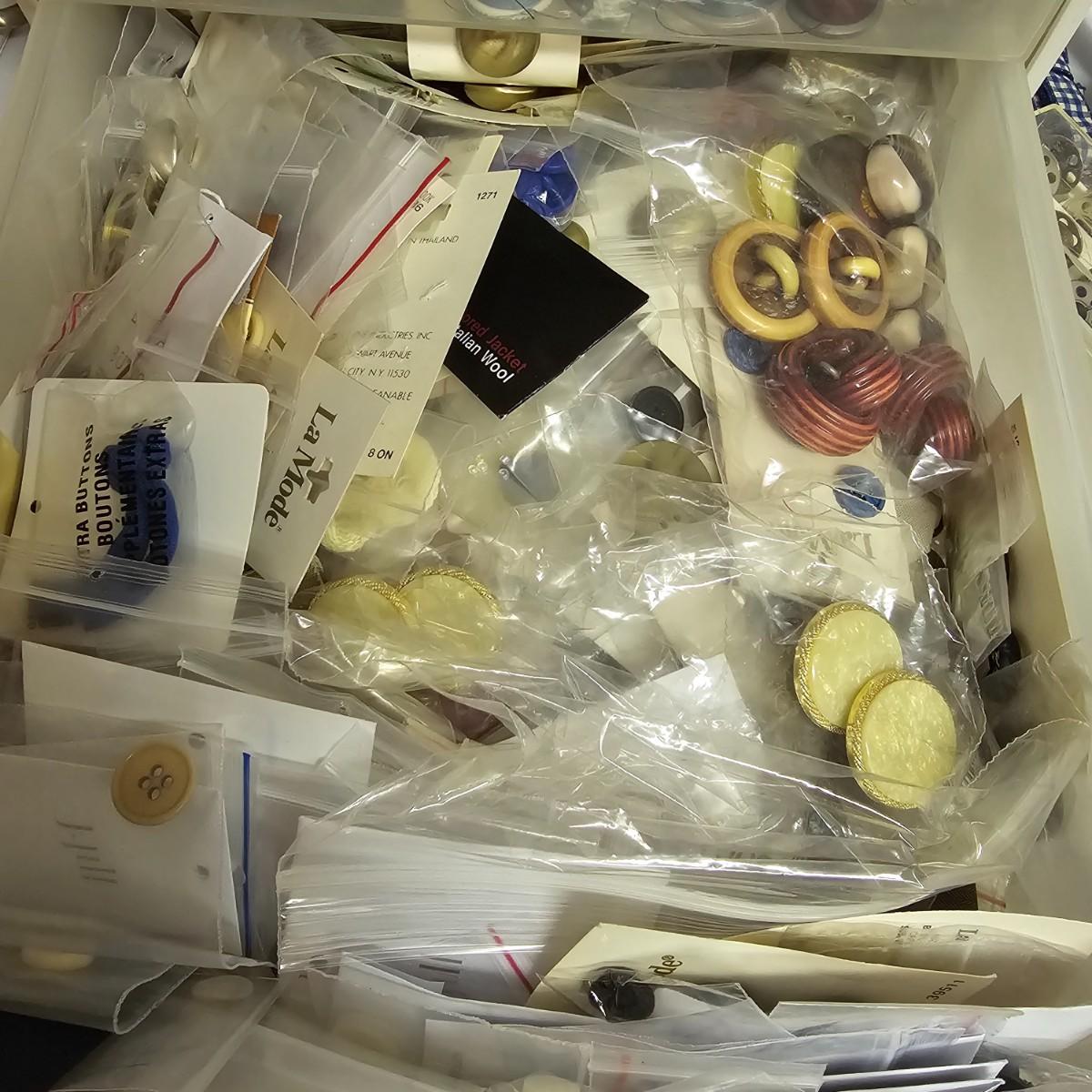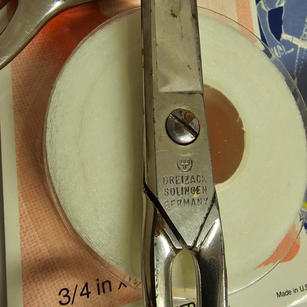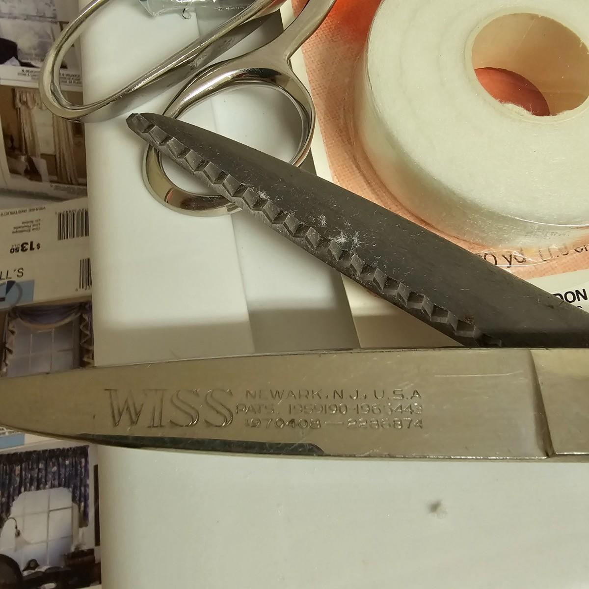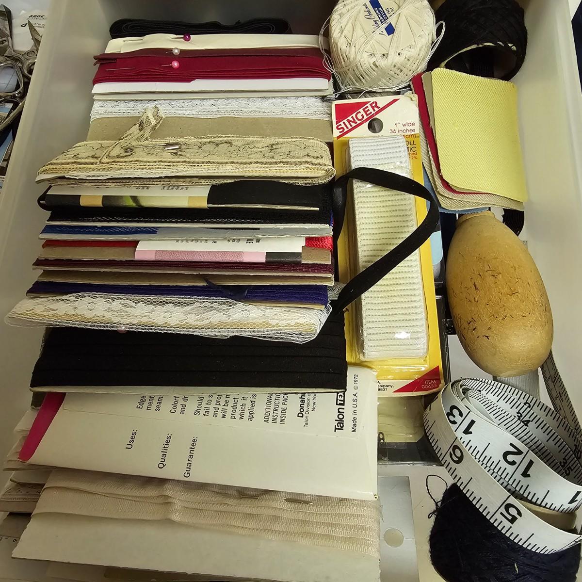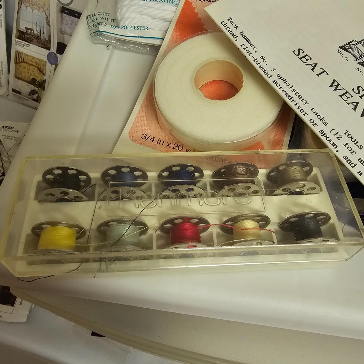 Thread, bobbins, pins, ribbon, scissors, more. Seam tape, eyelets, elastic, buttons, hooks, sequins. Numerous spools of thread by Coats, Molnlycke, Guterman, others. Three drawer case included, measures 11" x 12" x 10"H. Three pairs of scissors, two of which are Wiss, one of these being pinking shears. See photos for details. Shipping available.
