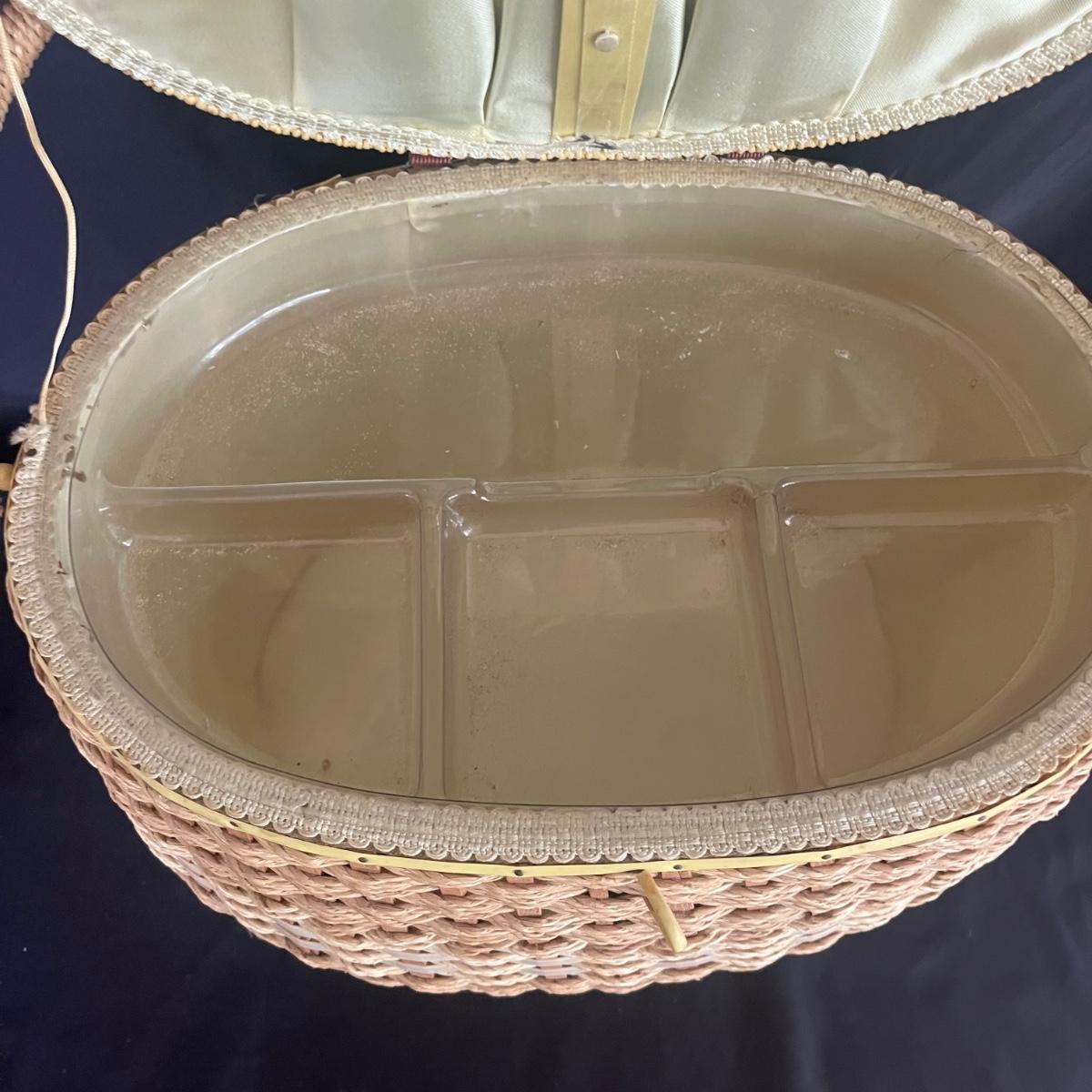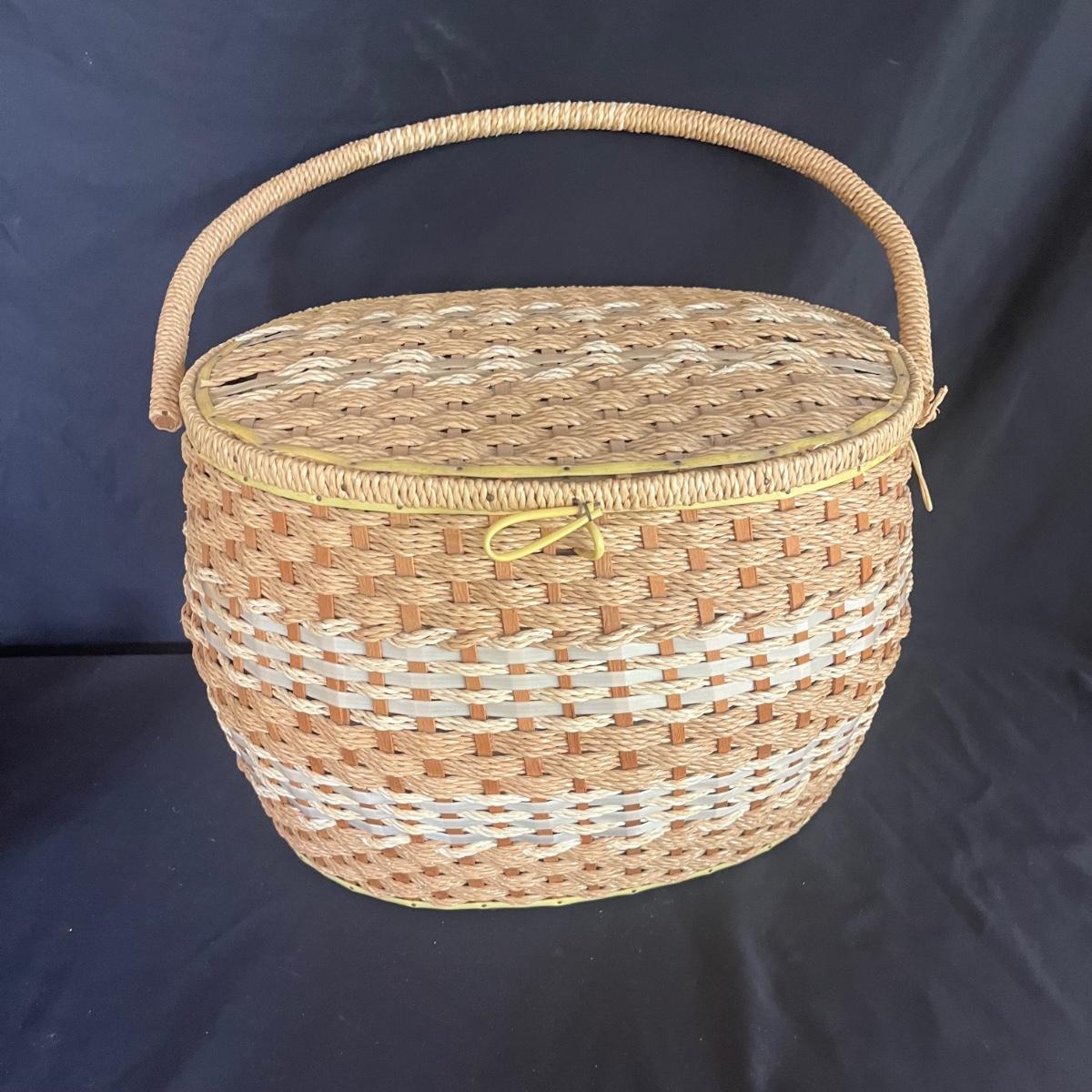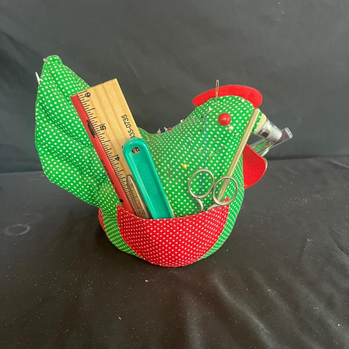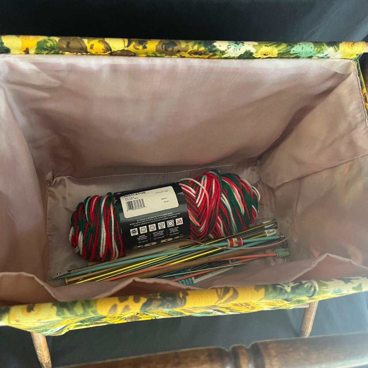 Lot includes scissors, pinking shears, chicken shaped pin cushion, elastic, collapsible cloth and wooden storage container, knitting needles, glue guns, storage box, glitter, woven basket with lid and more. Glue gun was plugged in and begin to warm. The knitting basket measures 16" x 13" x 17"H.