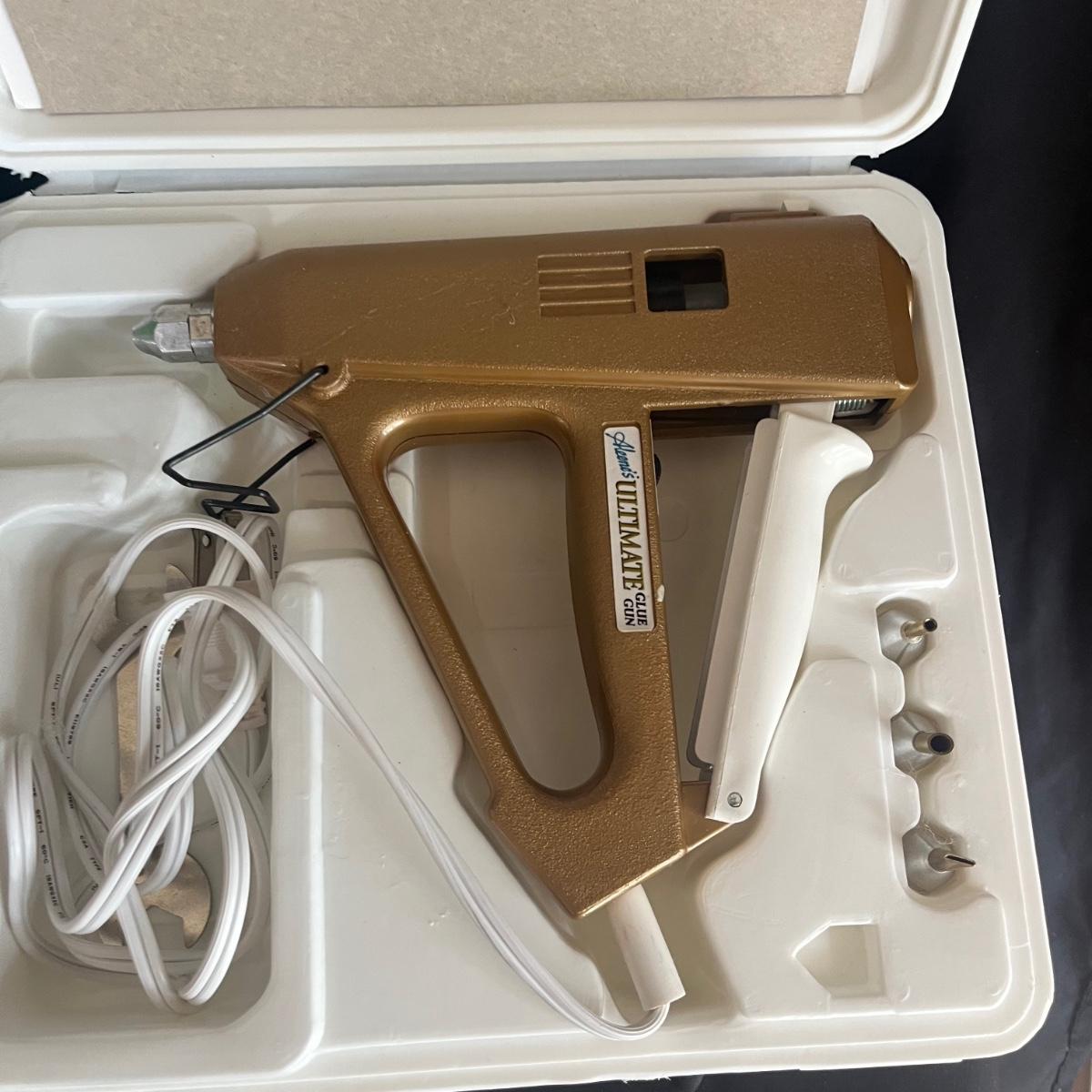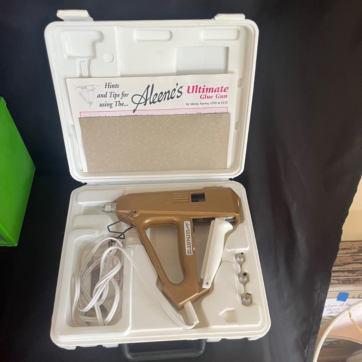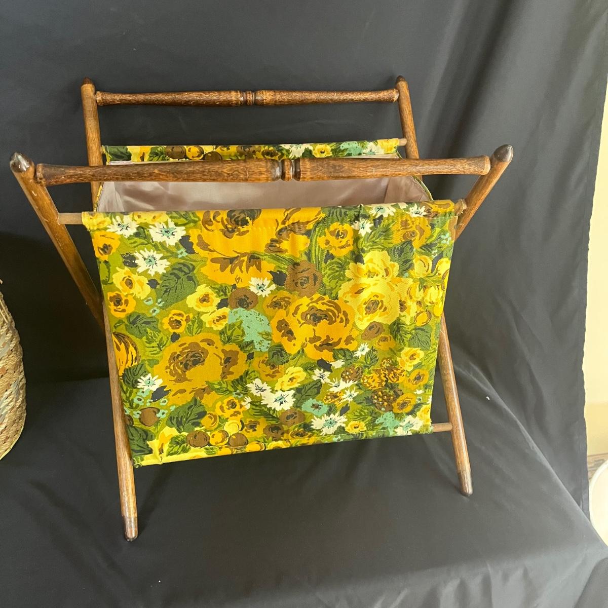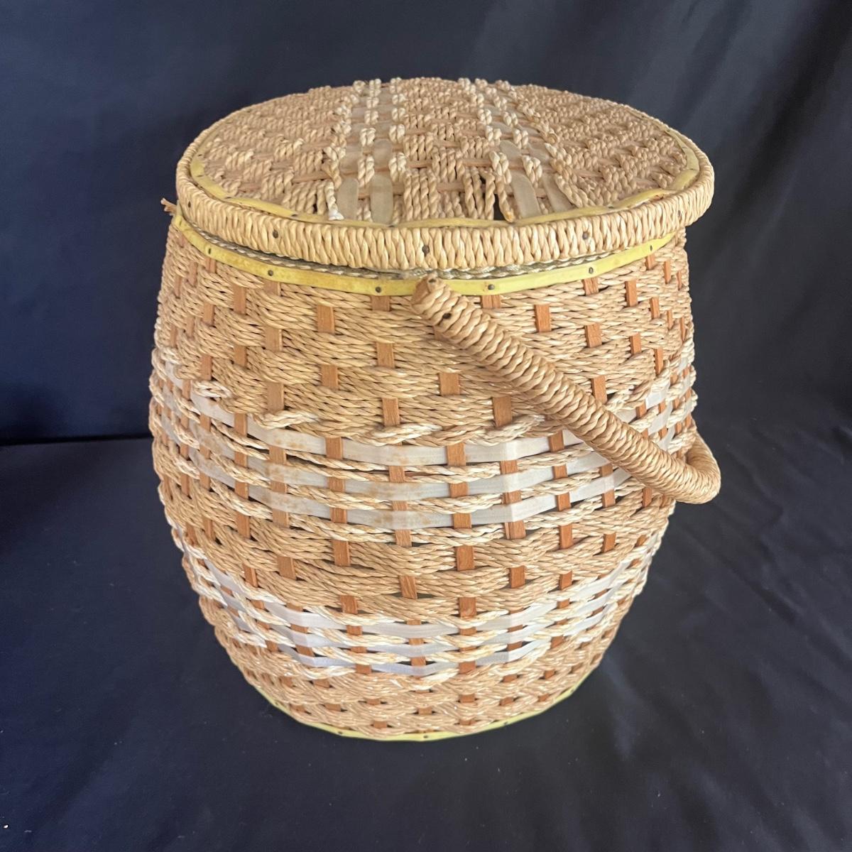 Lot includes scissors, pinking shears, chicken shaped pin cushion, elastic, collapsible cloth and wooden storage container, knitting needles, glue guns, storage box, glitter, woven basket with lid and more. Glue gun was plugged in and begin to warm. The knitting basket measures 16" x 13" x 17"H.