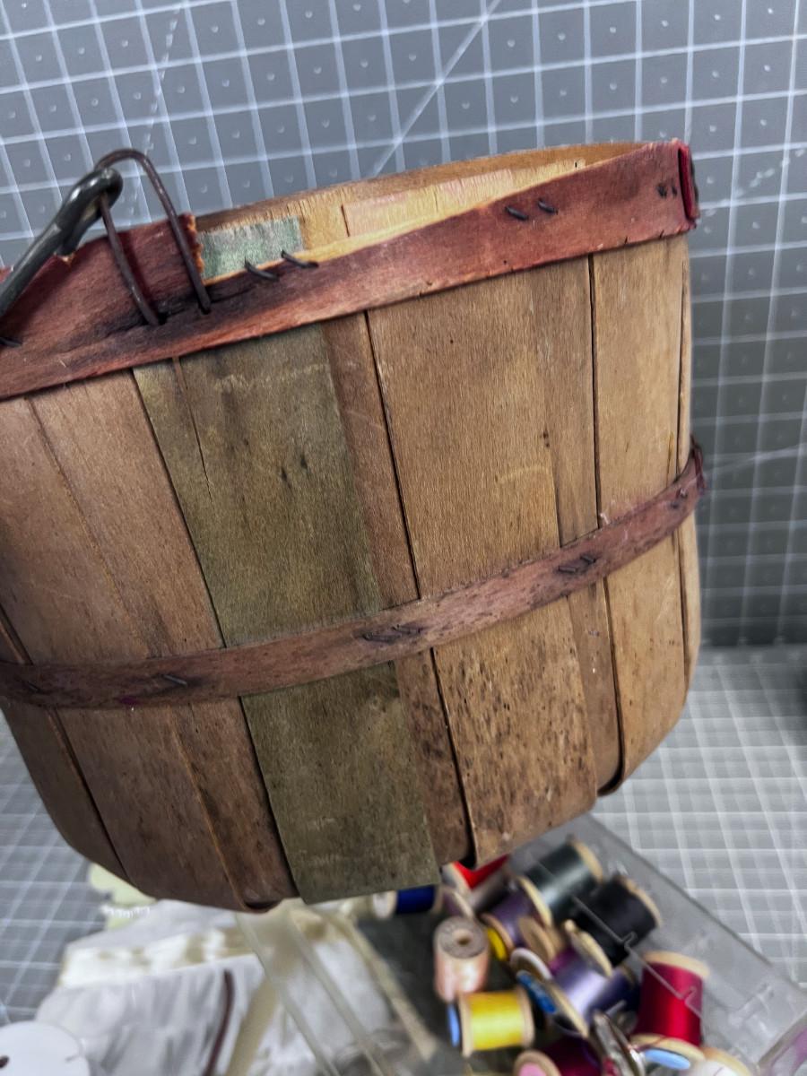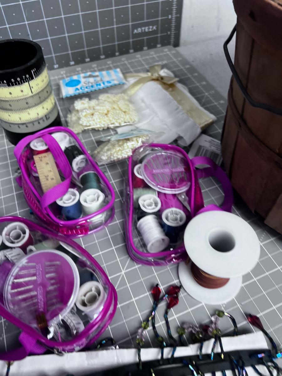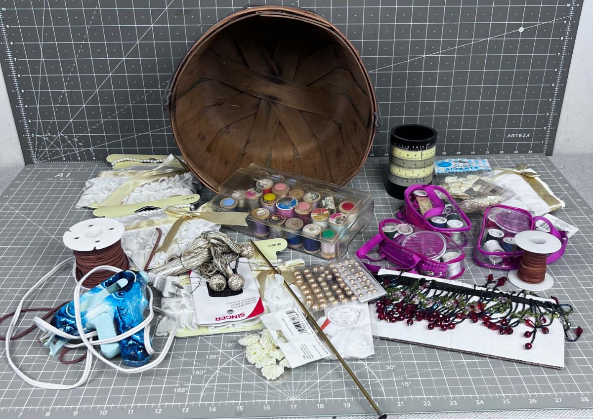 Sewing Items; Thread, Lace, Appliques with a sm. Basket