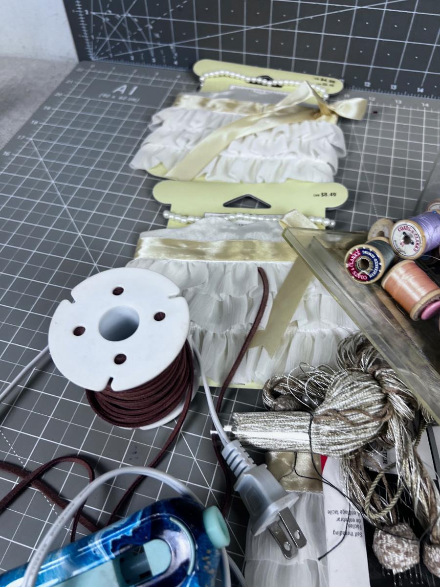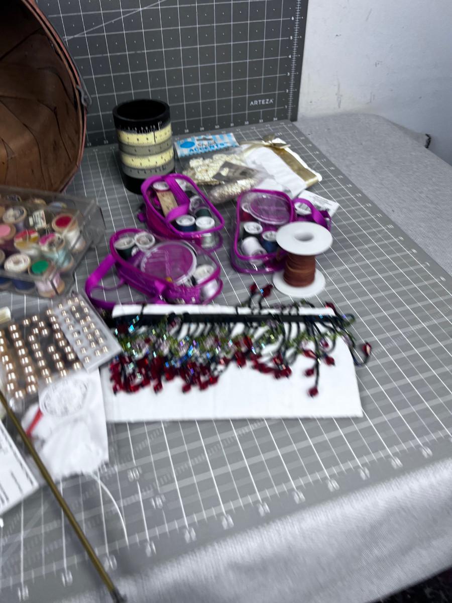 Sewing Items; Thread, Lace, Appliques  with a sm. Basket