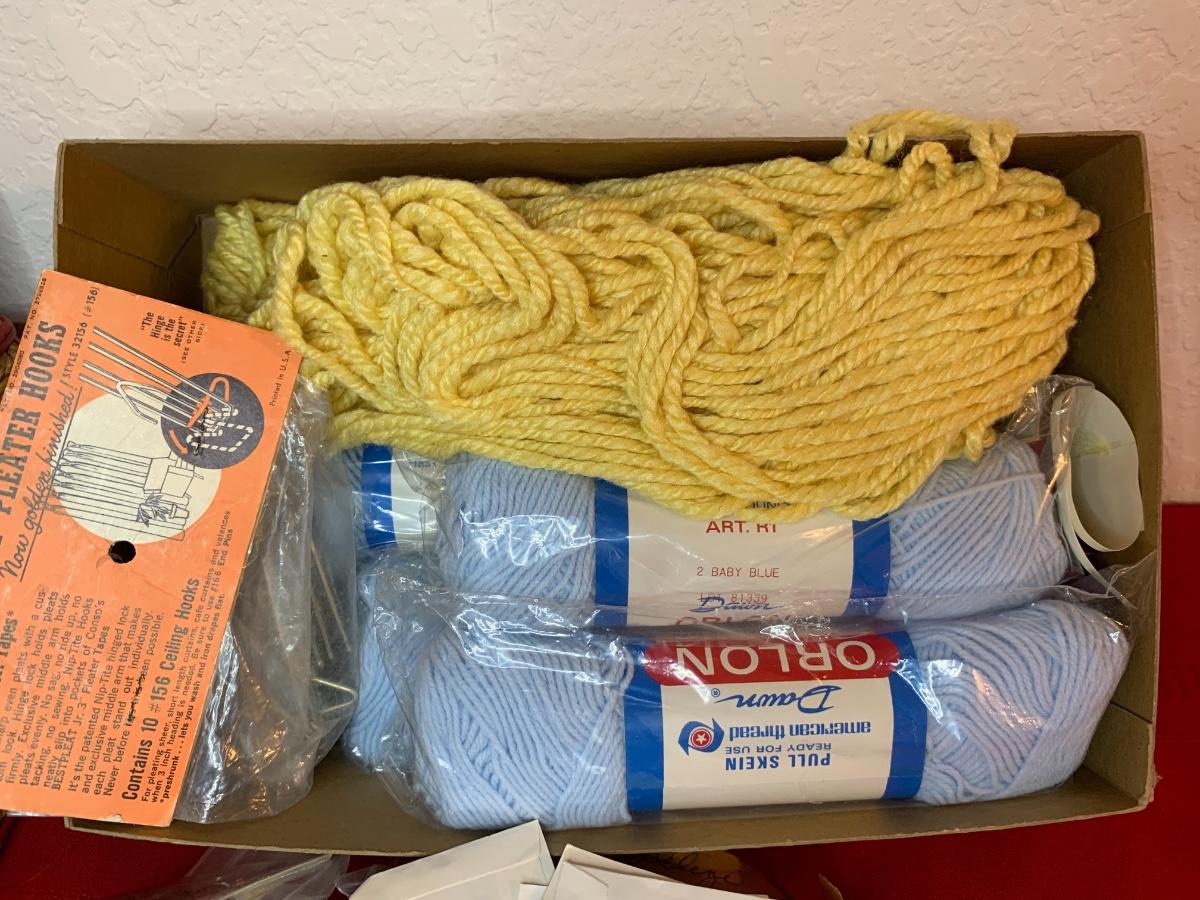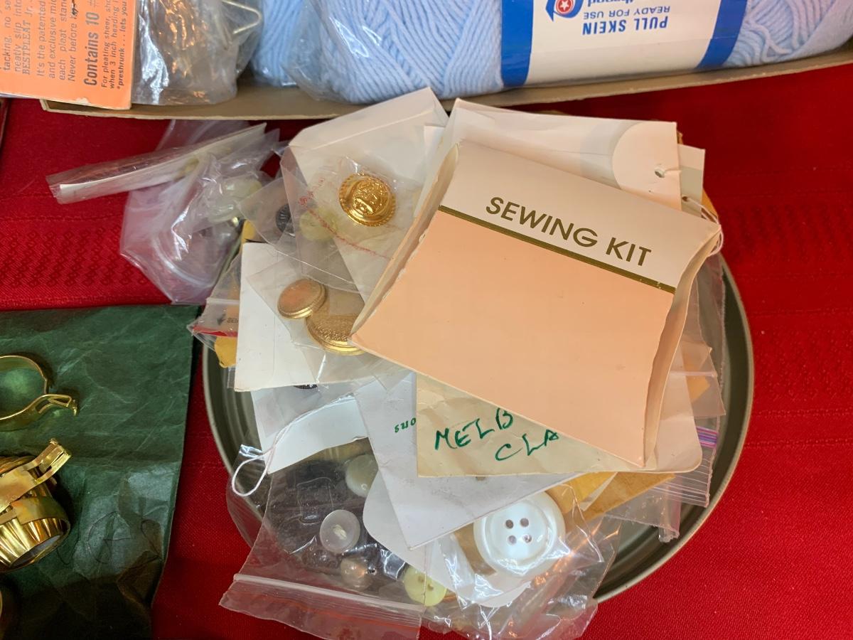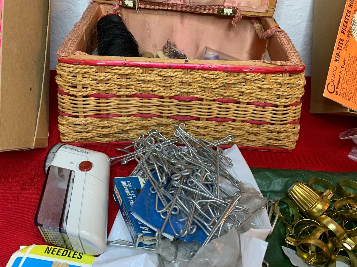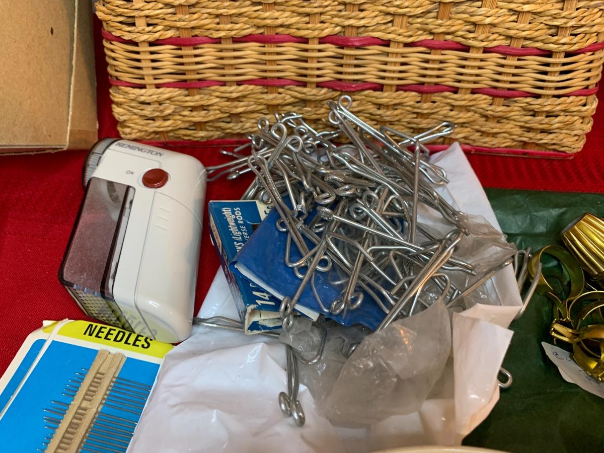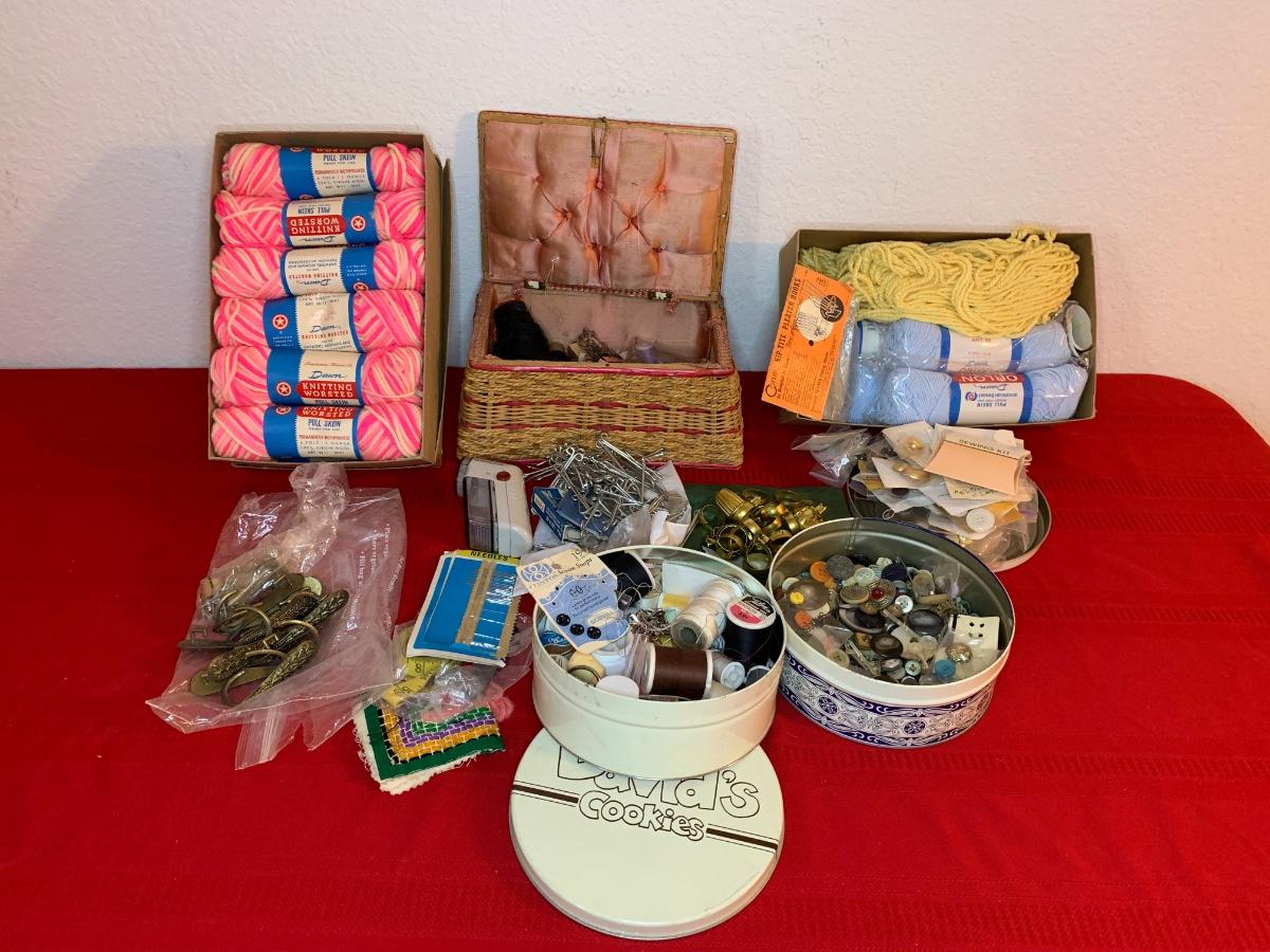 Includes a wicker basket, two tins full of buttons, notions, and thread, drapery clips and curtain rings, small skeins of worsted yarn by Dawn Knitting, a sweater shaver and more.
