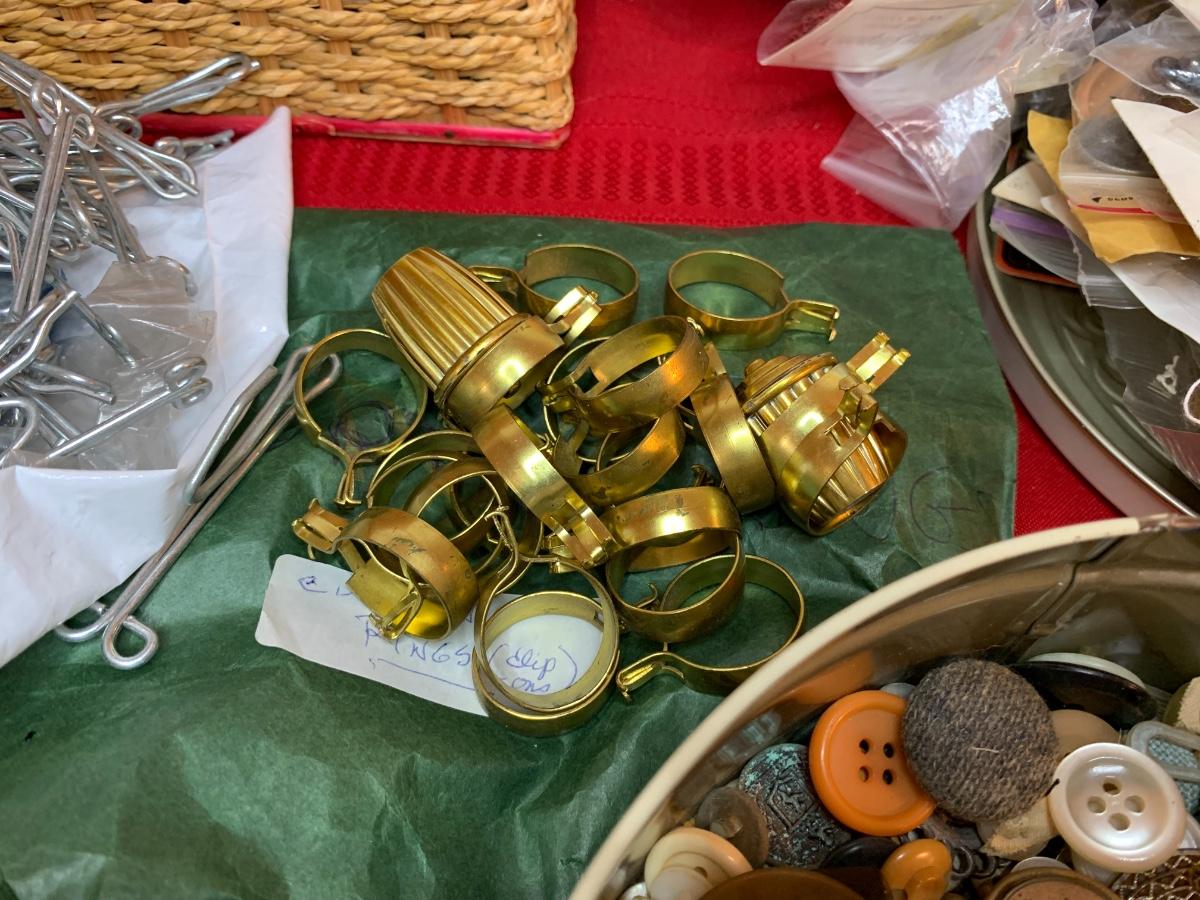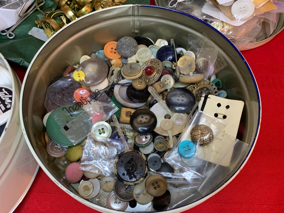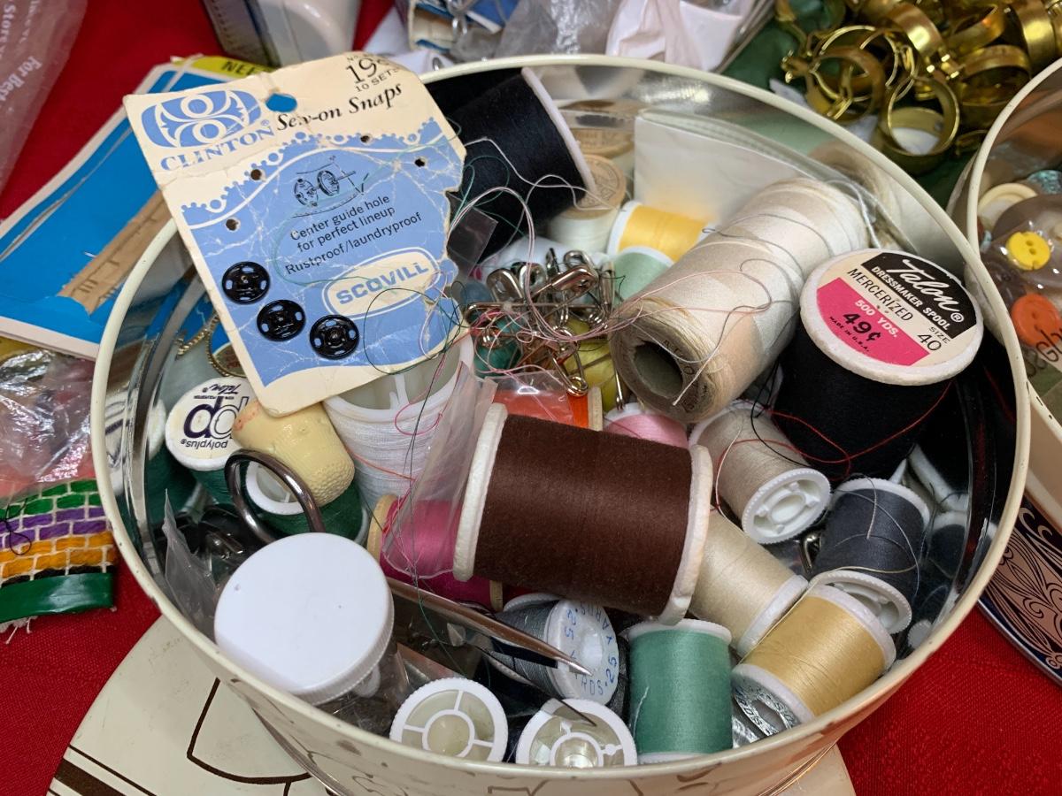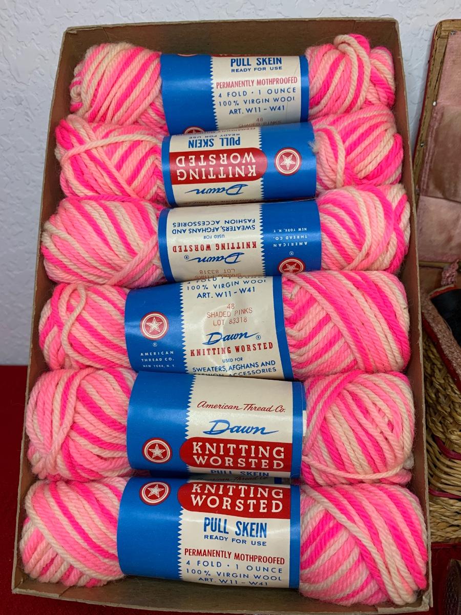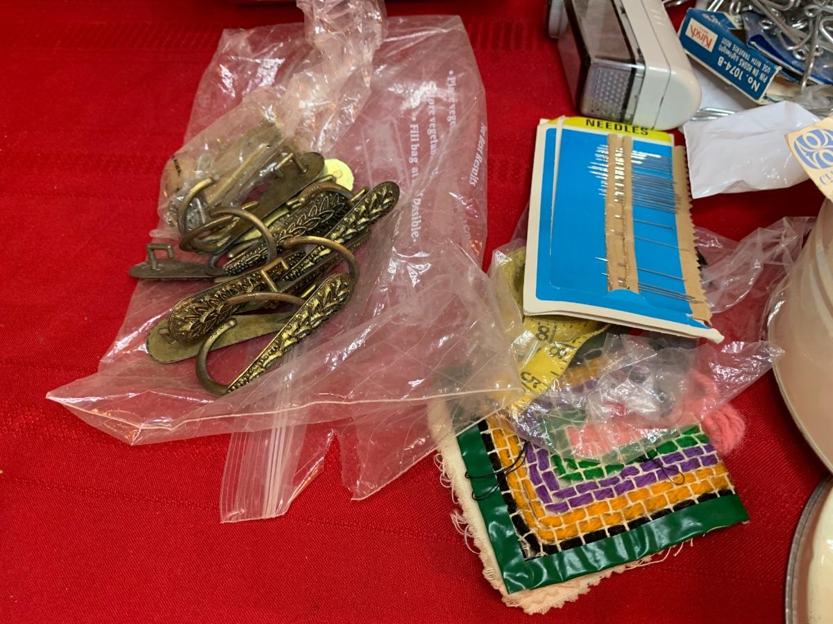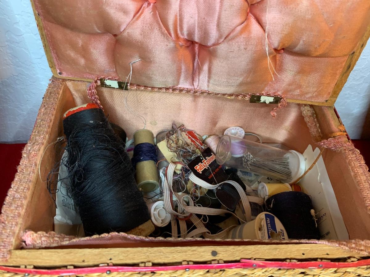Includes a wicker basket, two tins full of buttons, notions, and thread, drapery clips and curtain rings, small skeins of worsted yarn by Dawn Knitting, a sweater shaver and more.