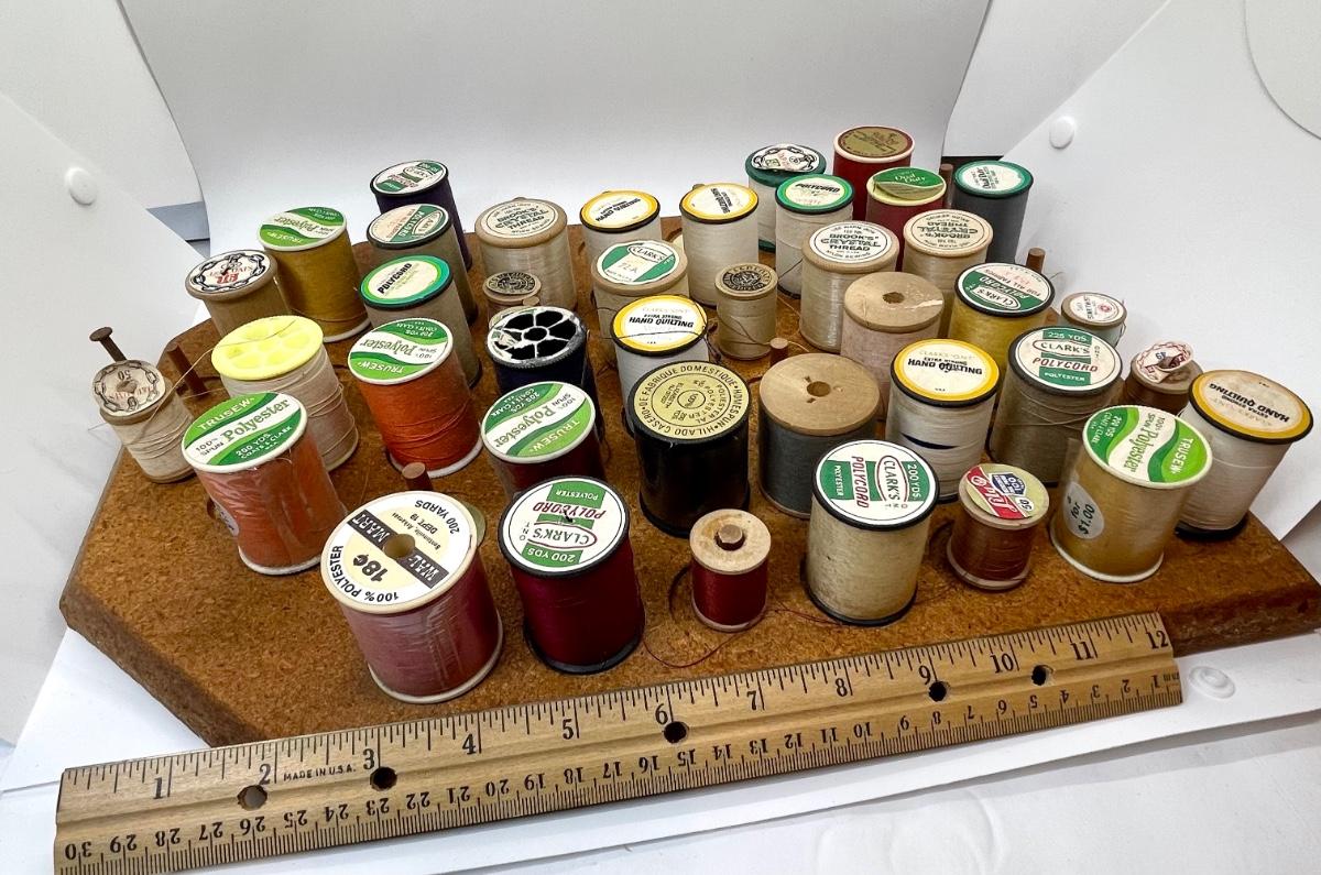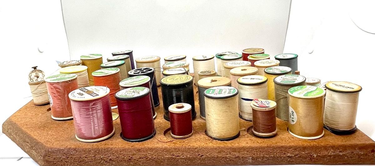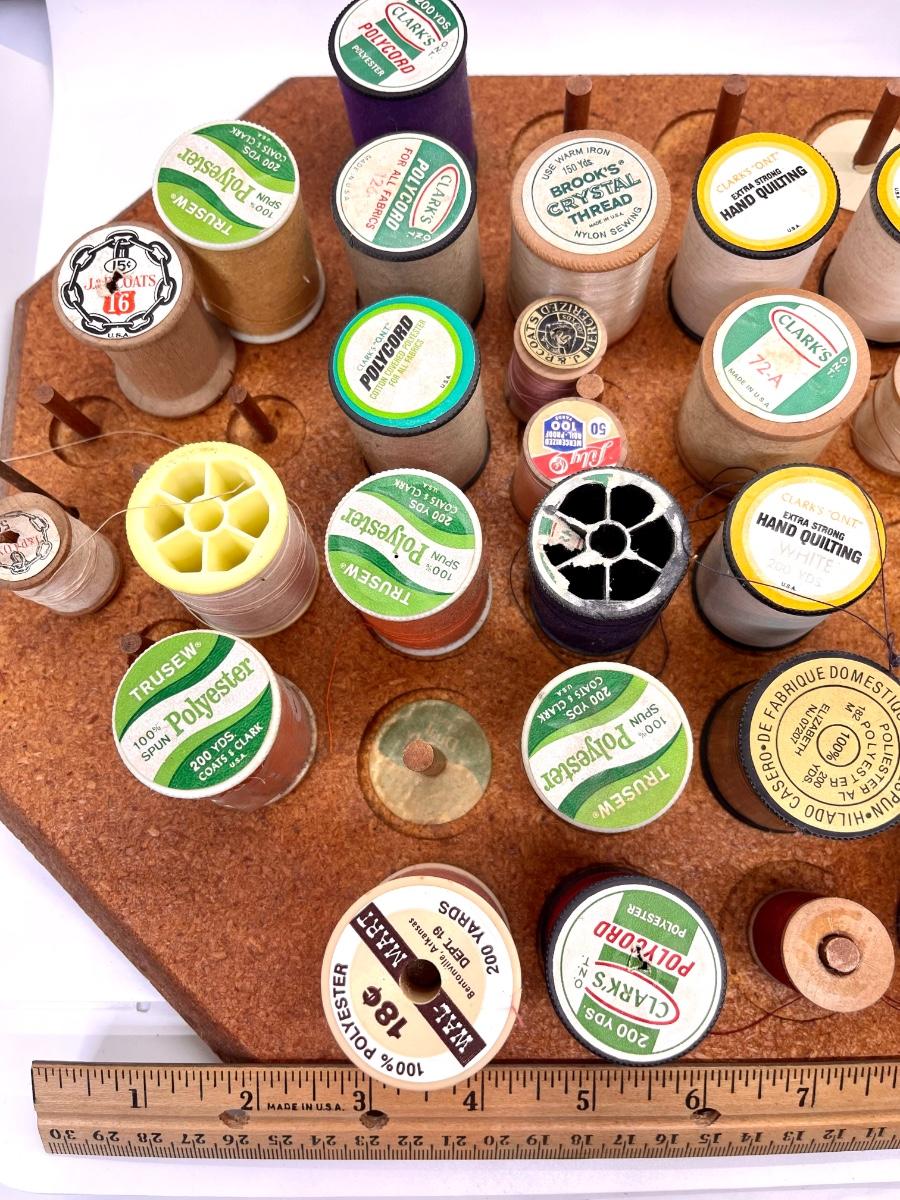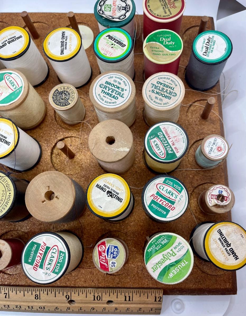 Lots of spools to keep a seamstress happy! Neat holder. Other sewing lots also listed.