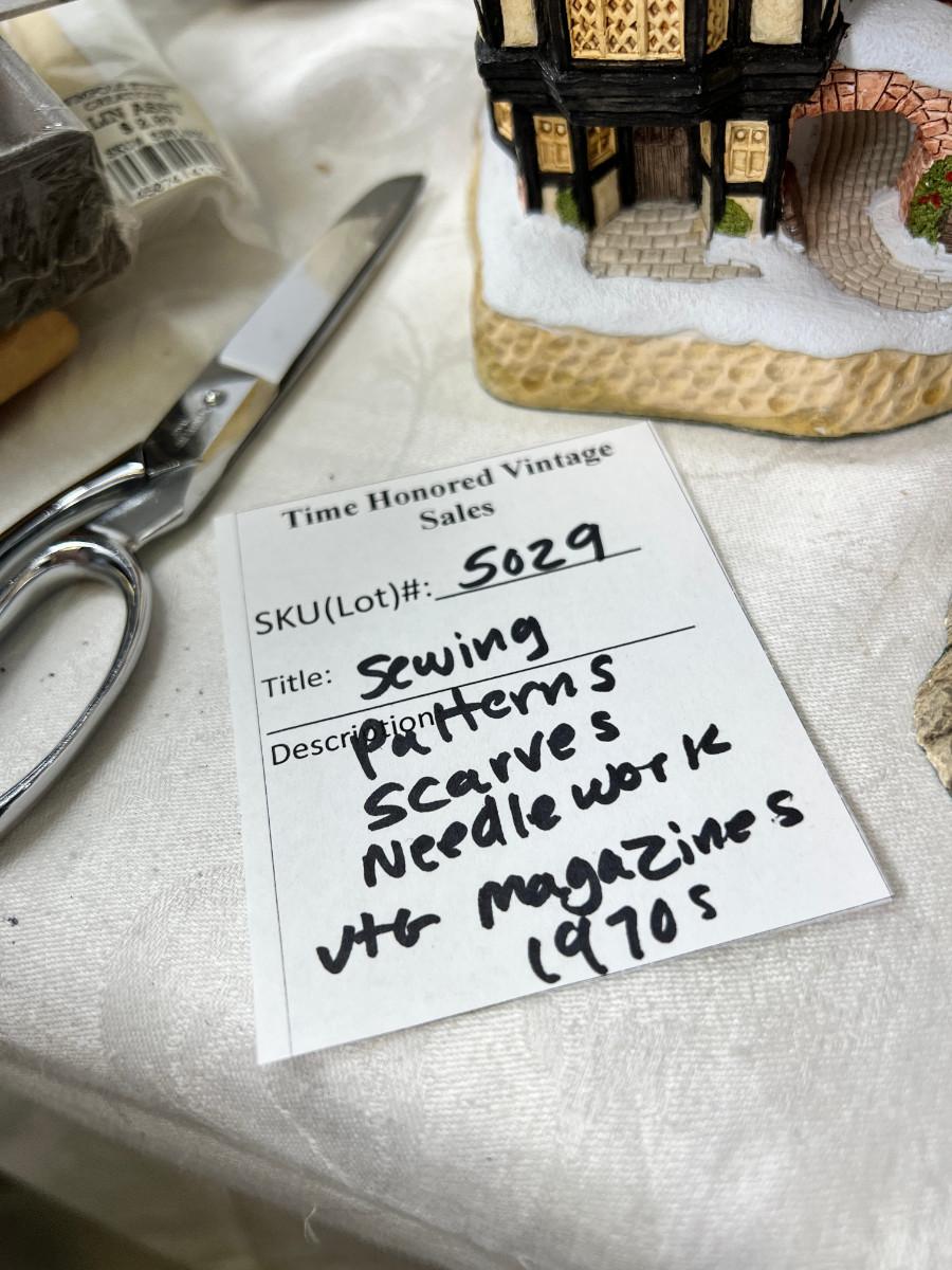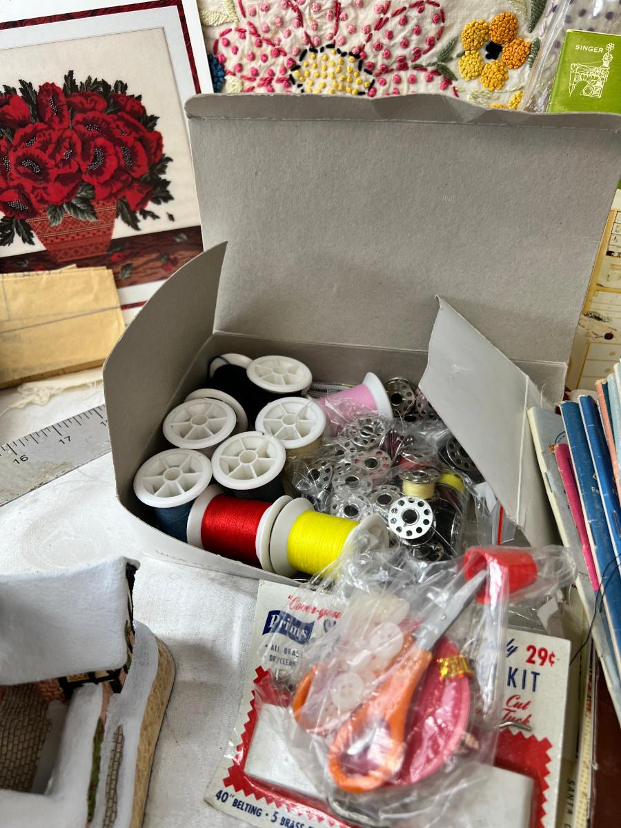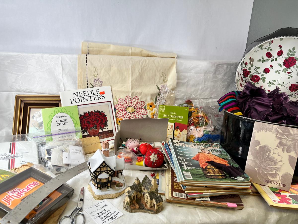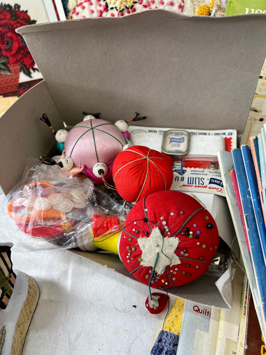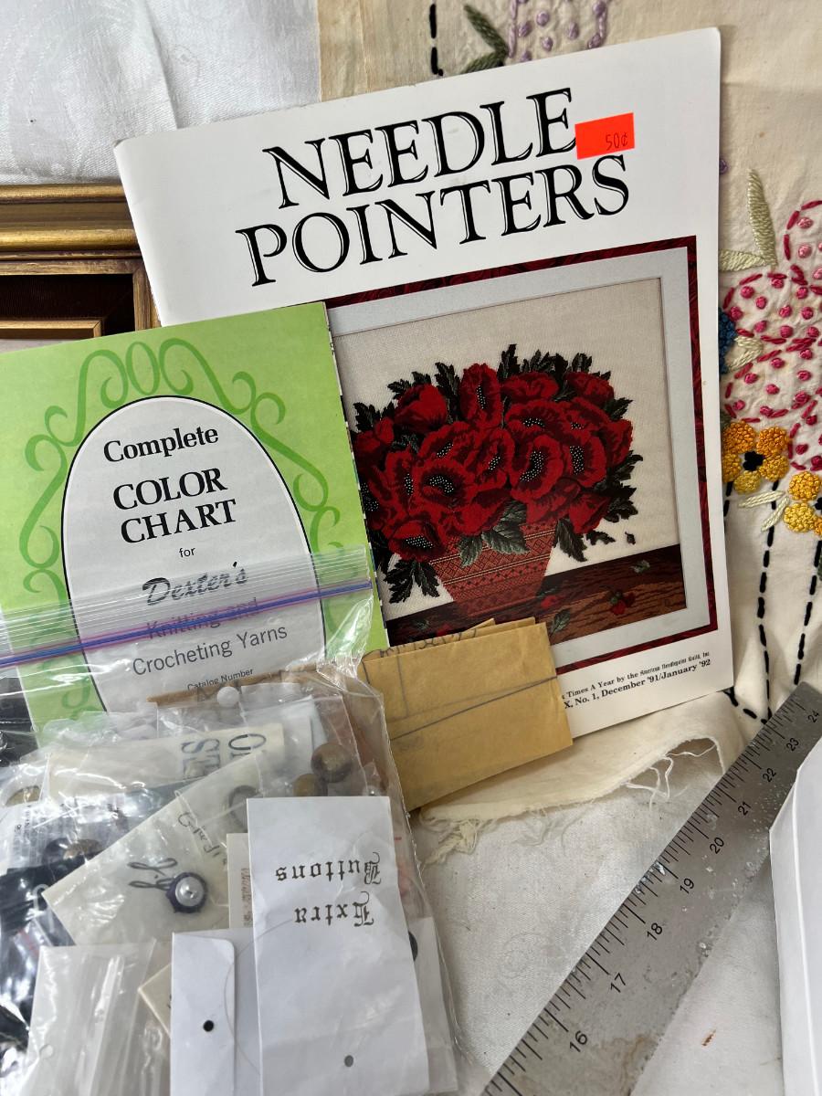 Sewing lot, scissors, vintage sewing magazines, scarves, hat box, Fairgate ruler, pin cushions, buttons. American patterns book. hand done needle work .