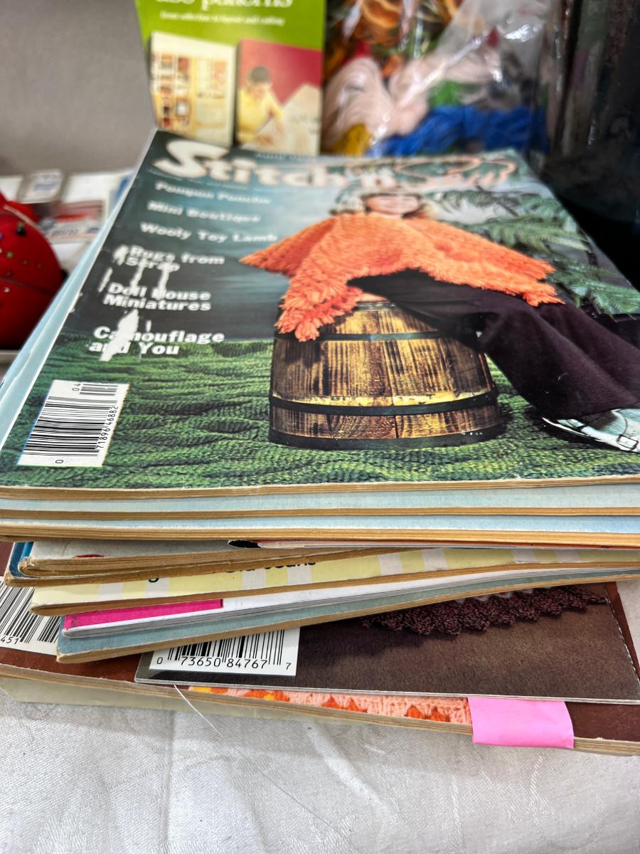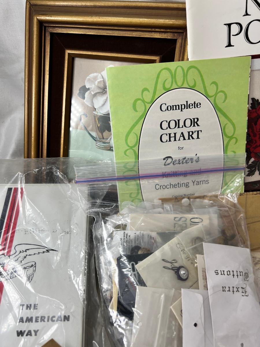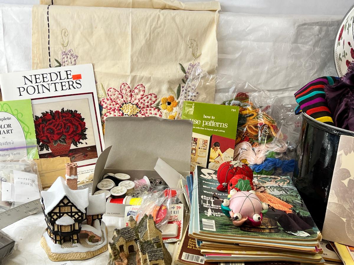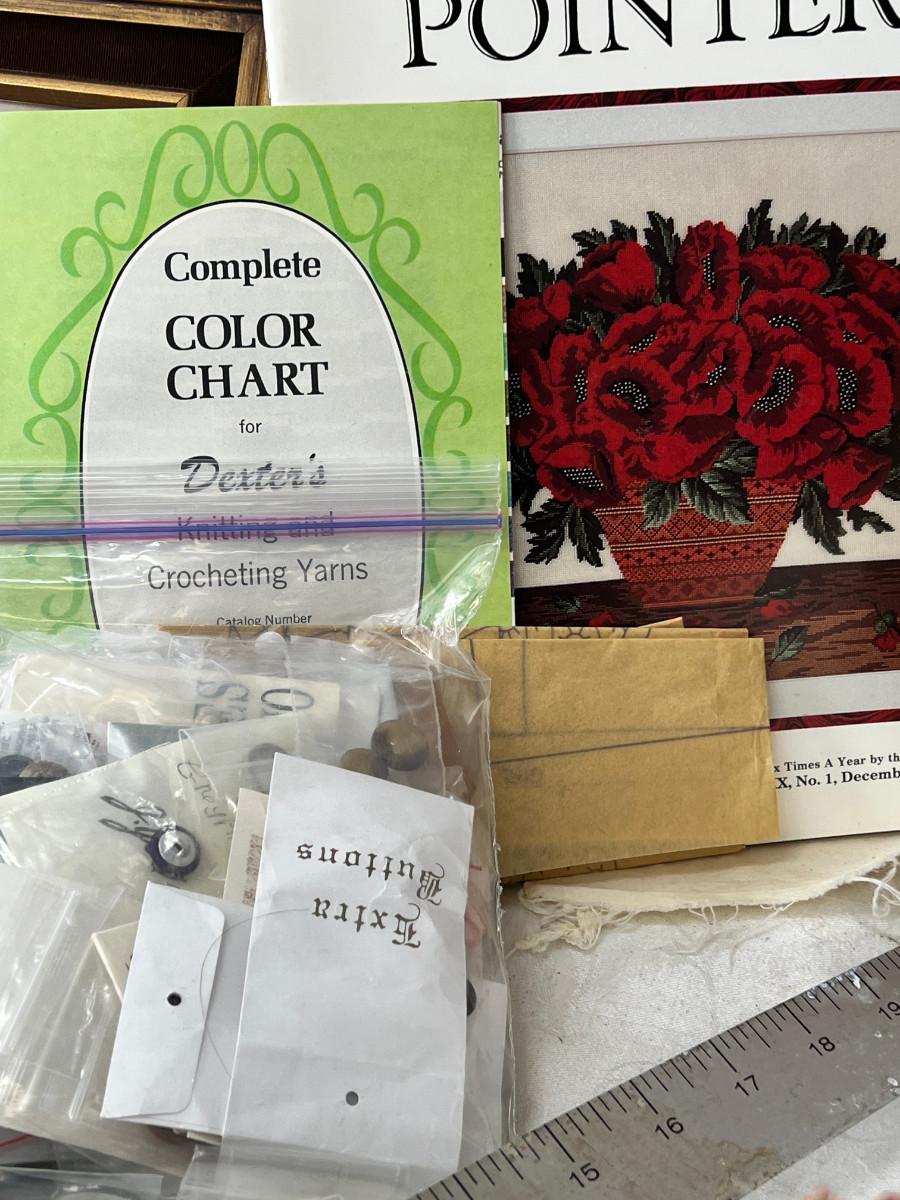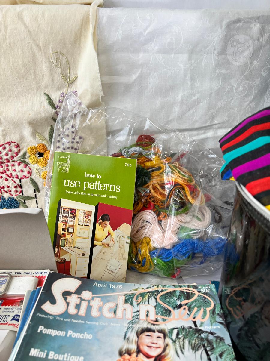 Sewing lot, scissors, vintage sewing magazines, scarves, hat box, Fairgate ruler, pin cushions, buttons. American patterns book. hand done needle work .