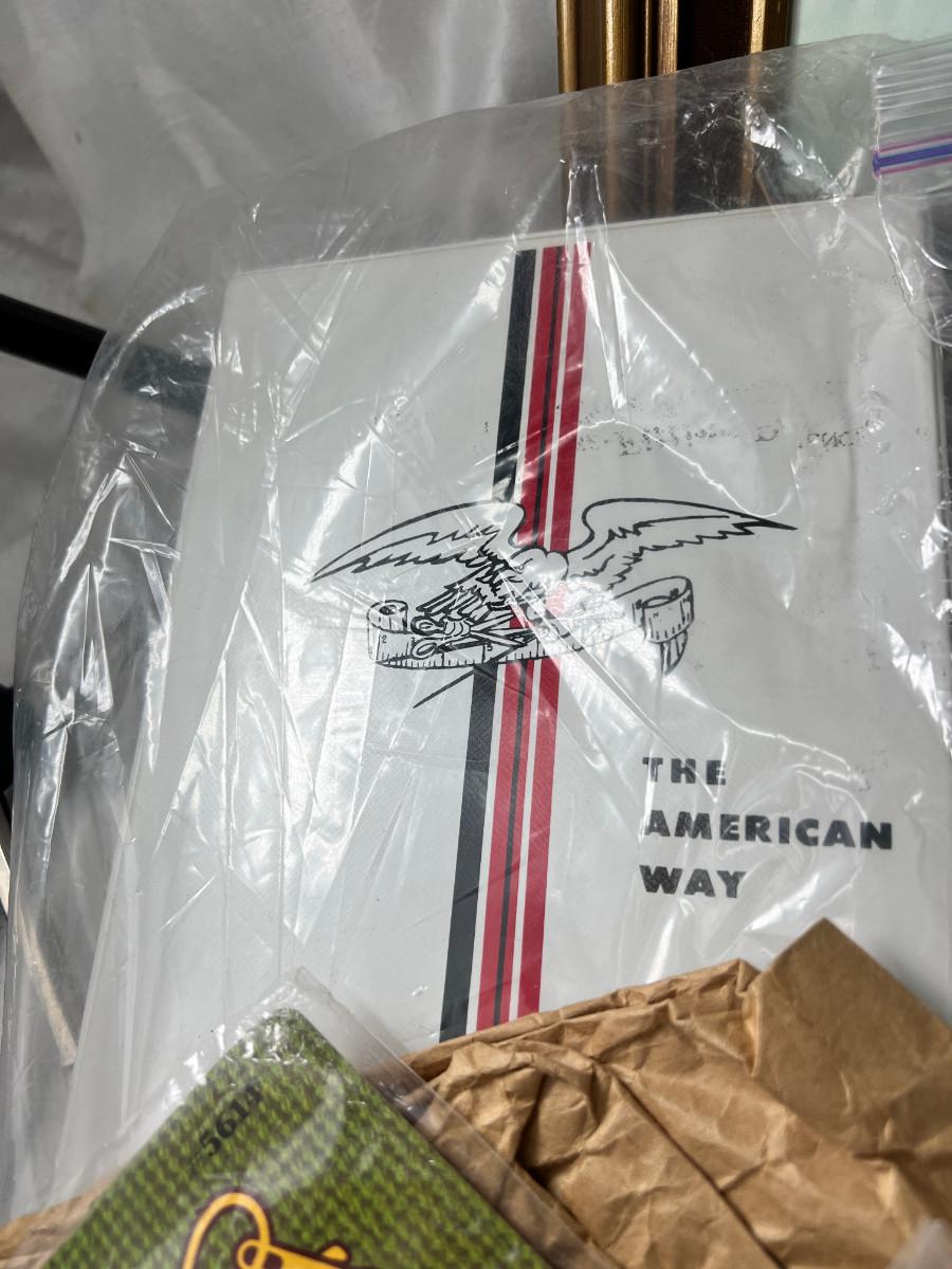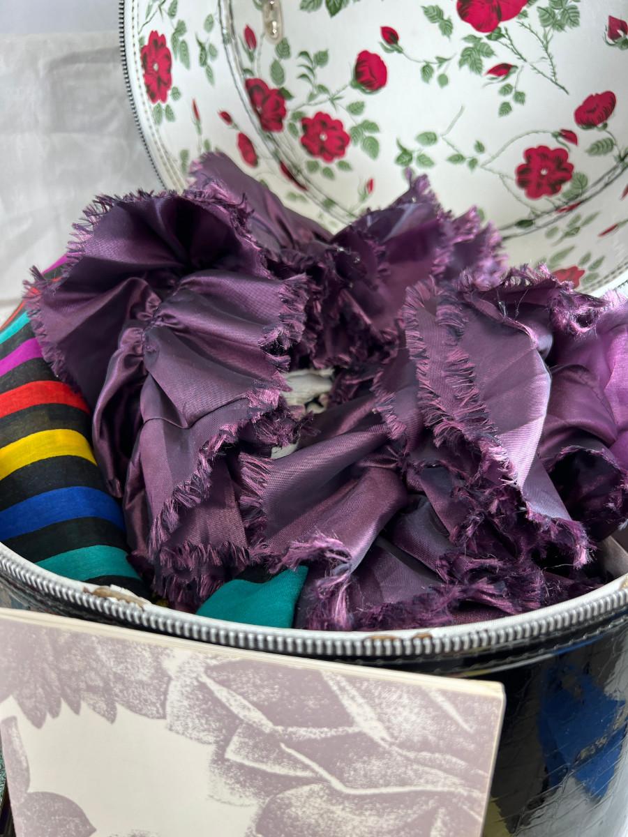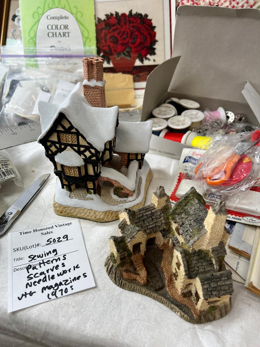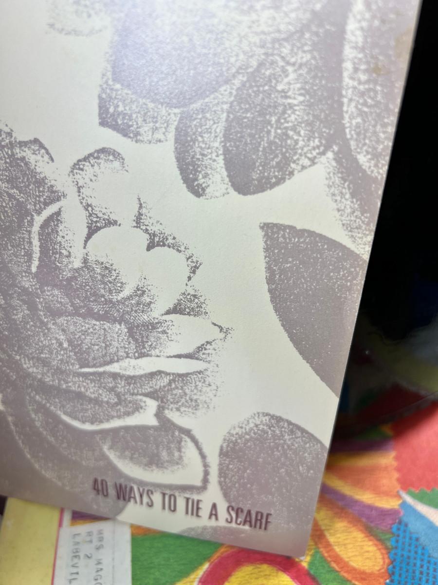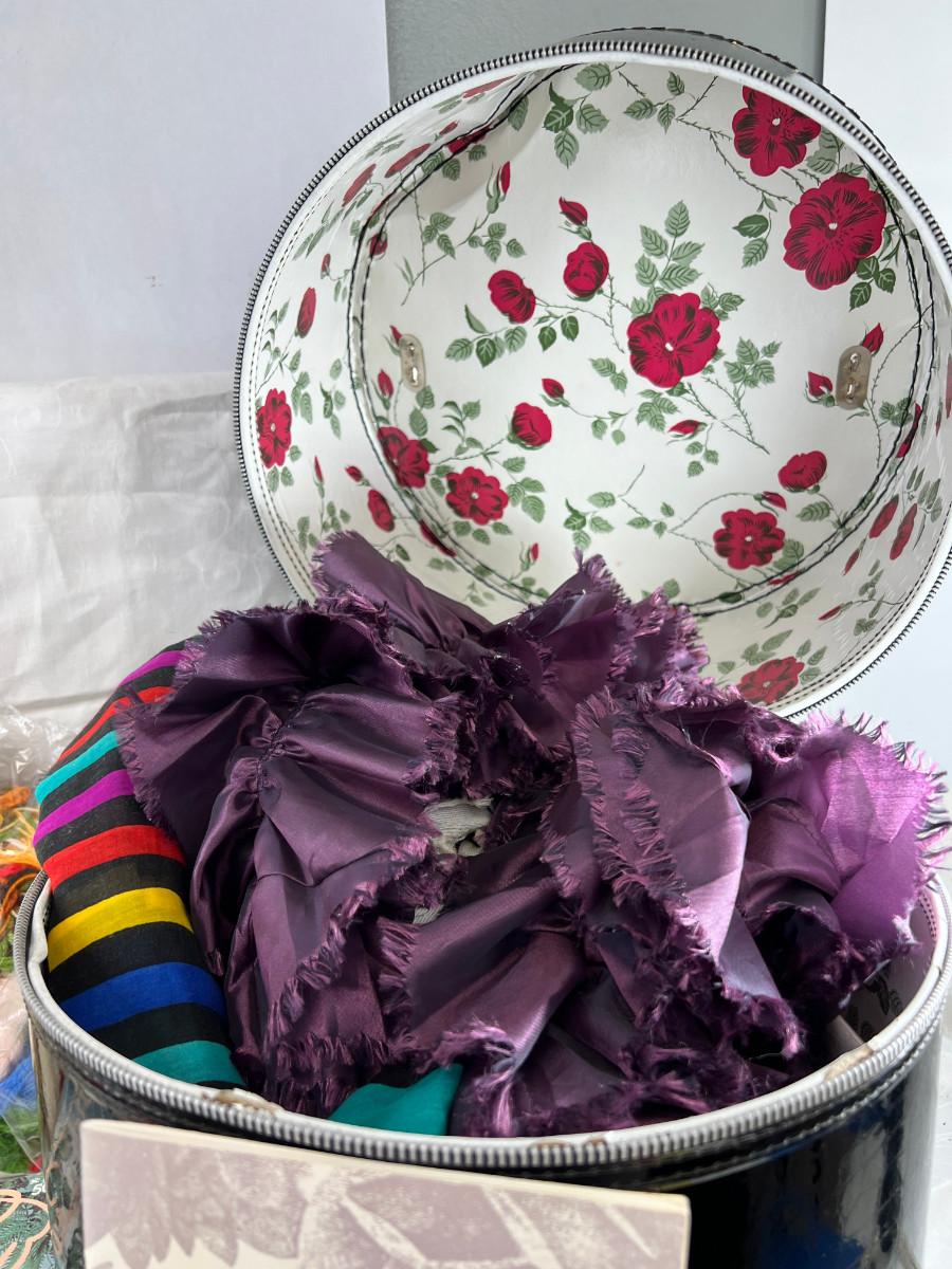 Sewing lot, scissors, vintage sewing magazines, scarves, hat box, Fairgate ruler, pin cushions, buttons. American patterns book. hand done needle work .