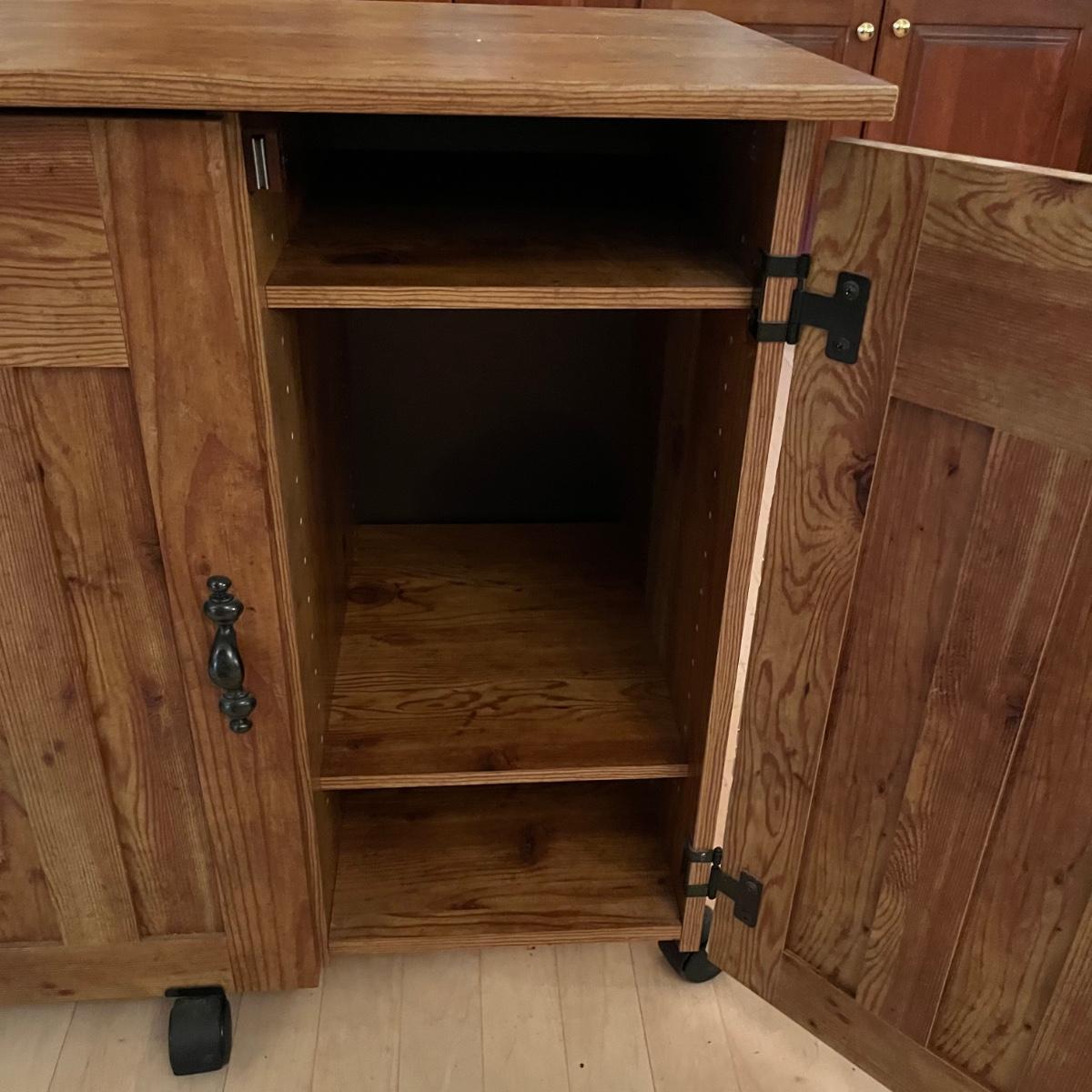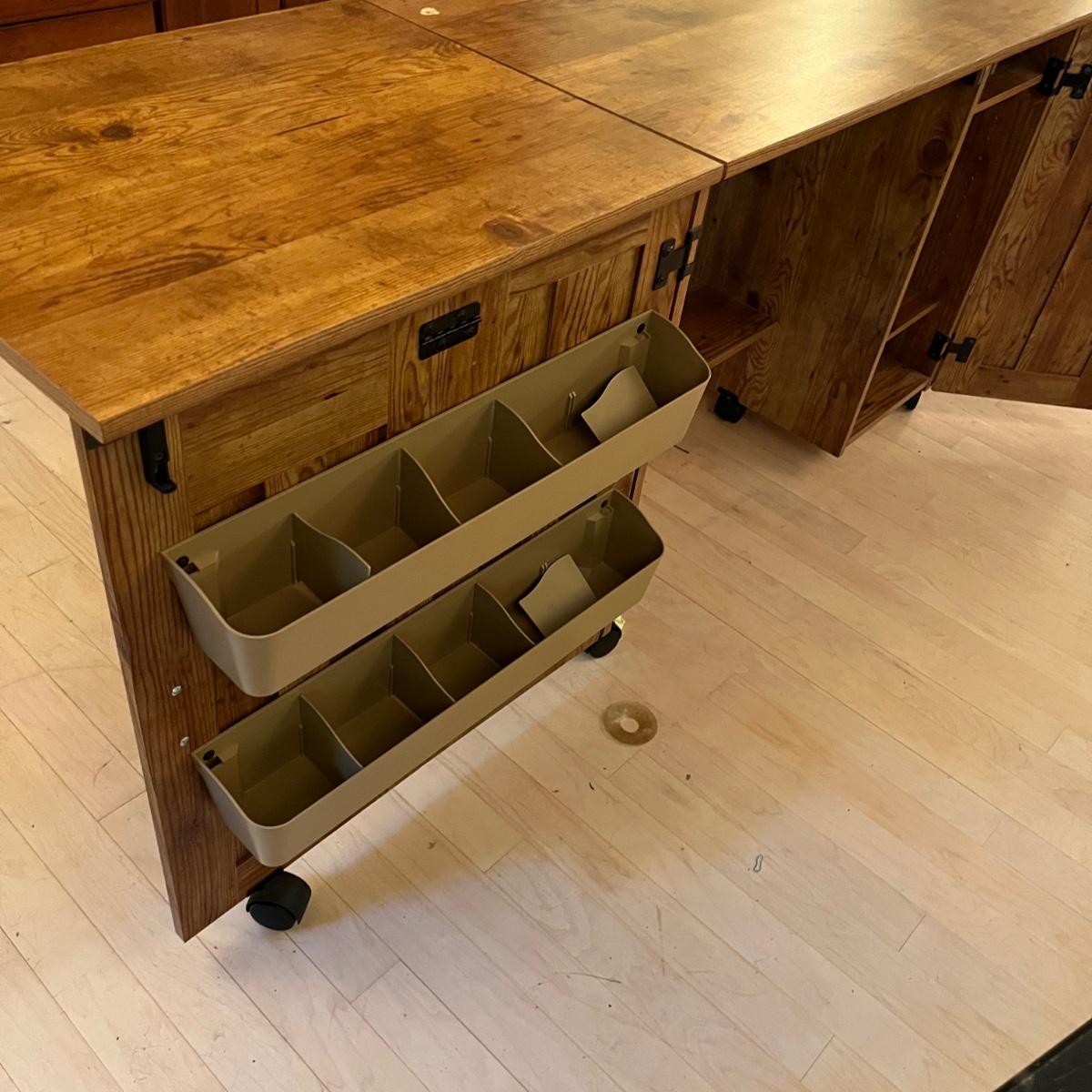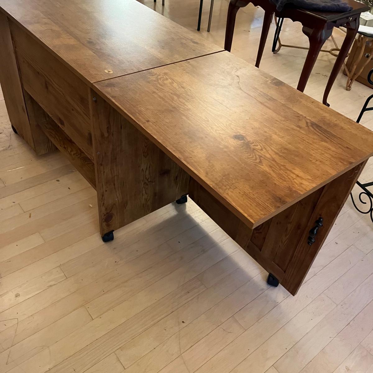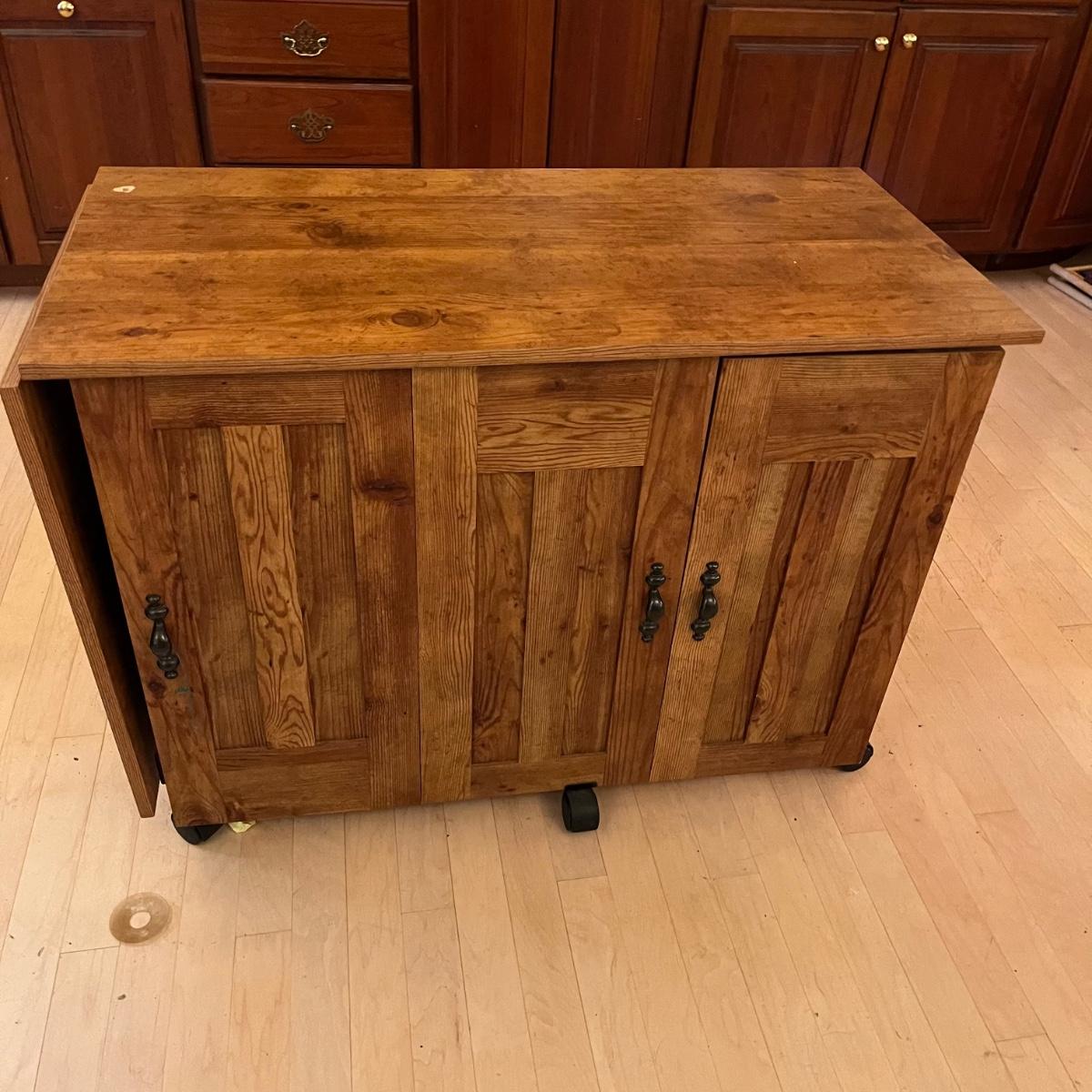 Lot includes a sewing machine cabinet with two adjustable shelves and two plastic bins inside and a extension on one end and has plastic black wheels on bottom. Cabinet is pressed wood and has a blemish on top, see pictures. Cabinet measures 19.5” x 39.5” x 28.5” when extension is down and 19.5” x 62” x 28.5” when extension is open.