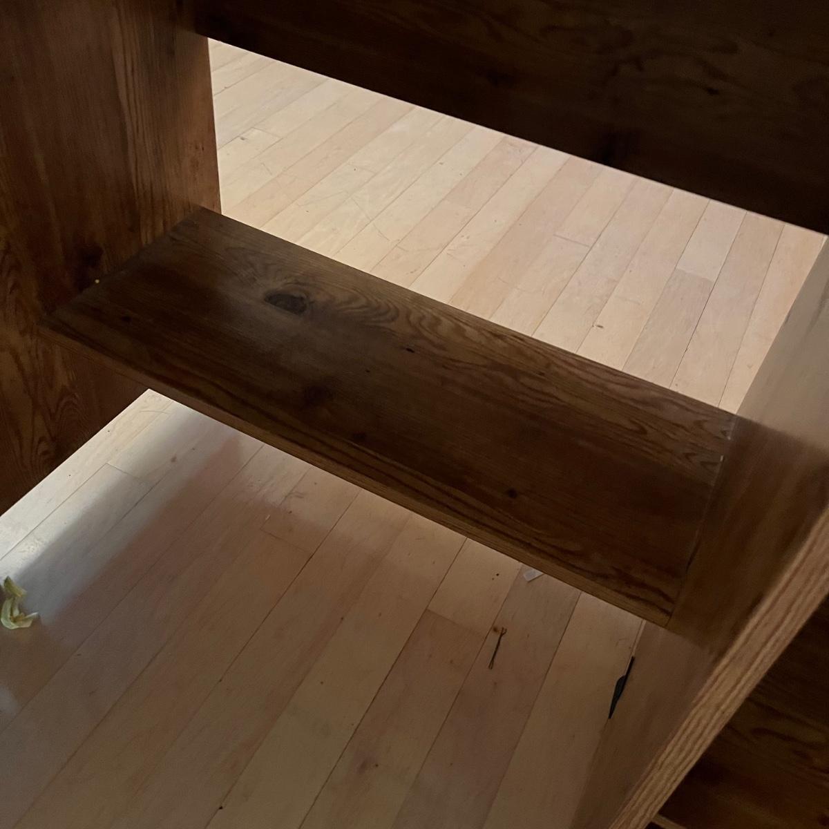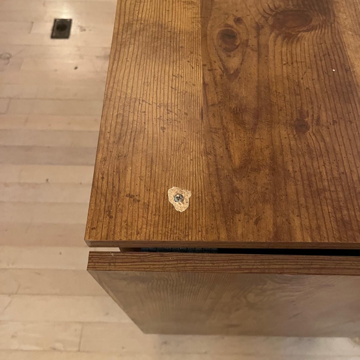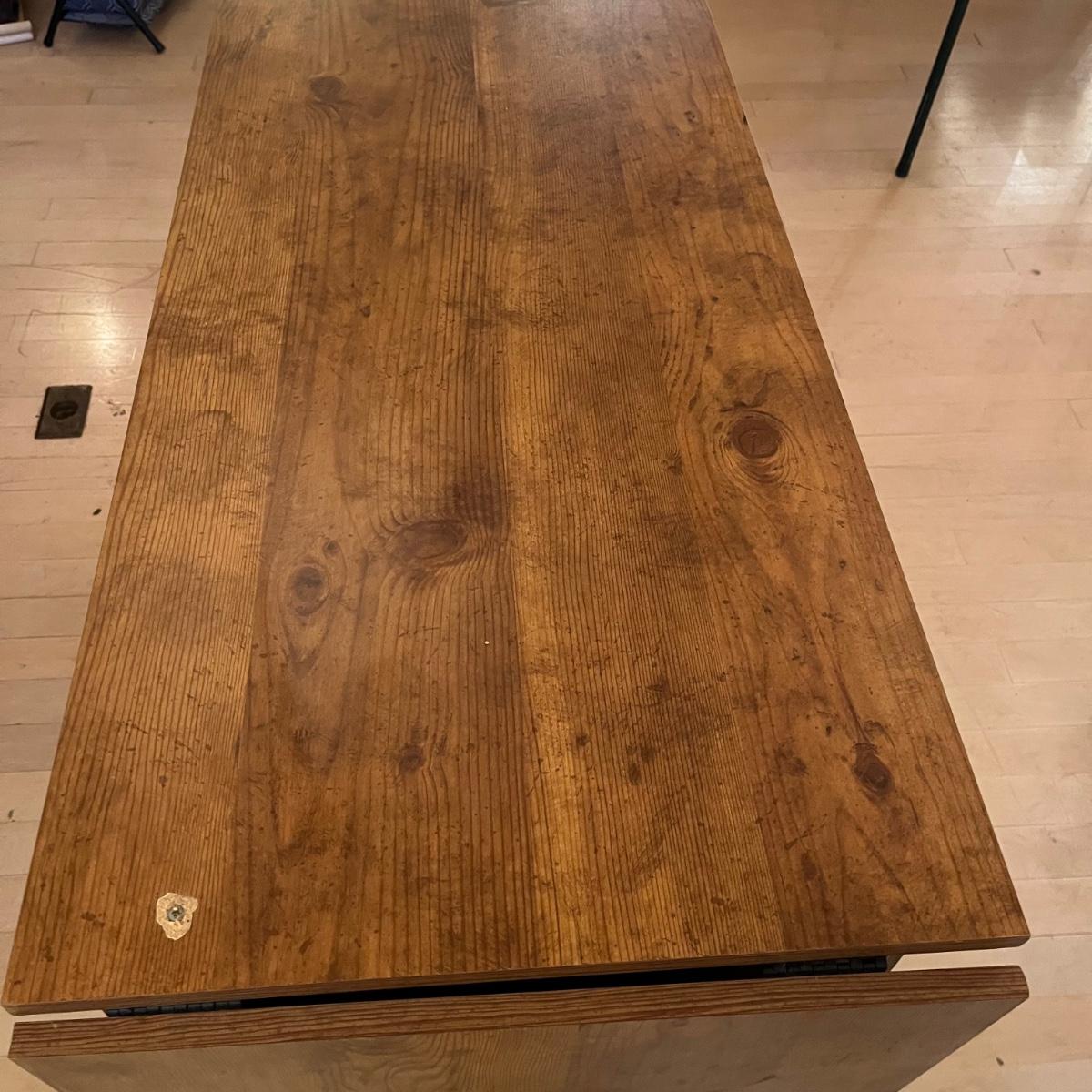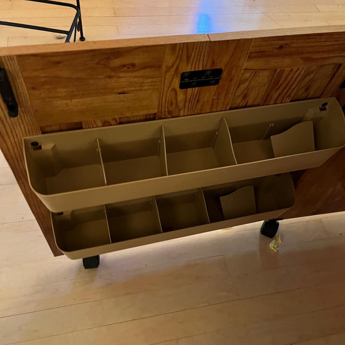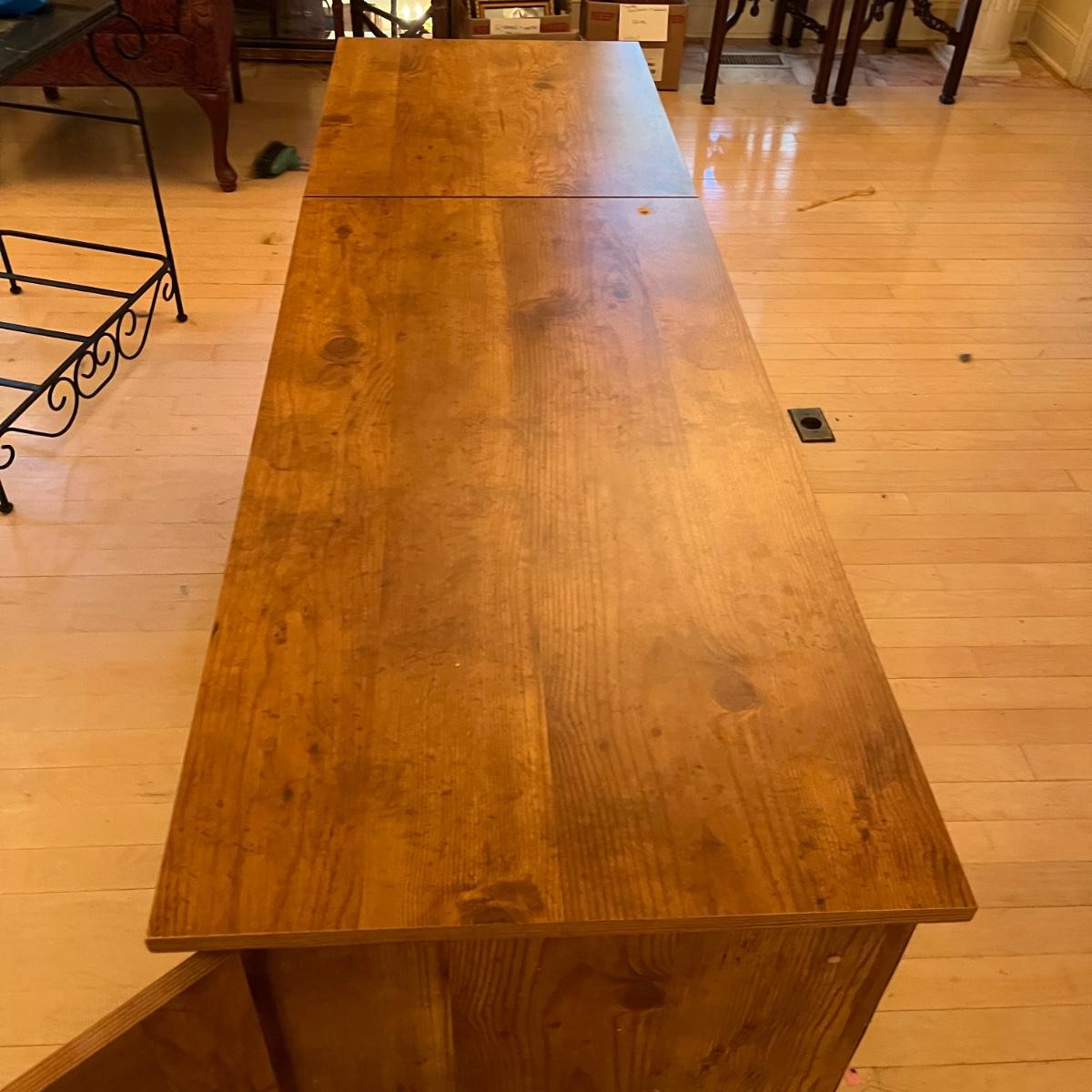 Lot includes a sewing machine cabinet with two adjustable shelves and two plastic bins inside and a extension on one end and has plastic black wheels on bottom. Cabinet is pressed wood and has a blemish on top, see pictures. Cabinet measures 19.5” x 39.5” x 28.5” when extension is down and 19.5” x 62” x 28.5” when extension is open.