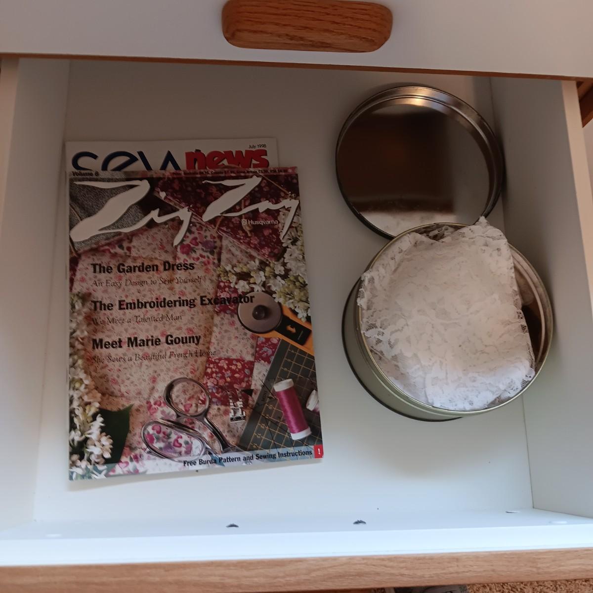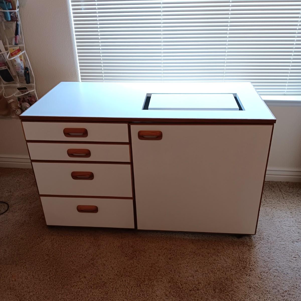 SEWING MACHINE CABINET ON CASTERS WITH VARIOUS NOTIONS