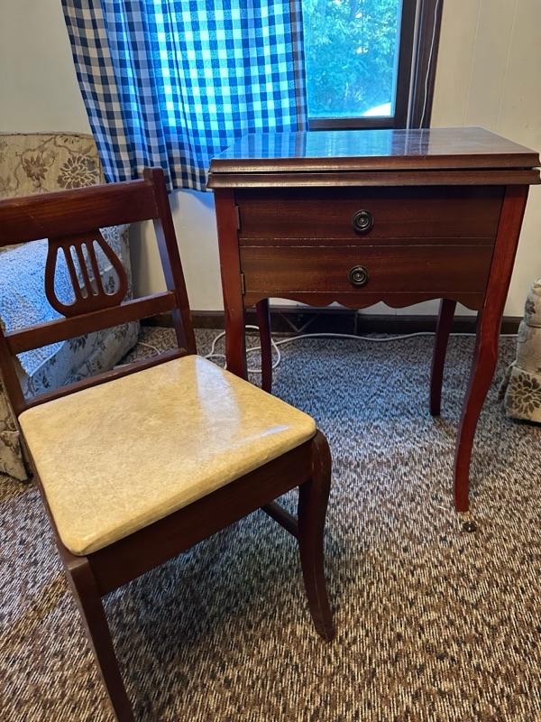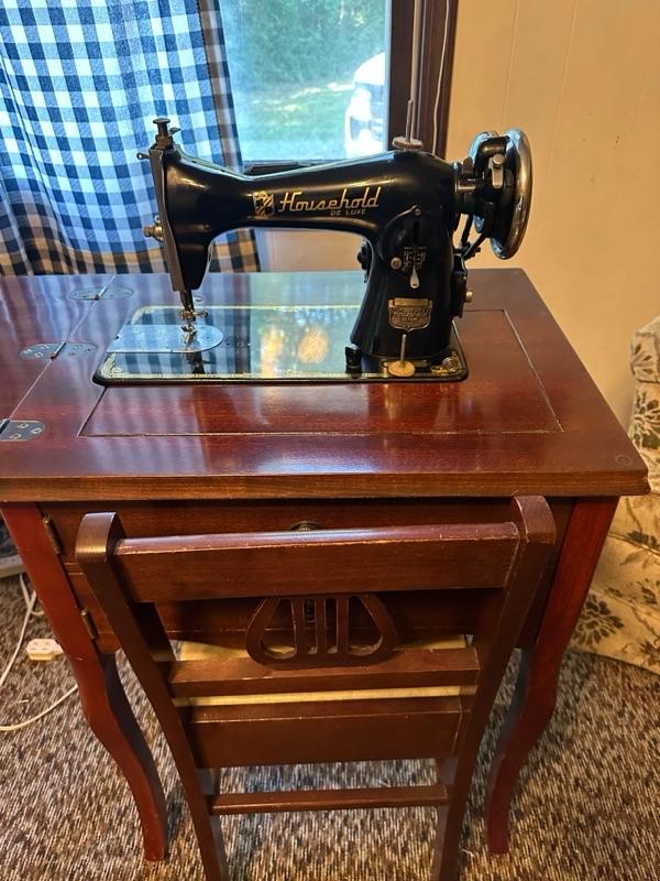 This is a Household Deluxe sewing machine has a nice cabinet with chair.