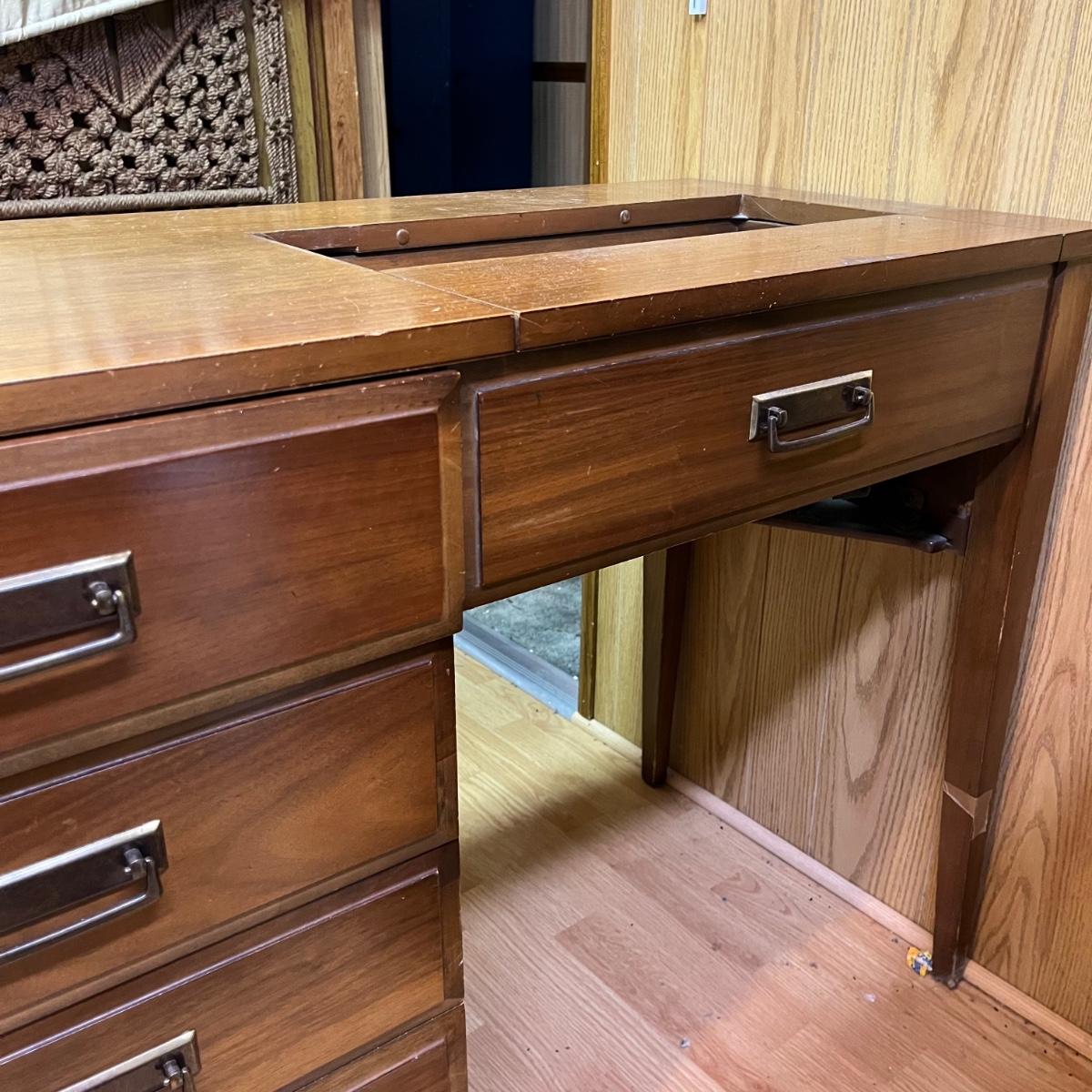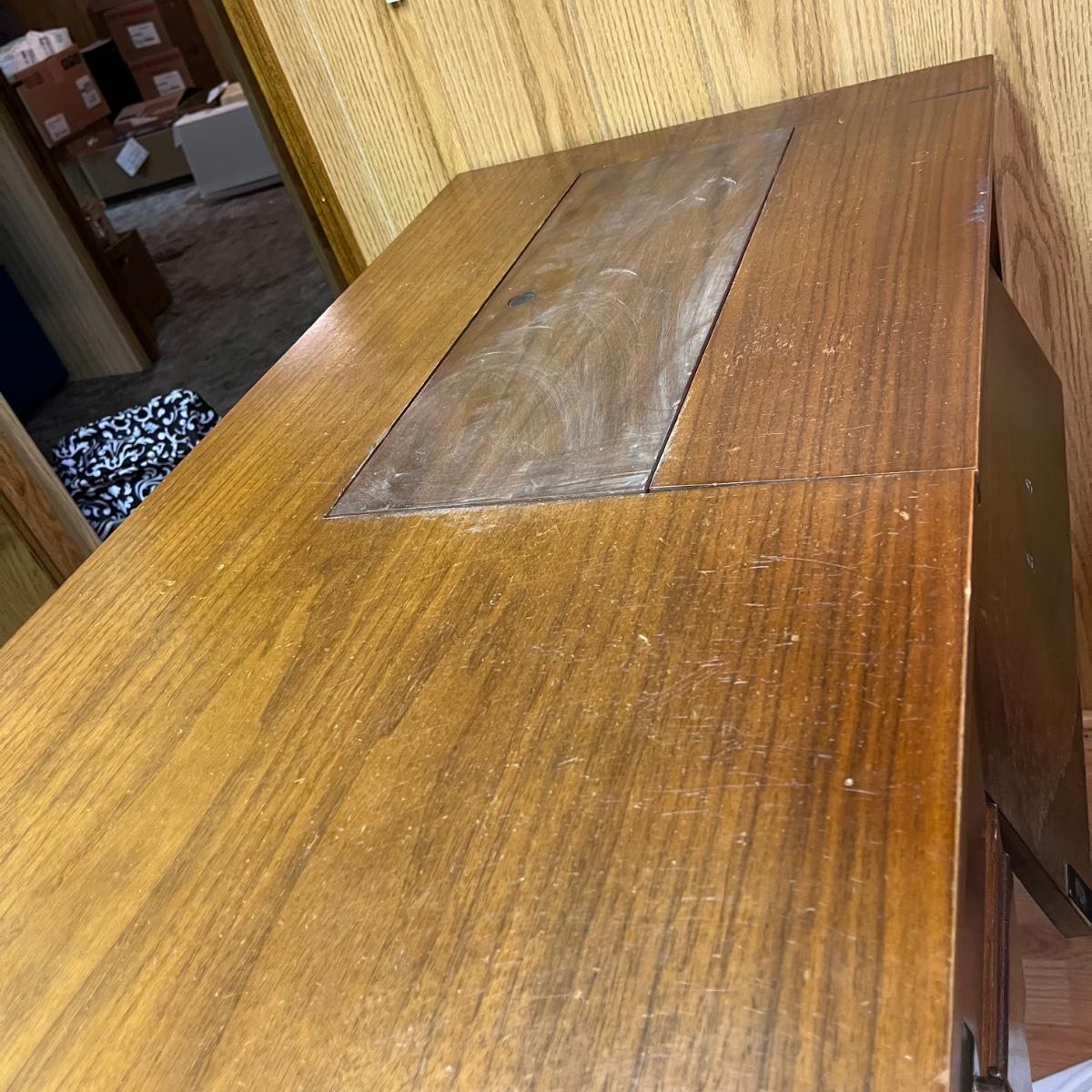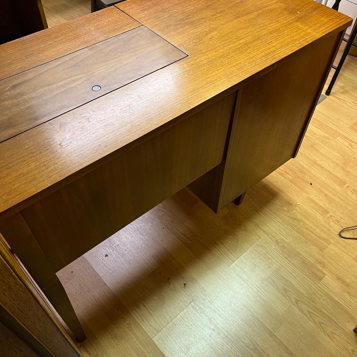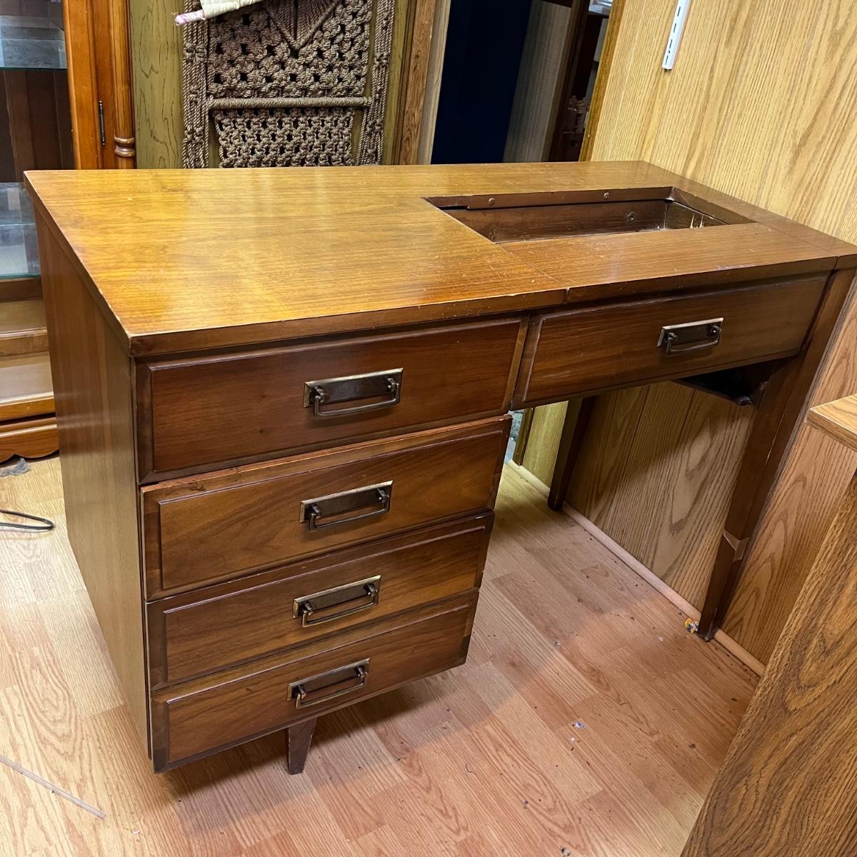 Lot includes a three dovetailed drawer sewing table that has a space for your sewing machine. Piece is made of wood with veneer. Table measures 19” x 42” x 30.5”.