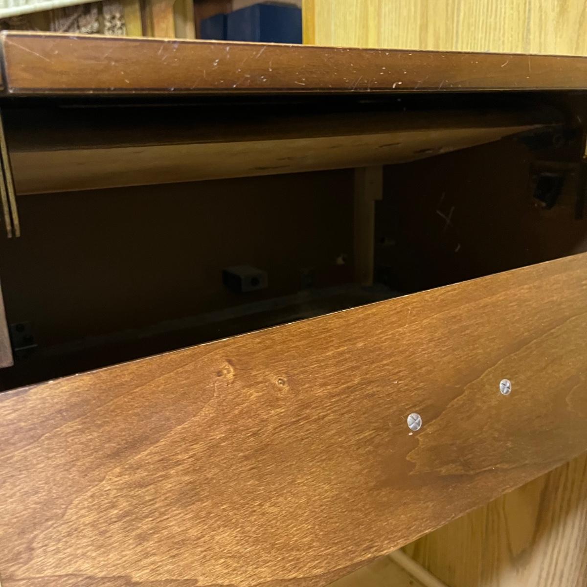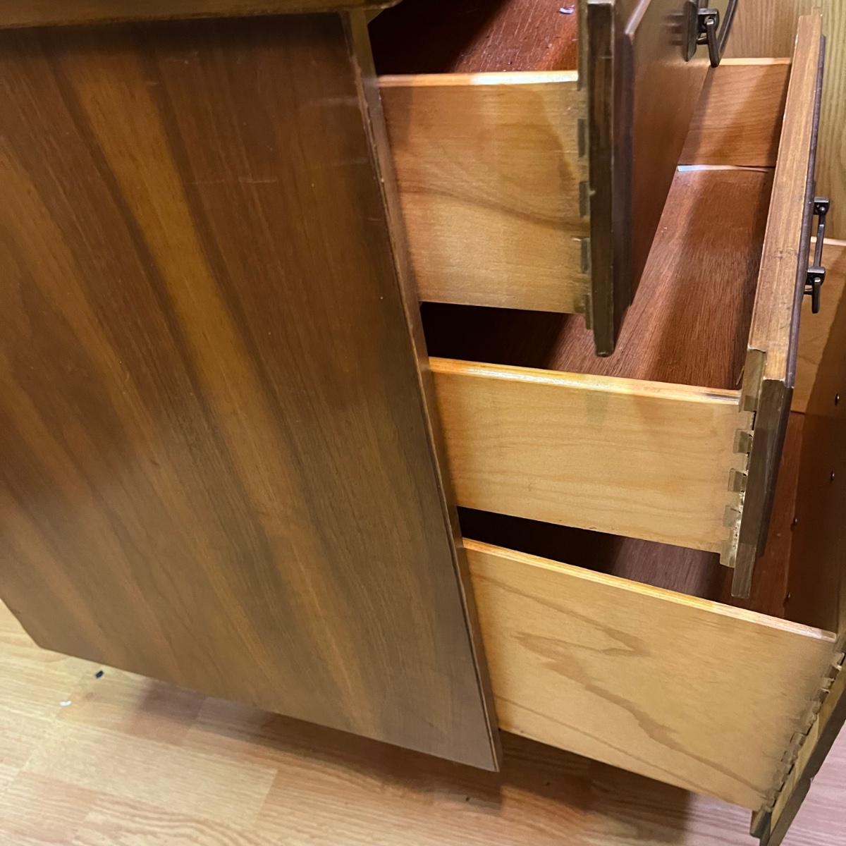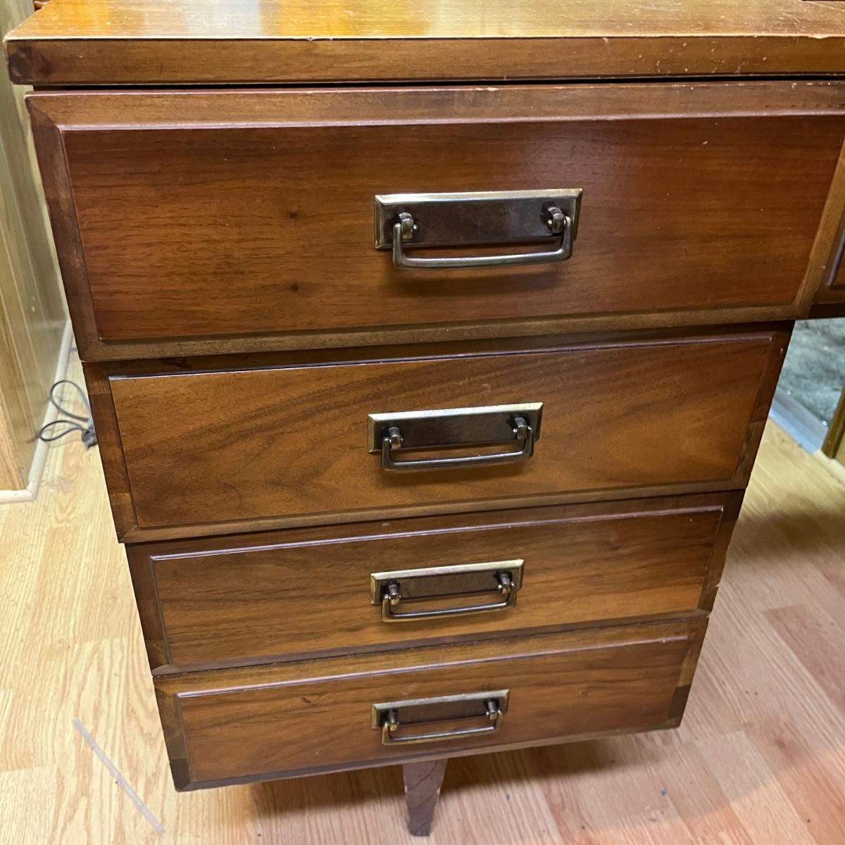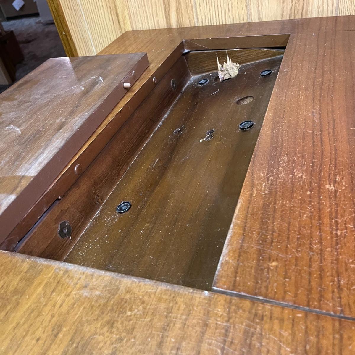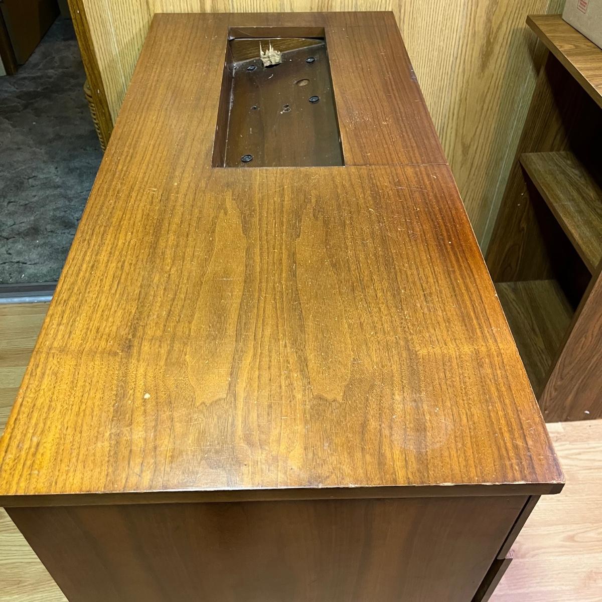 Lot includes a three dovetailed drawer sewing table that has a space for your sewing machine. Piece is made of wood with veneer. Table measures 19” x 42” x 30.5”.