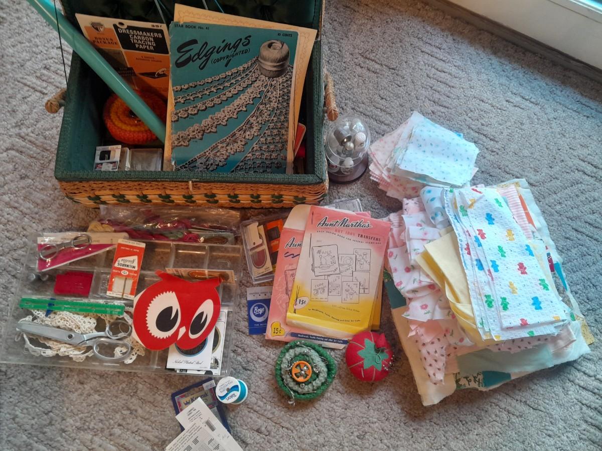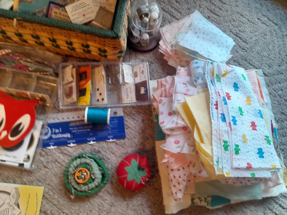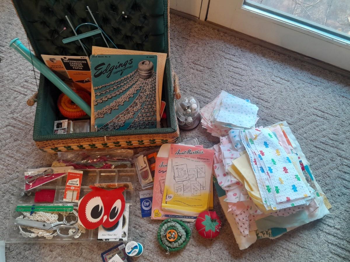 SEWING NEEDLES, PATTERNS, THREAD, FABRIC, SEWING BOX, AND MORE