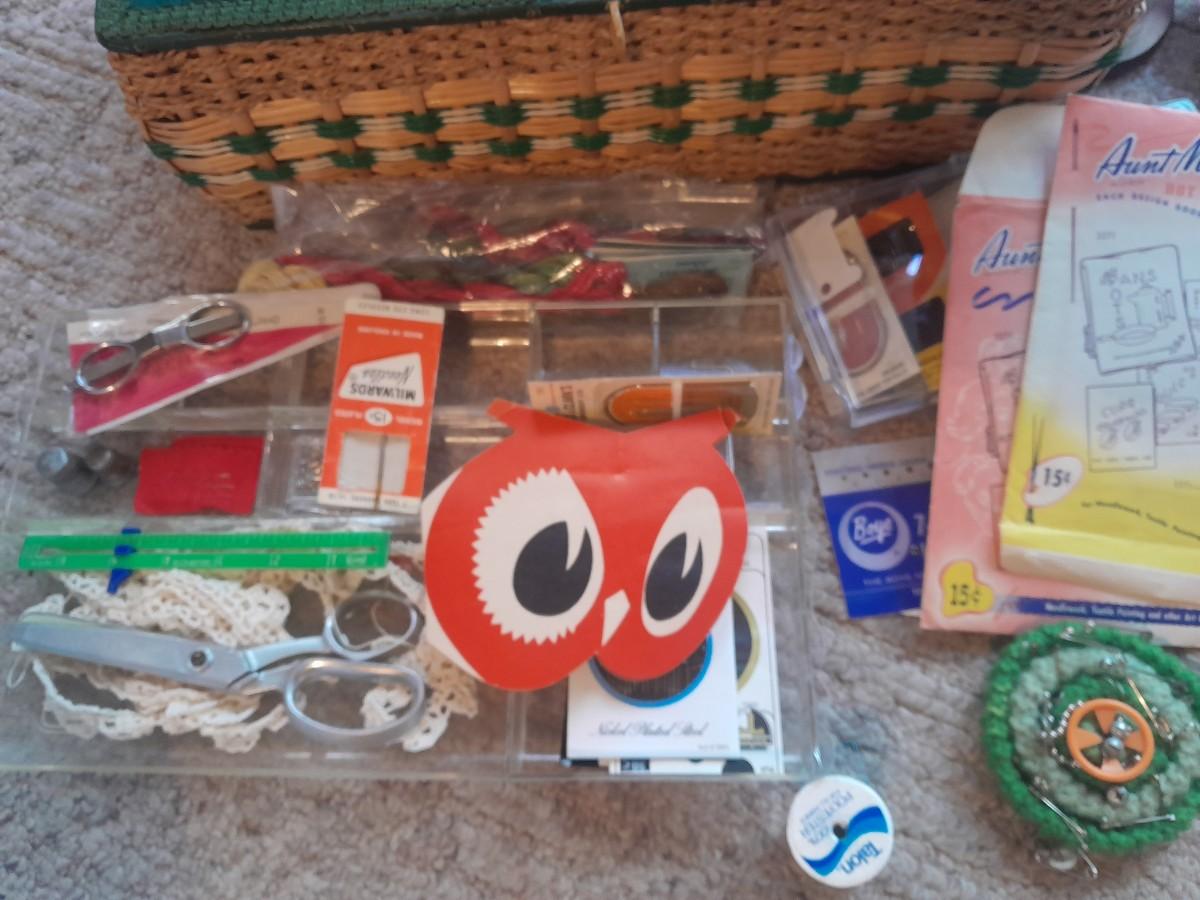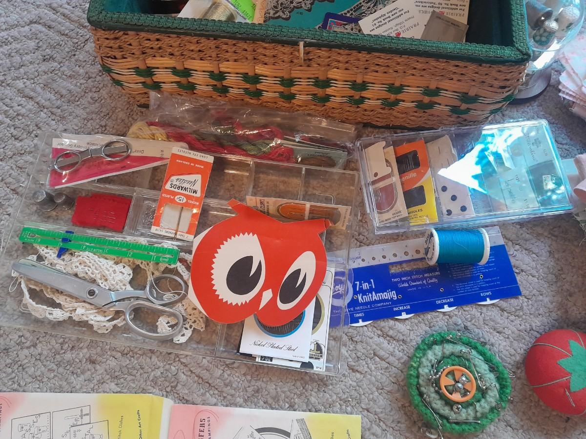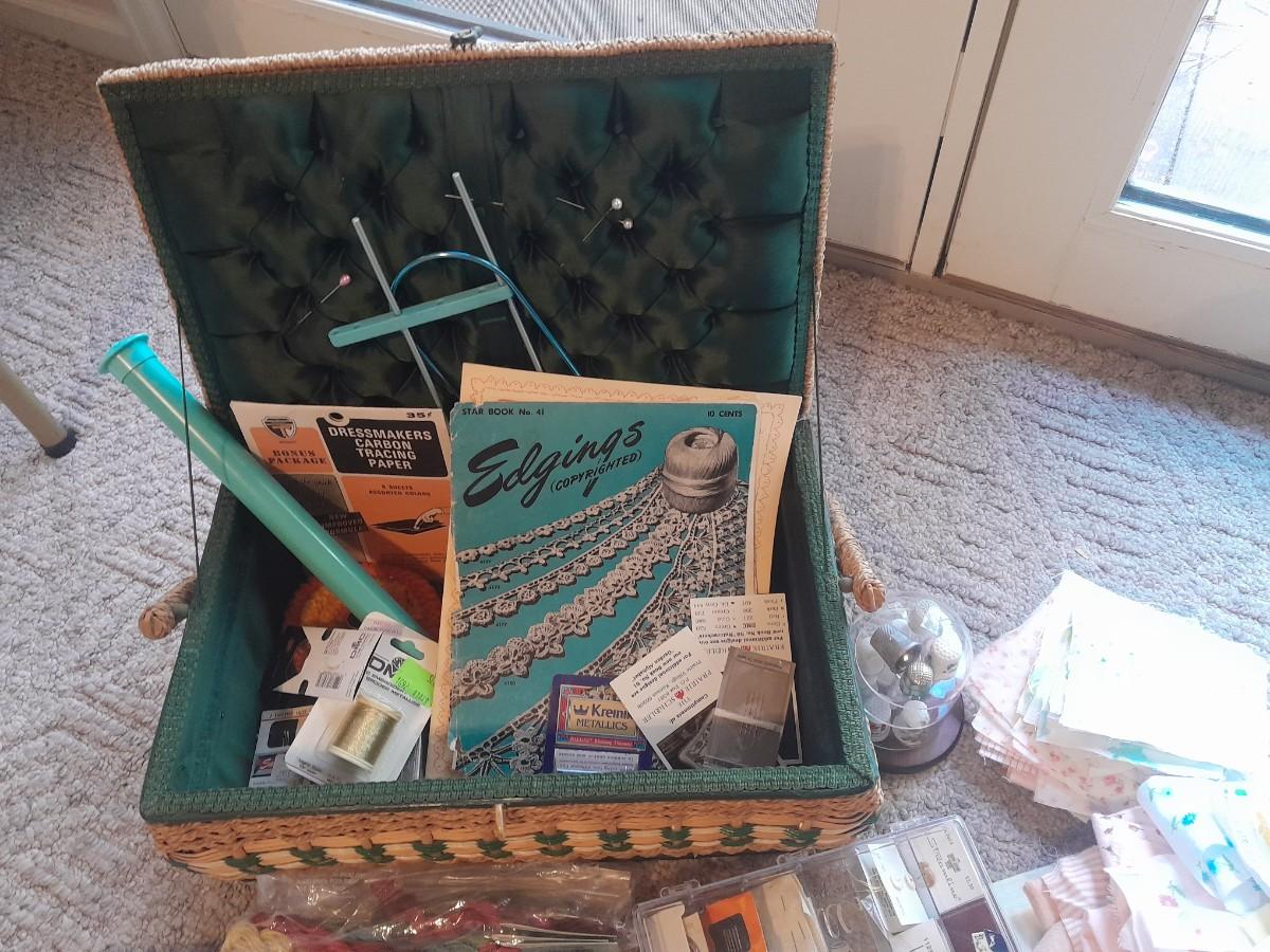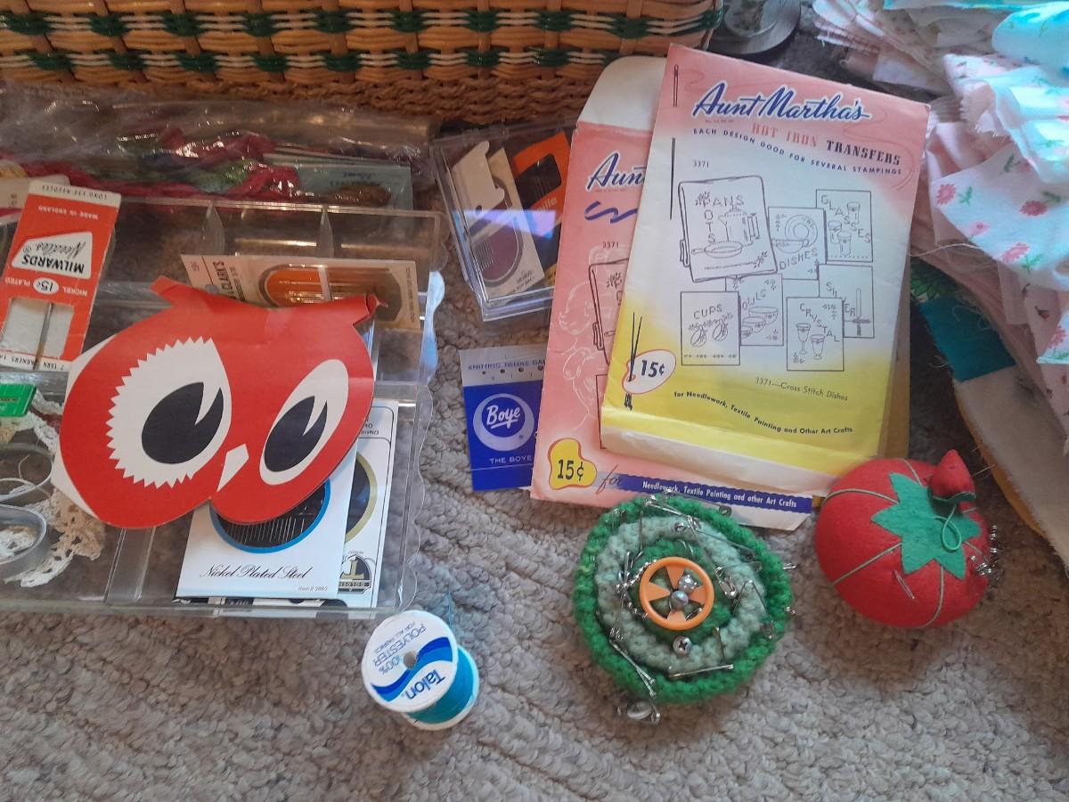 SEWING NEEDLES, PATTERNS, THREAD, FABRIC, SEWING BOX, AND MORE