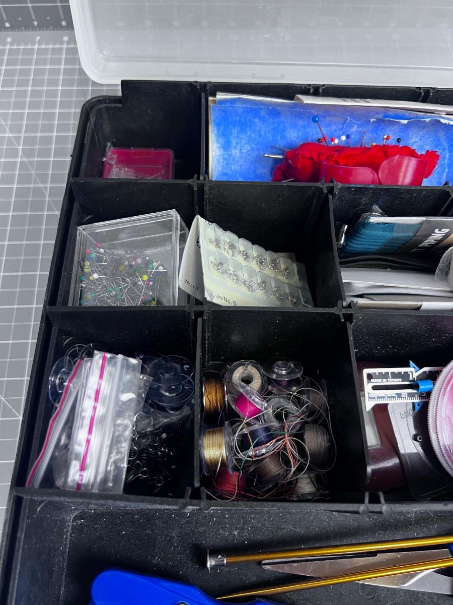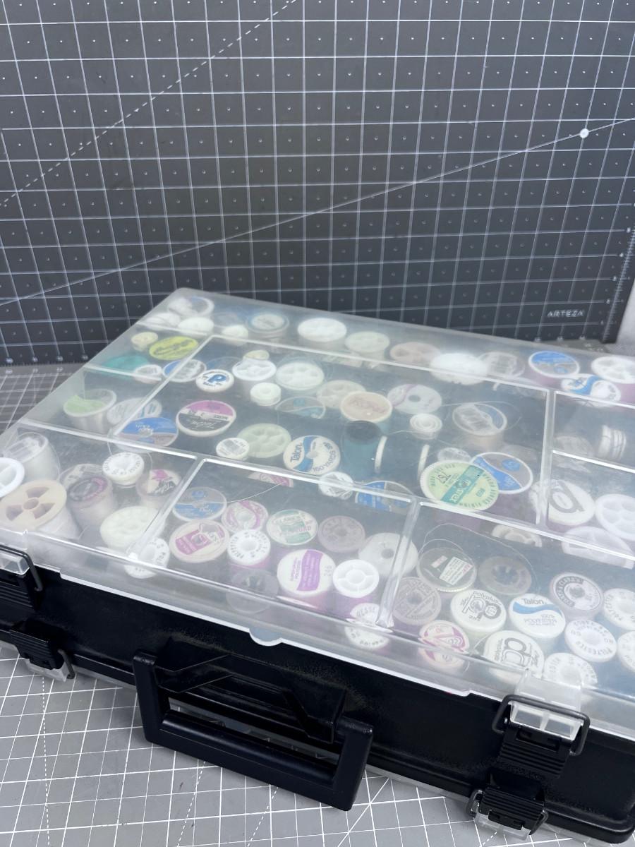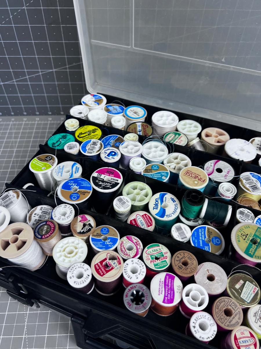 In a Little Tote. Tons of Thread on one side and bobbins, pins and needles on the other side. All Useful Sewing Items.