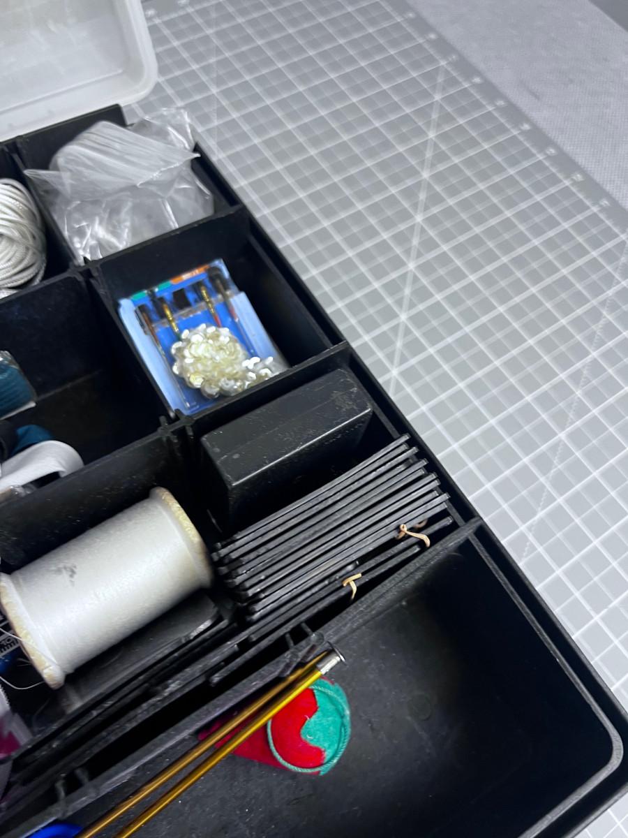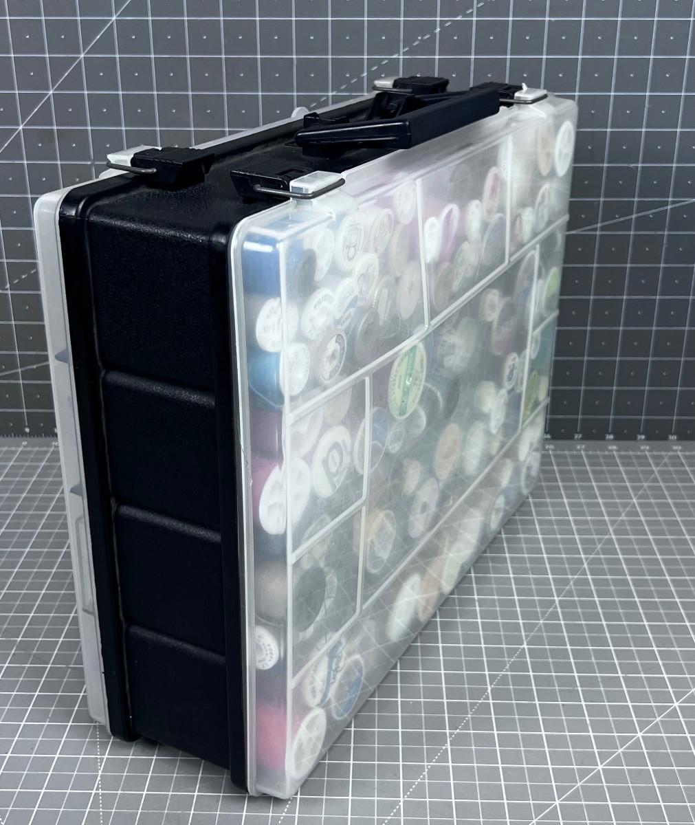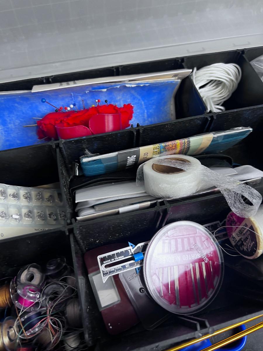 In a Little Tote. Tons of Thread on one side and bobbins, pins and needles on the other side. All Useful Sewing Items.