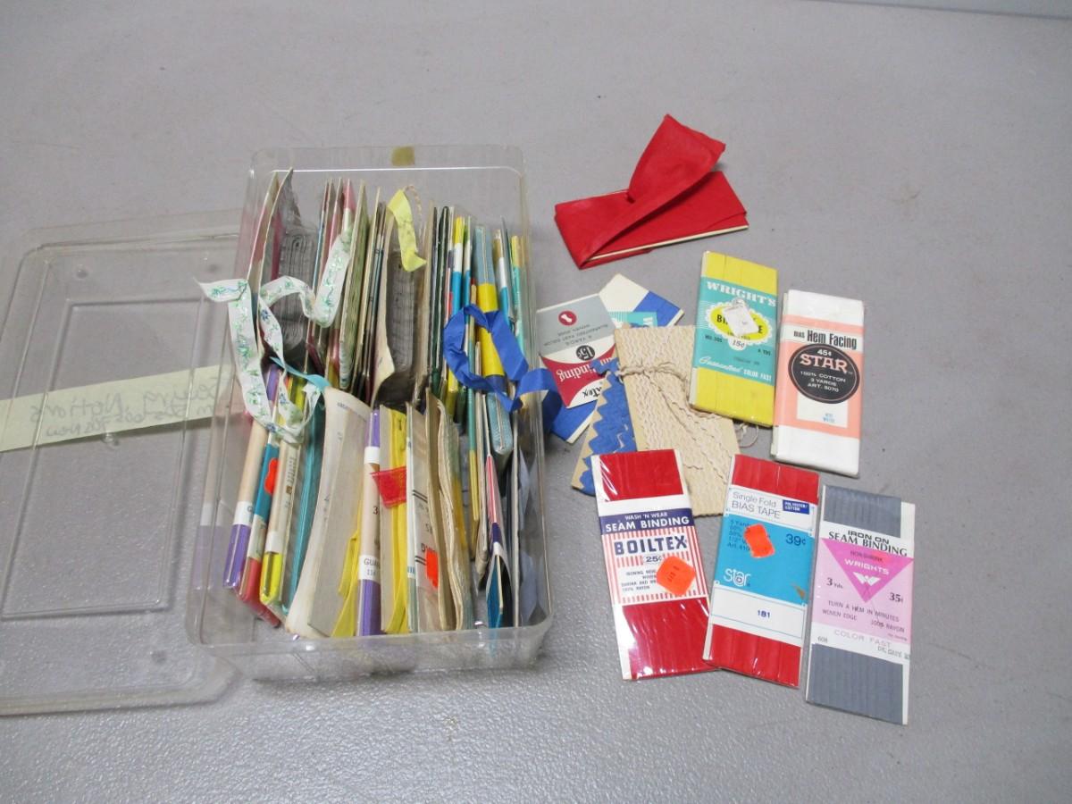 Sewing Notions 1950's - 1960's - Hem Facing - Seam Binding - Bias Tape - Includes A Vintage Plastic Bin