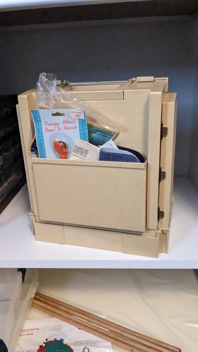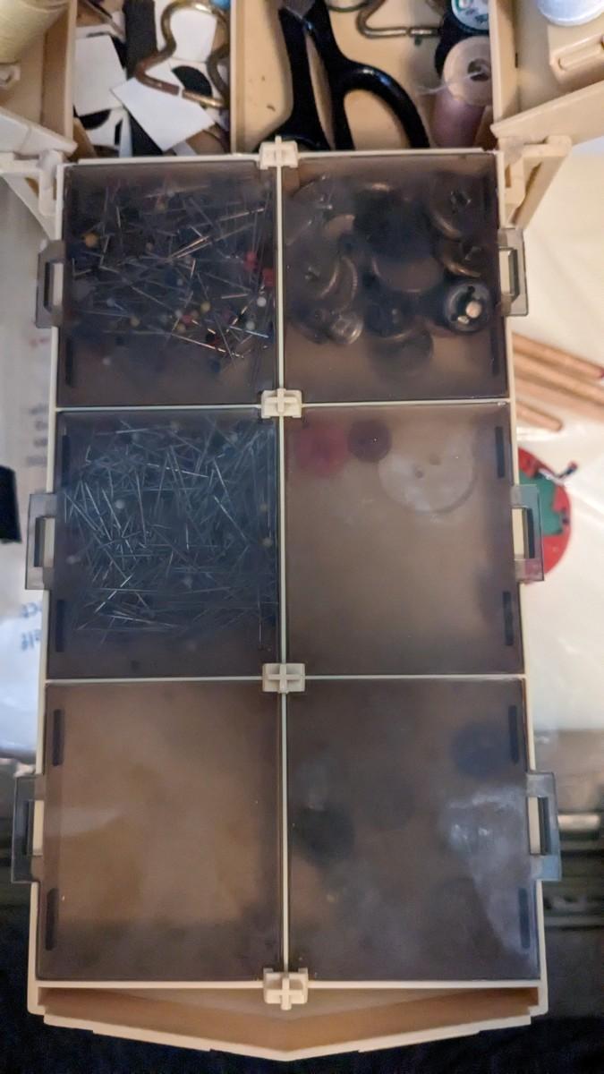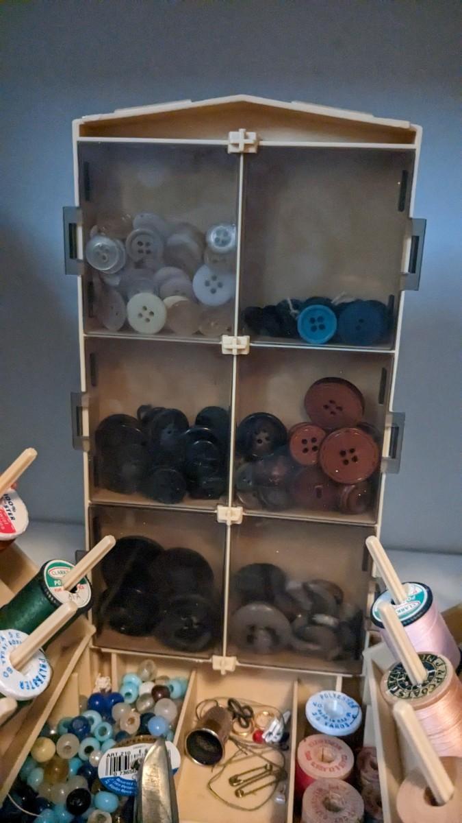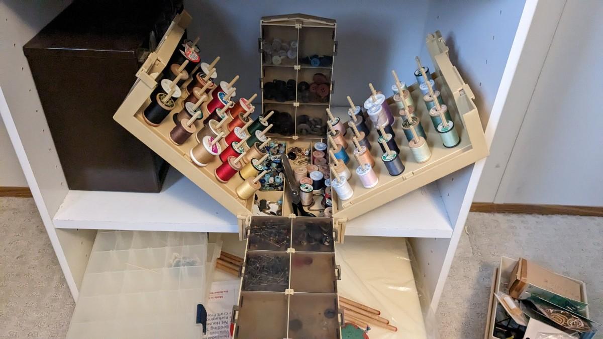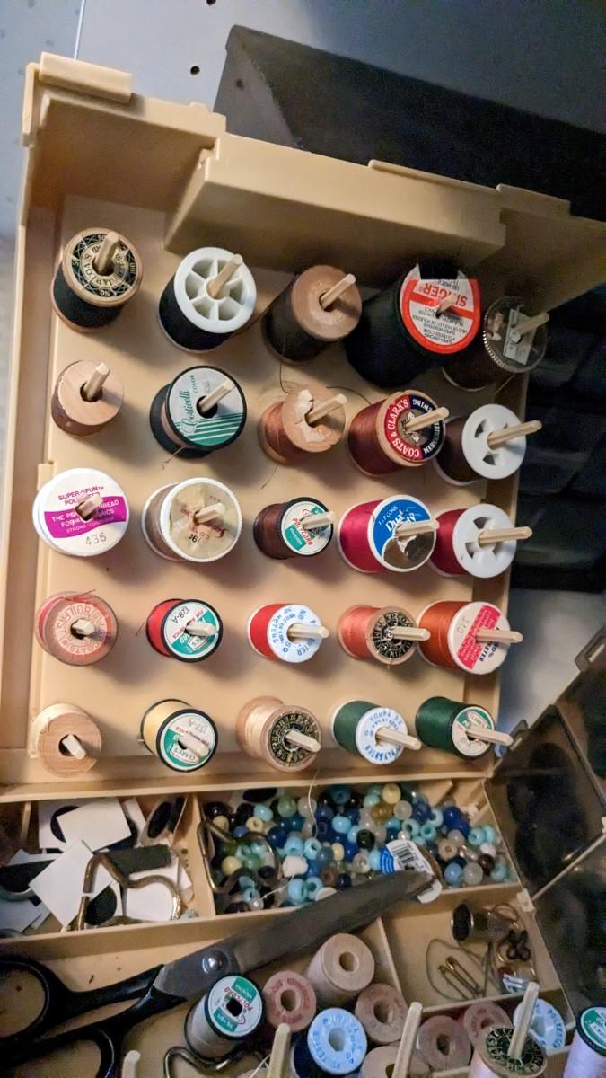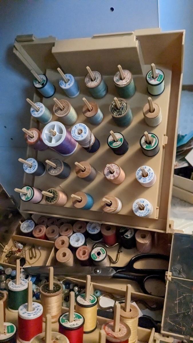 over 5 storage/organization cases plum full of vintage and contemporary sewing and crafting items. Lots of good stuff in here. bdrm2