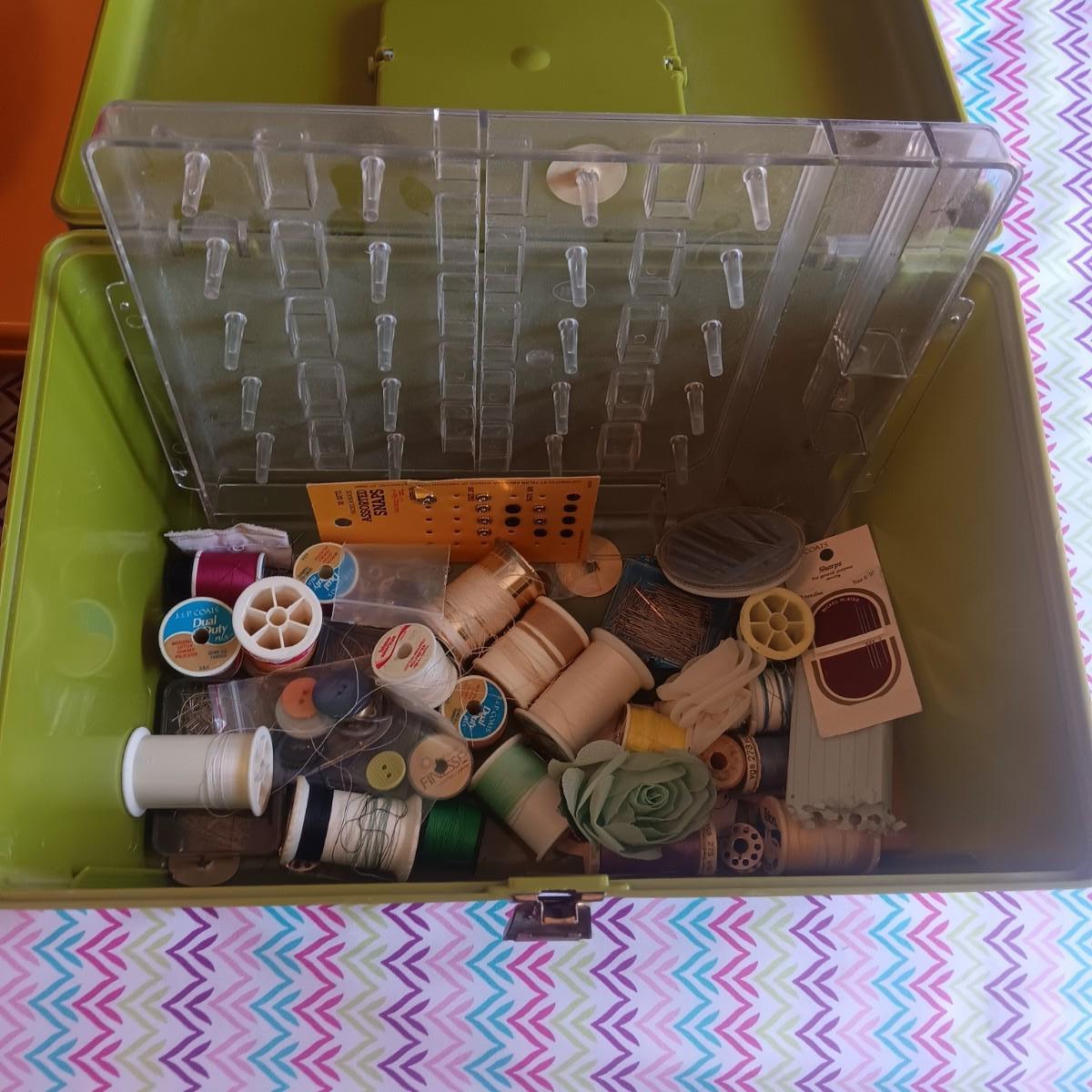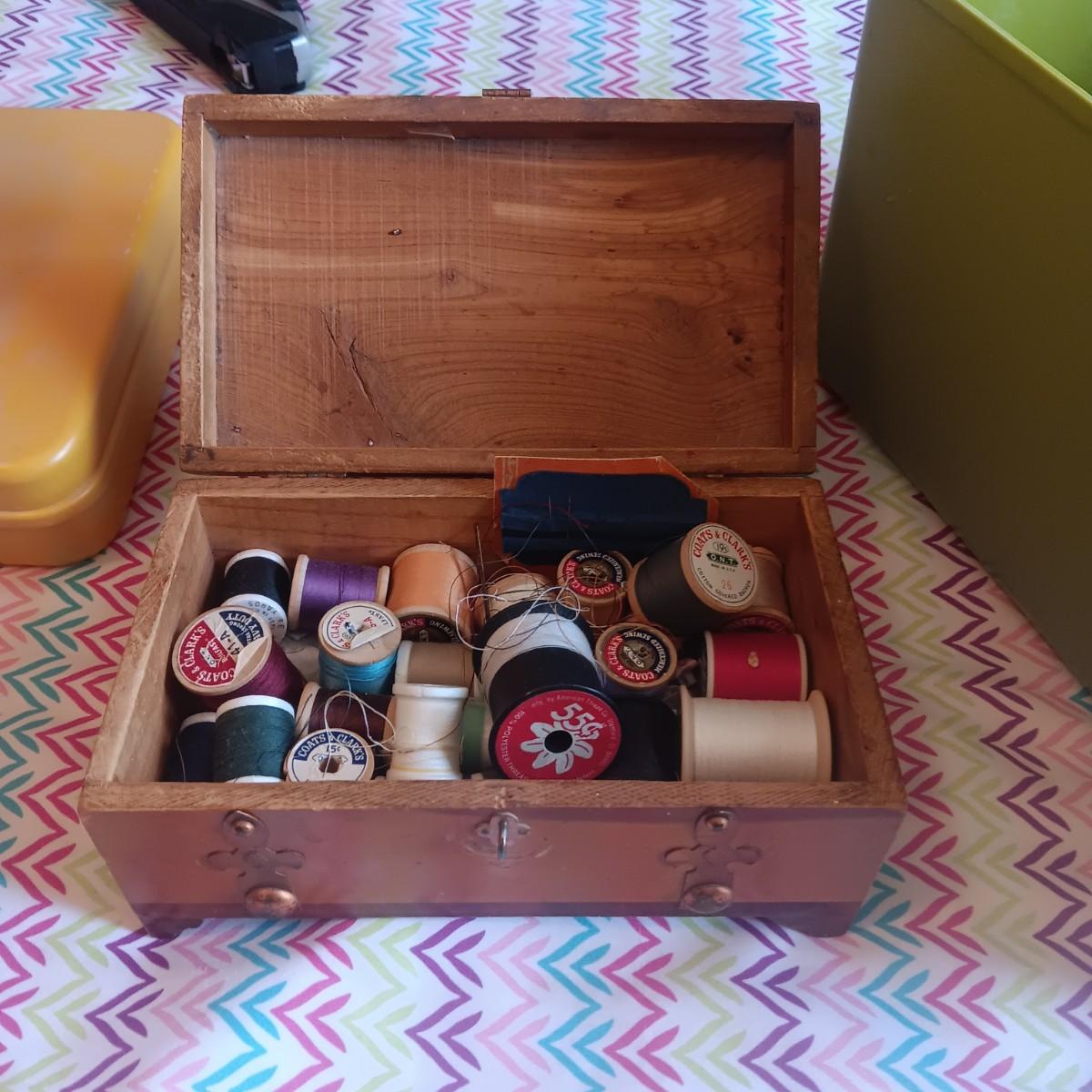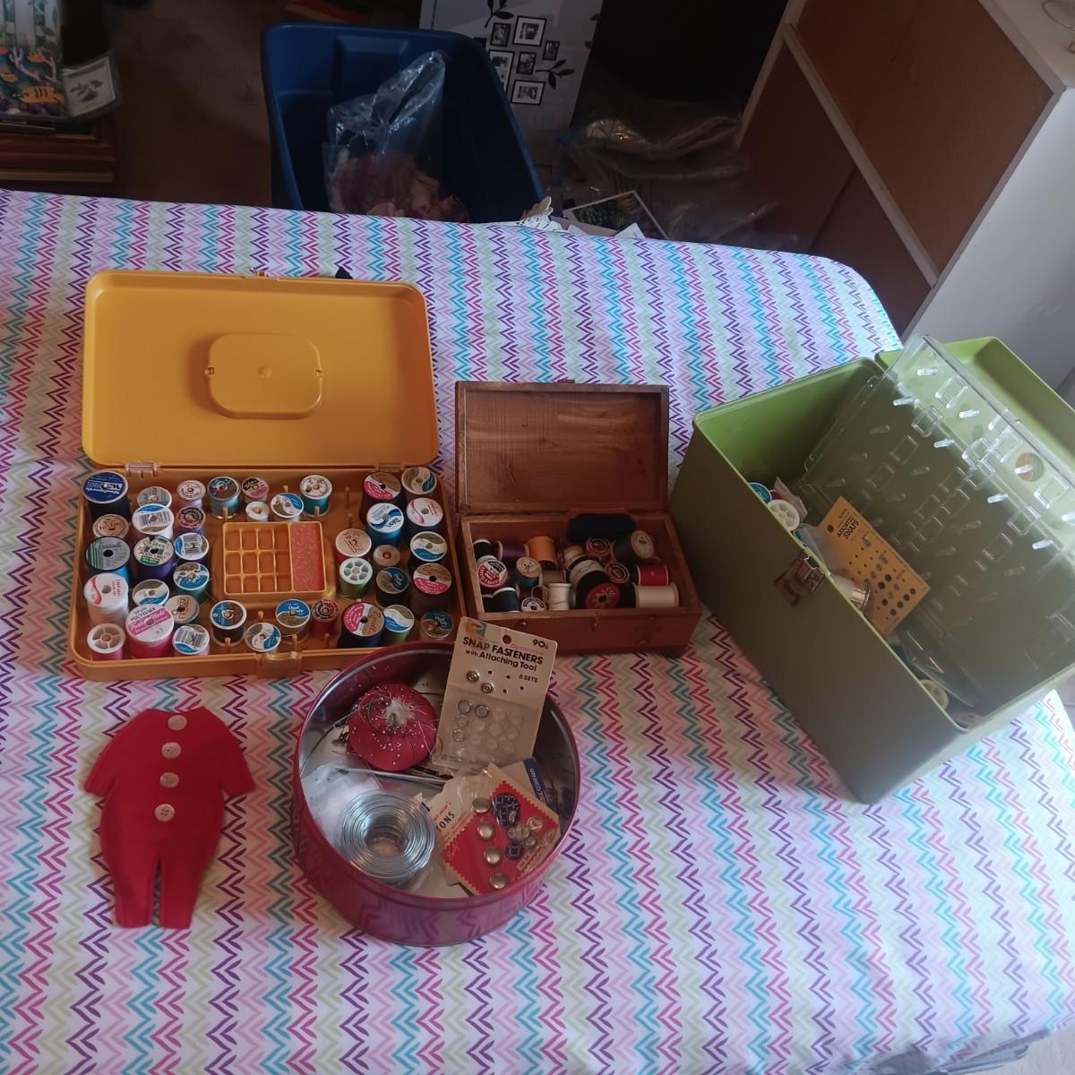 SEWING NOTIONS WITH 2 SEWING BOXES AND 1 WOOD BOX