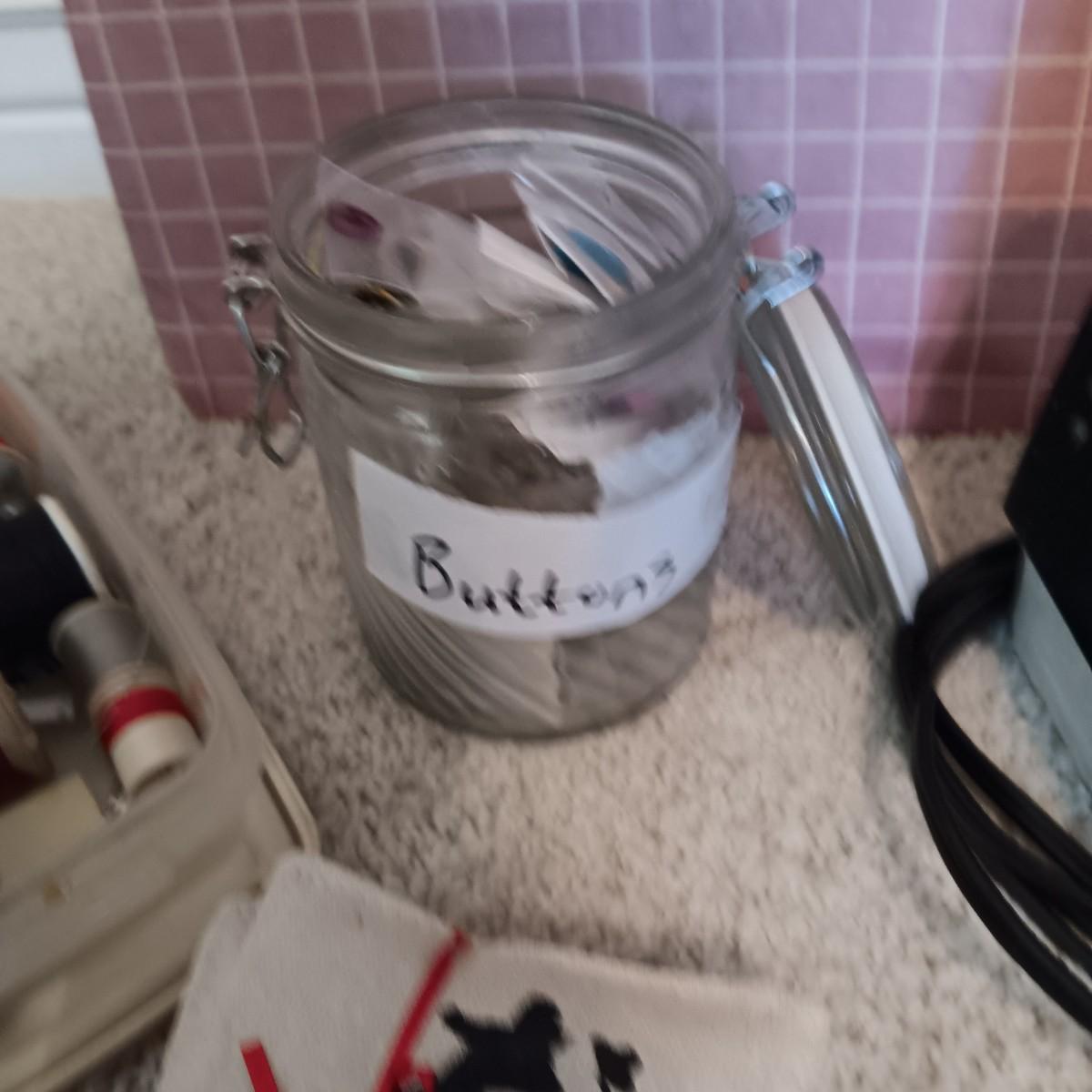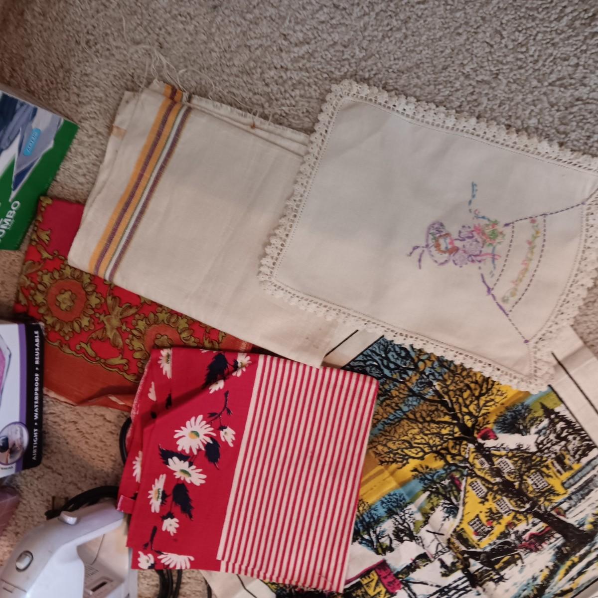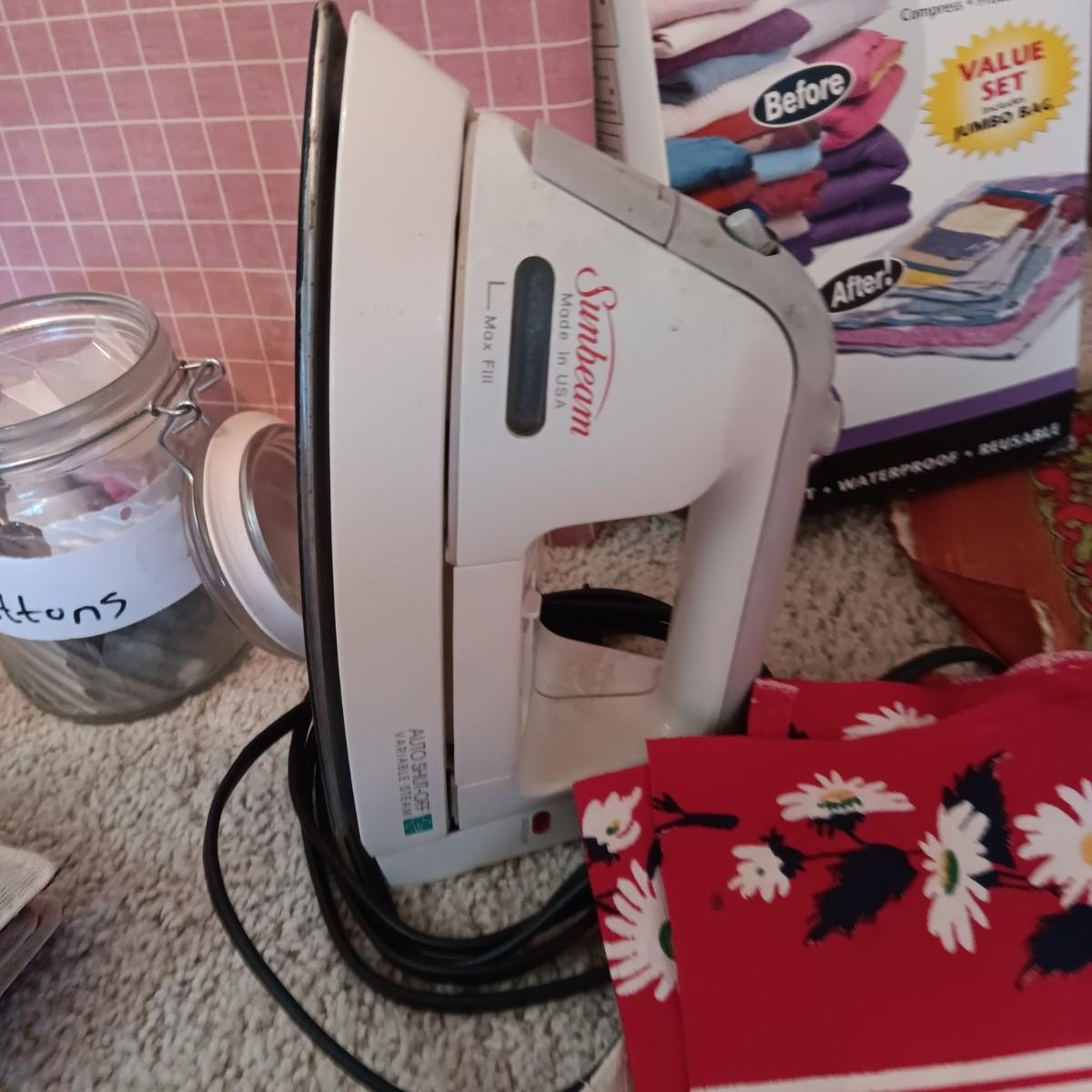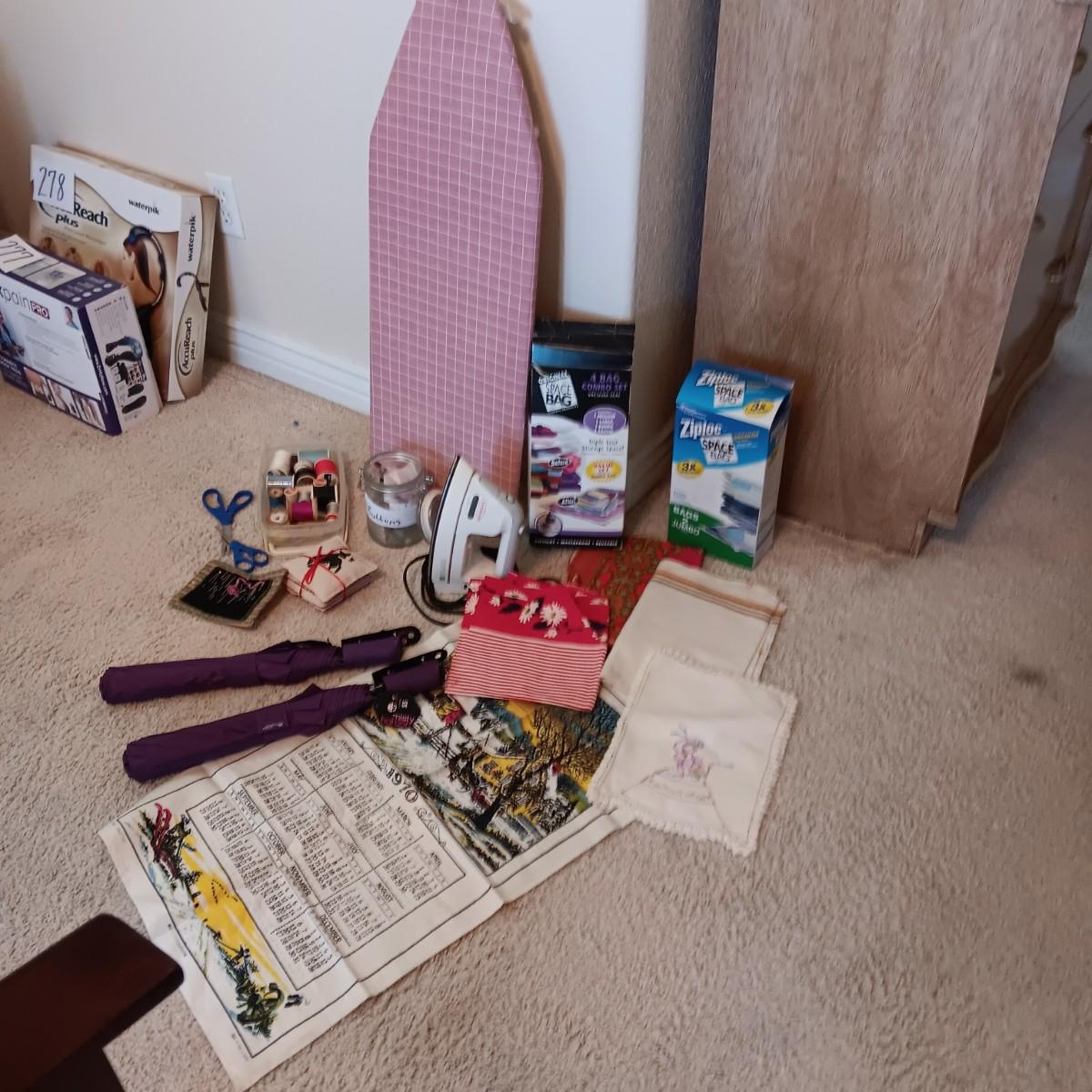 SEWING NOTIONS/BUTTONS, UNFINISHED TEA TOWELS, IRON AND BOARD PLUS MORE