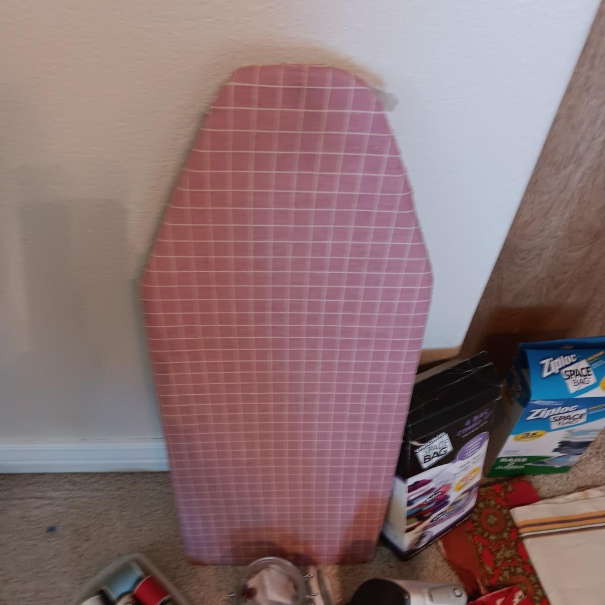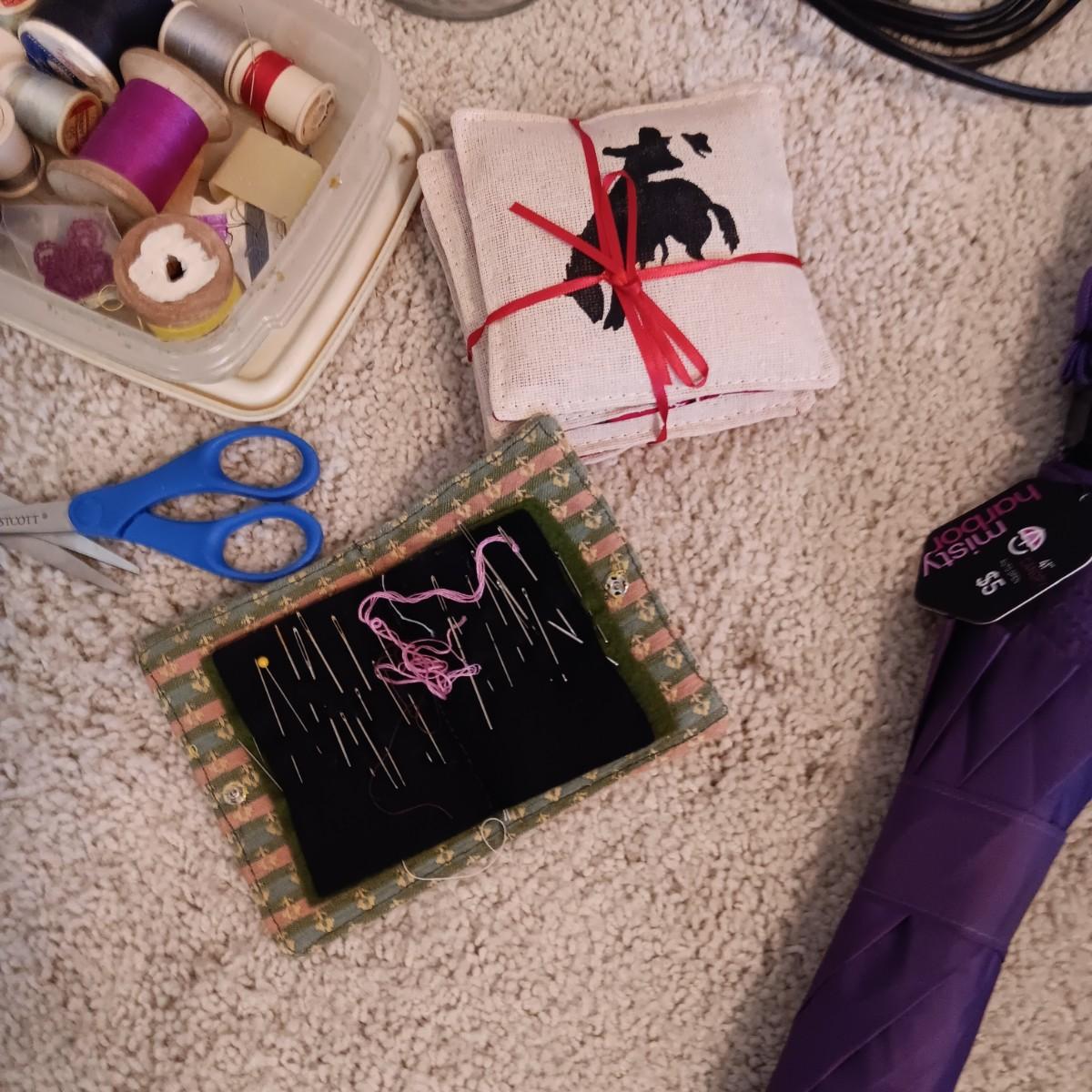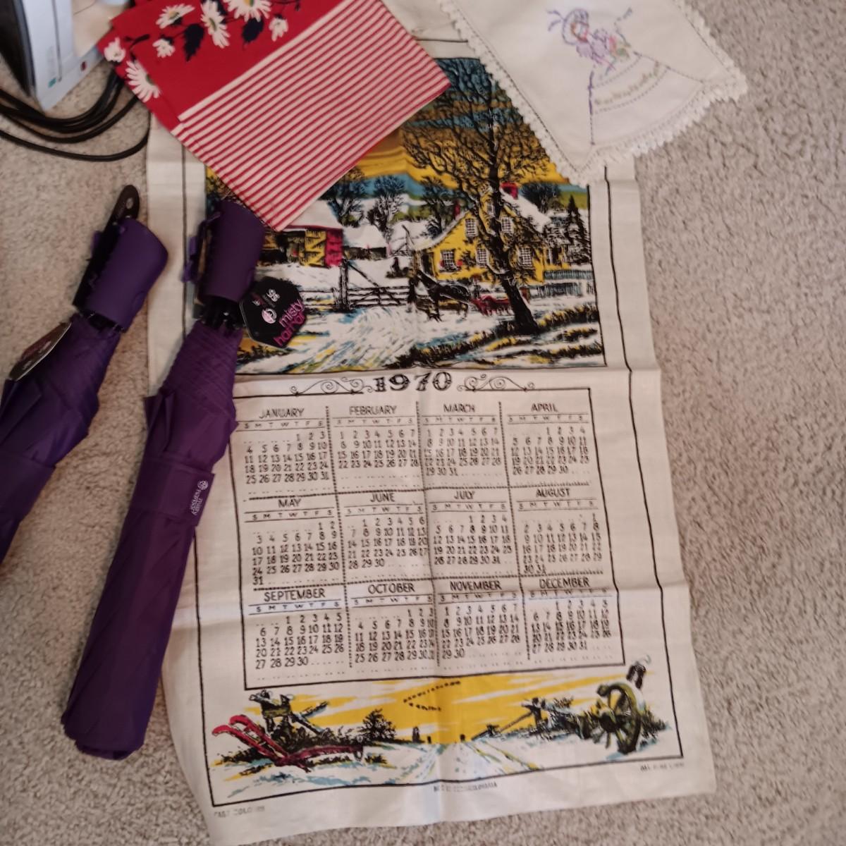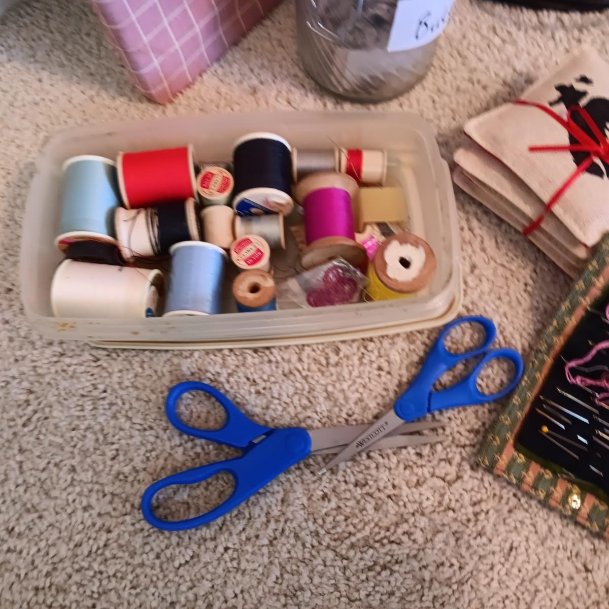 SEWING NOTIONS/BUTTONS, UNFINISHED TEA TOWELS, IRON AND BOARD PLUS MORE