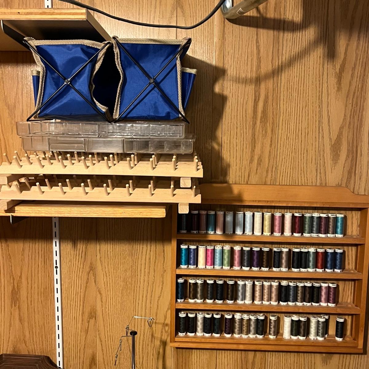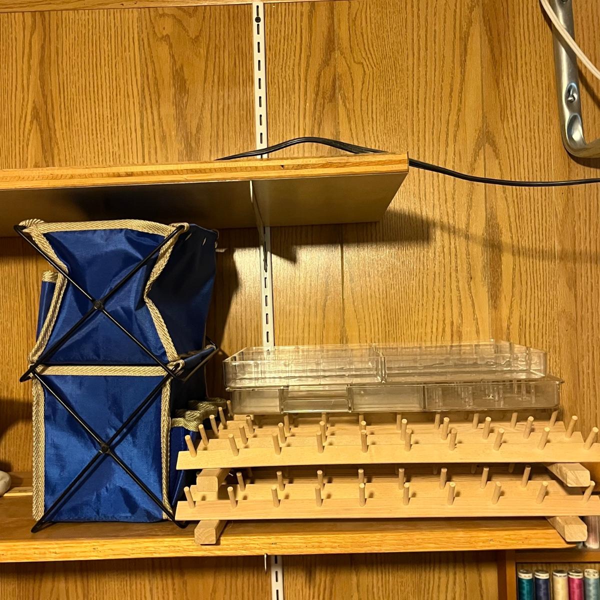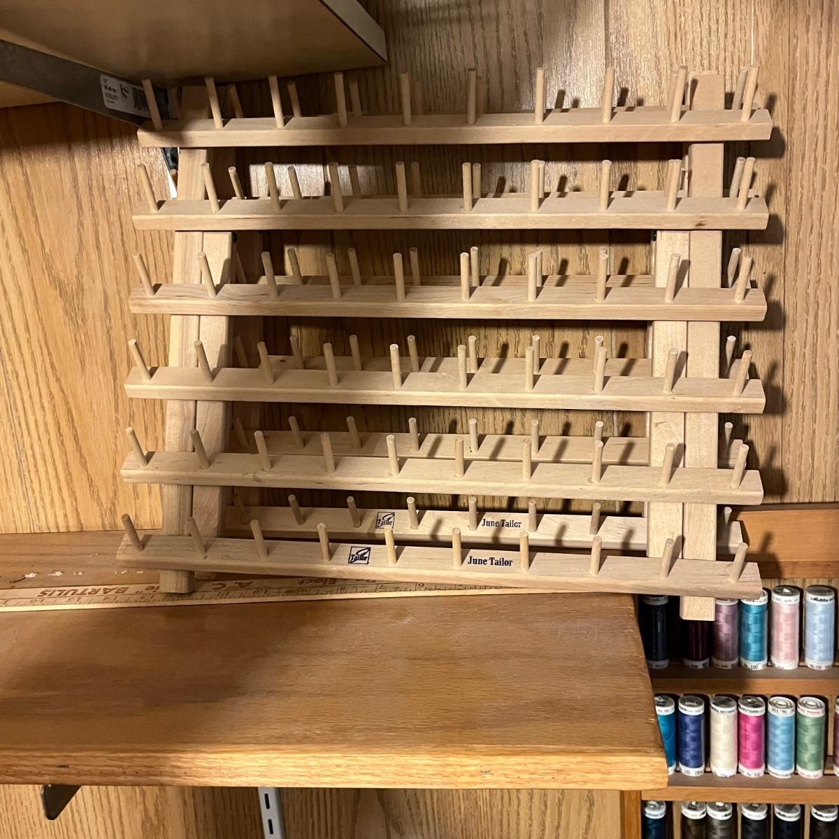 Lot includes a seventy spool wall holder, two June Tailor sixty spool folding holders, two metal and fabric folding bags and two plastic trays. Spool holder with thread (included) measures 16.5” x 19” x 2”.