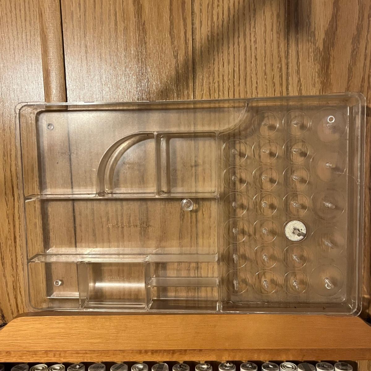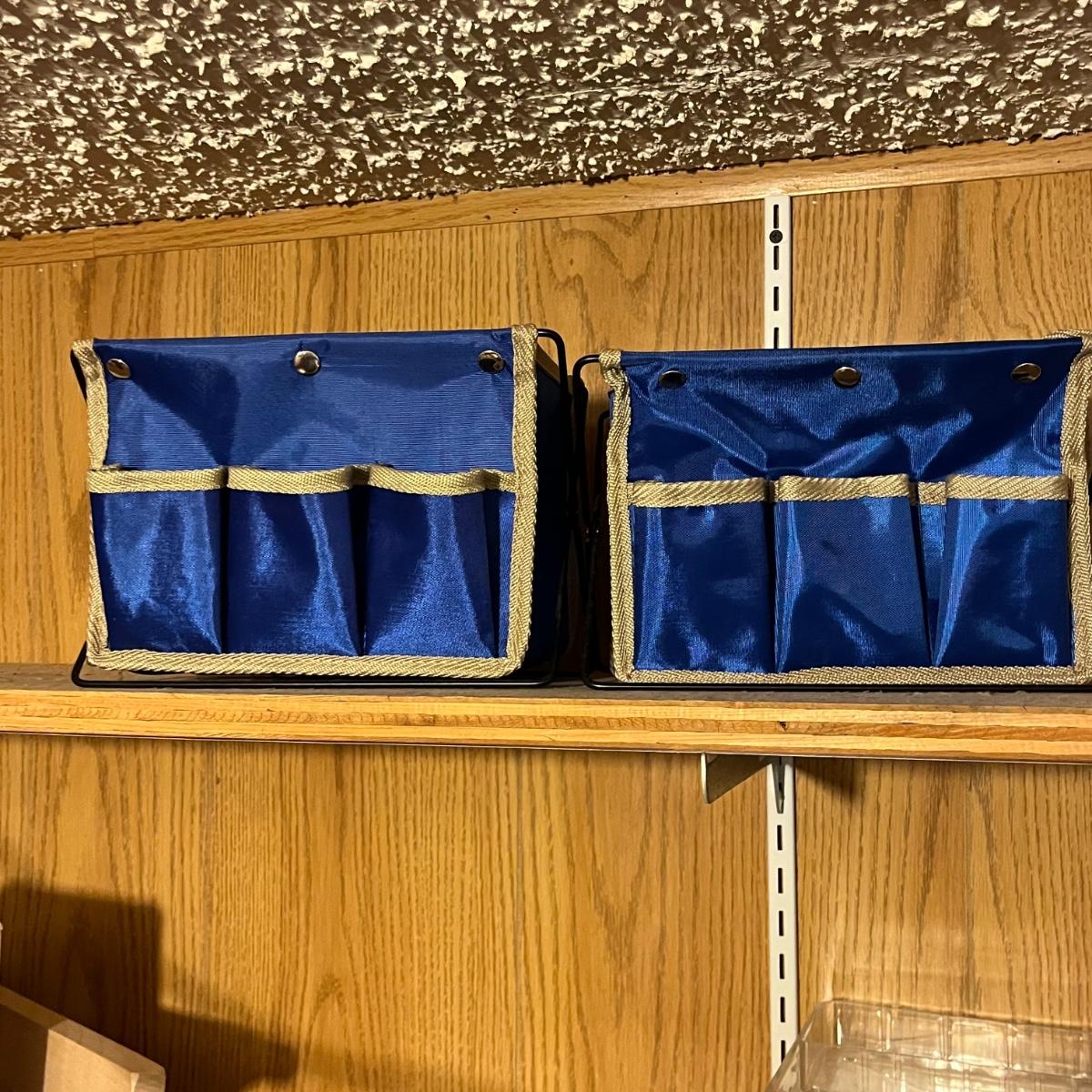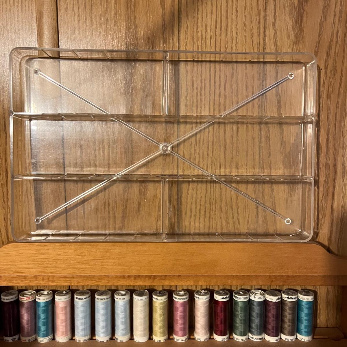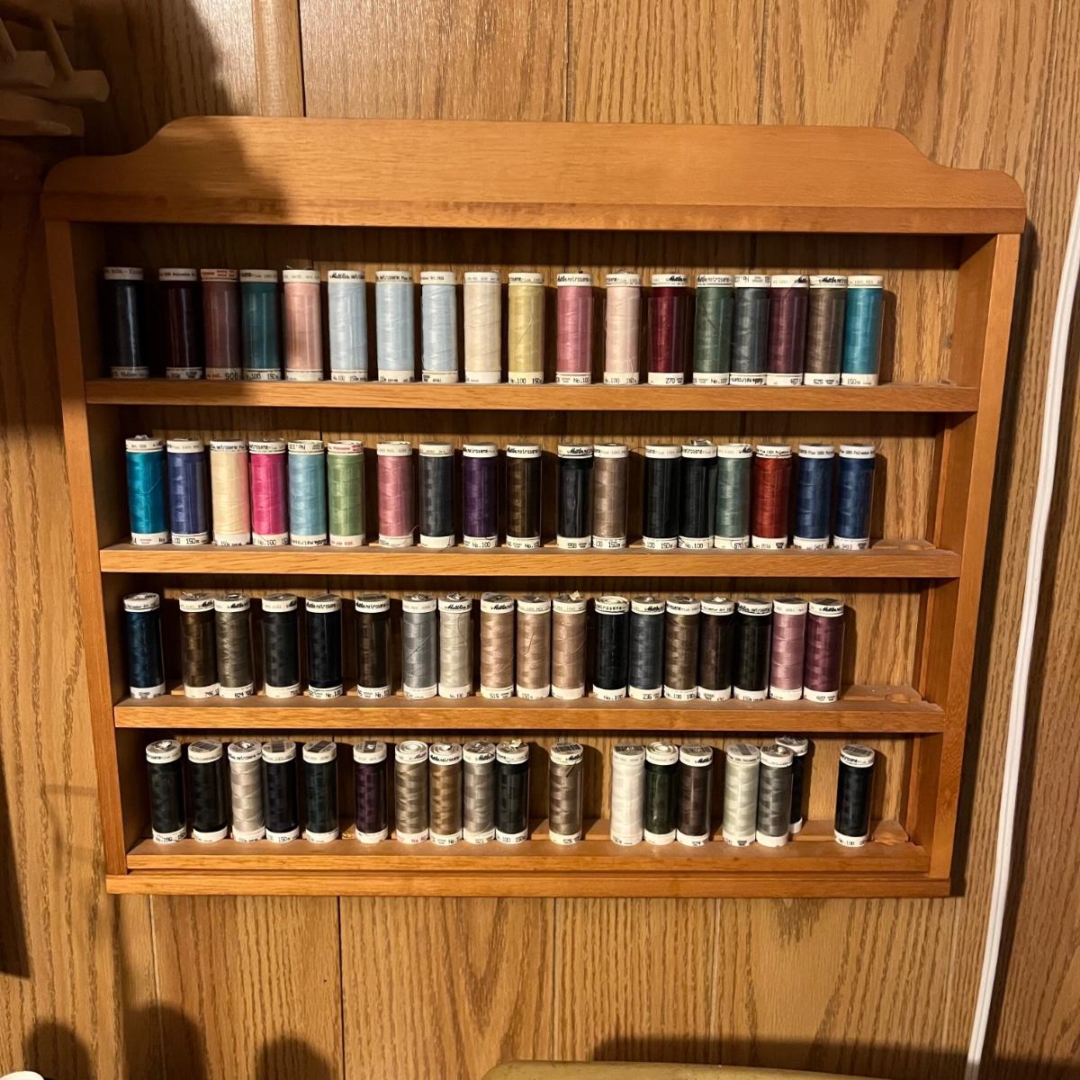 Lot includes a seventy spool wall holder, two June Tailor sixty spool folding holders, two metal and fabric folding bags and two plastic trays. Spool holder with thread (included) measures 16.5” x 19” x 2”.
