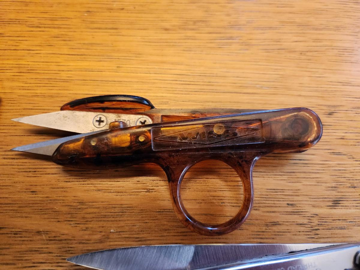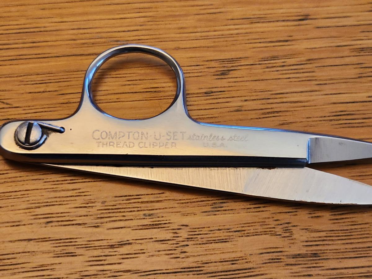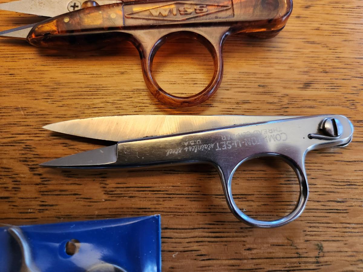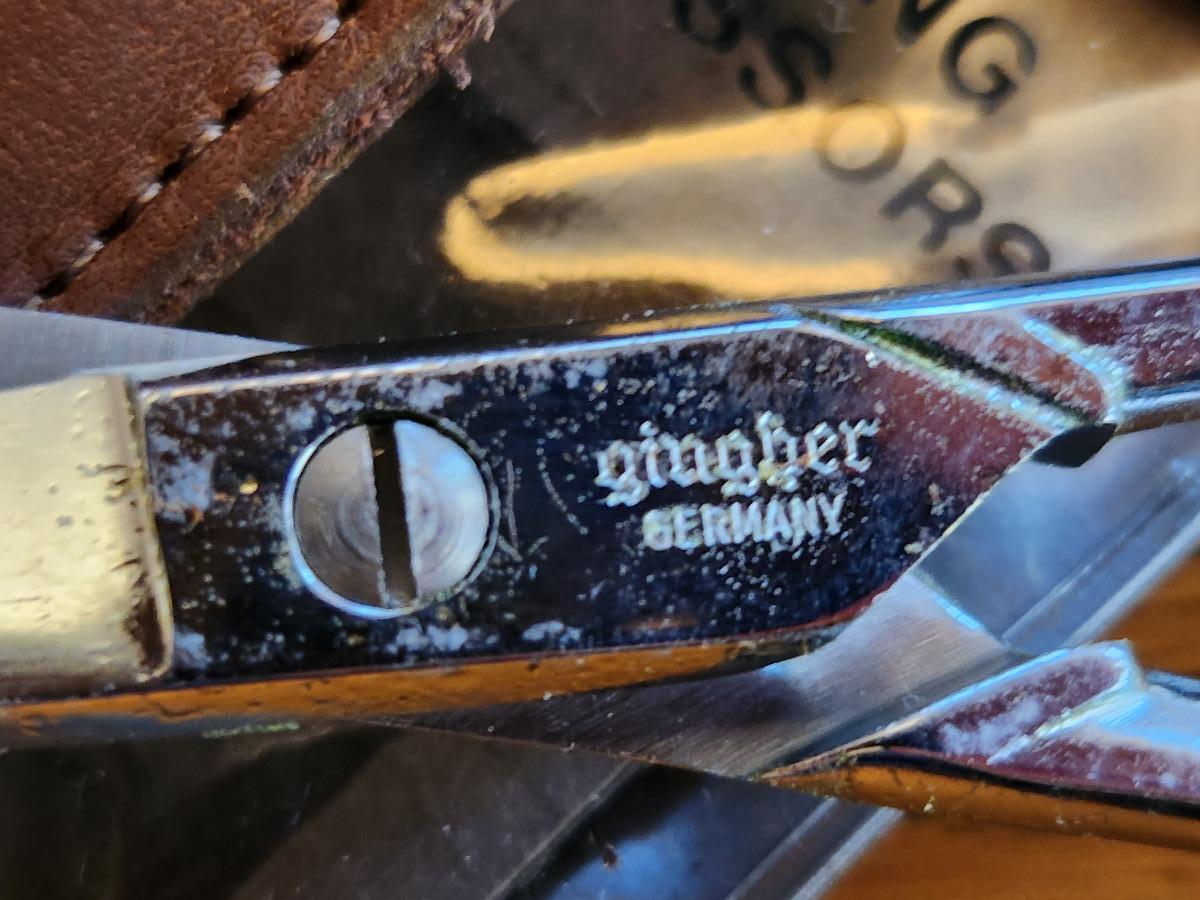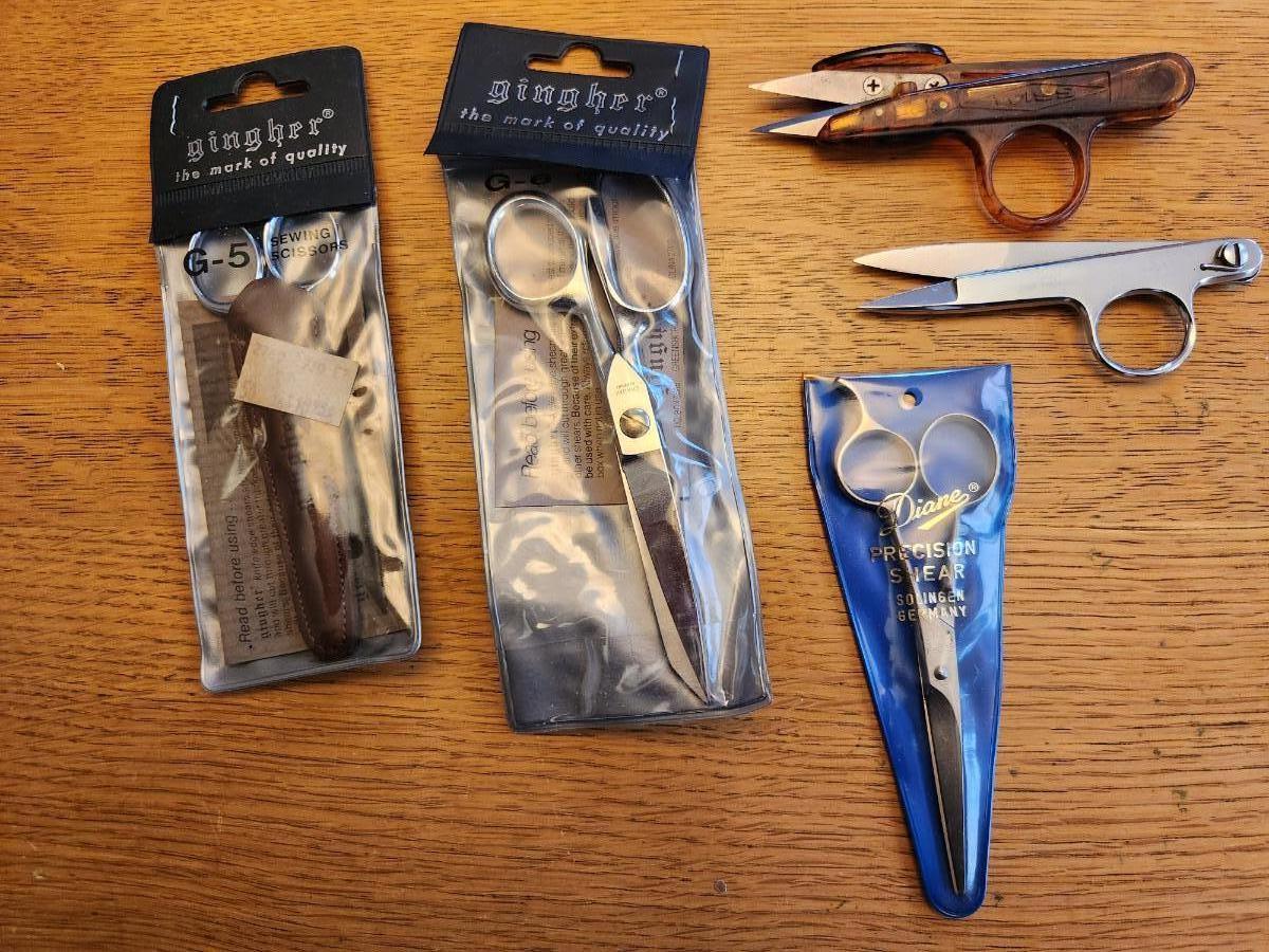This auction lot is for a group of 5 unique Sewing Scissors. The 1st is a Gingher #6 and the 2nd is a Gingher #5. Gingher shears debuted in 1947 as a premier tool in the textile industry. By 1965, technology and top-notch engineering propelled these shears into an echelon of their own, with unsurpassed craftsmanship and quality. The #5 in this auction comes with a leather protective sleeve. Gingher Scissors are made in Greensboro, NC. The 3rd scissor is a 5 1/4-inch Diane from Solingen, Germany, the remaining two are classic thread clippers with the plastic-handled one from Wiss Scissors and the other is a stainless steel Compton-U-Set model