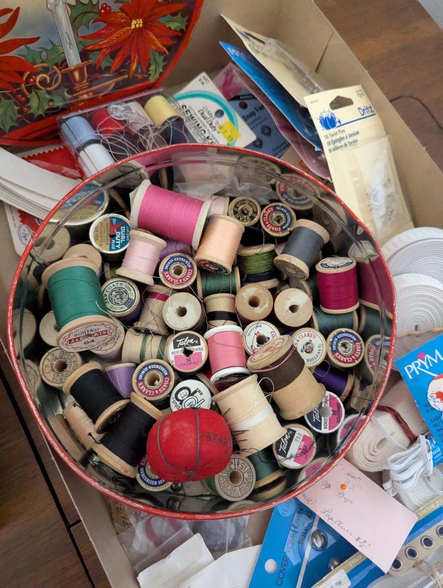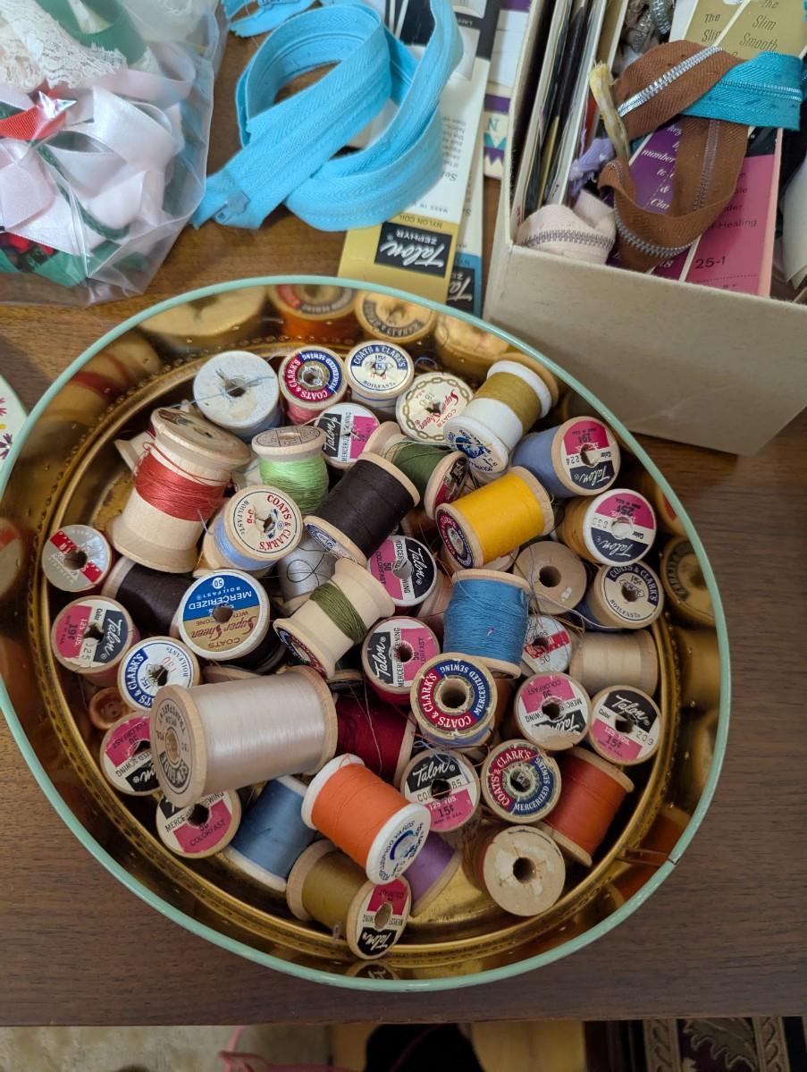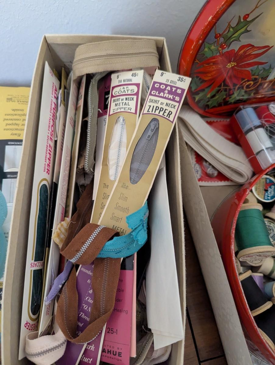 M multiple spools of thread and lots of colors, zippers,elastic and other supplies.