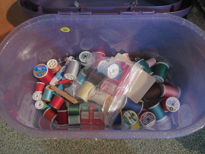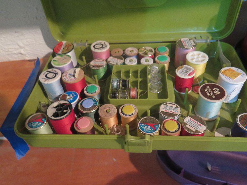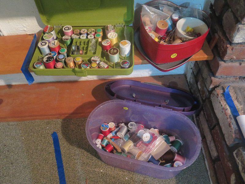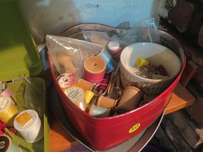 Sewing box filled with threads and bobbins, heart shaped tin with threads and supplies, and purple container with more thread.