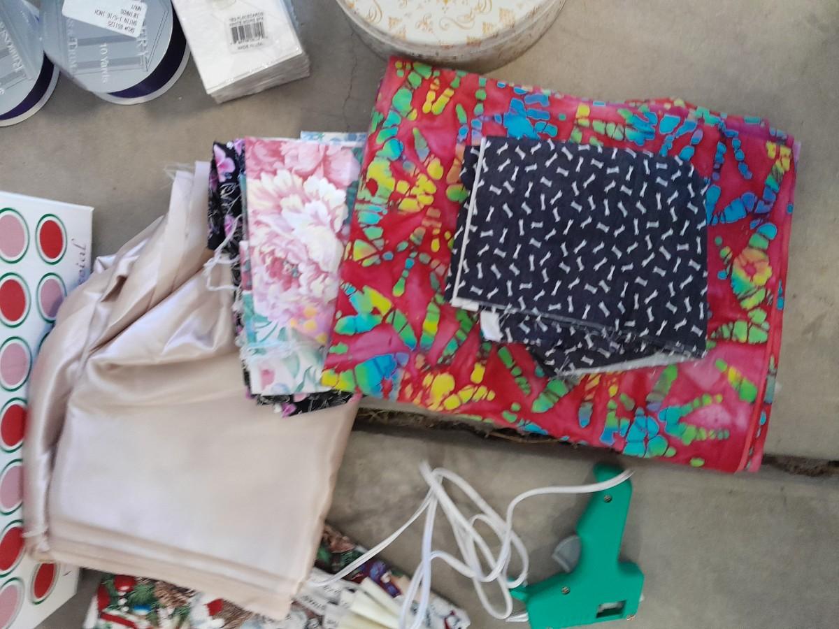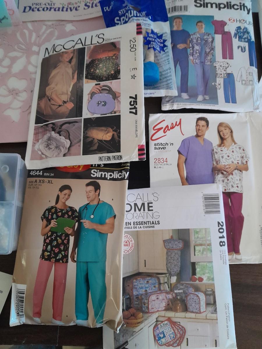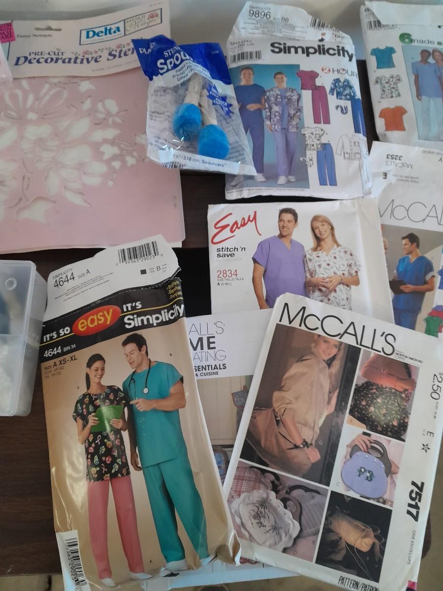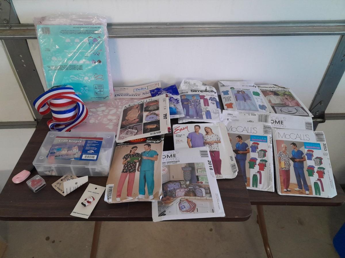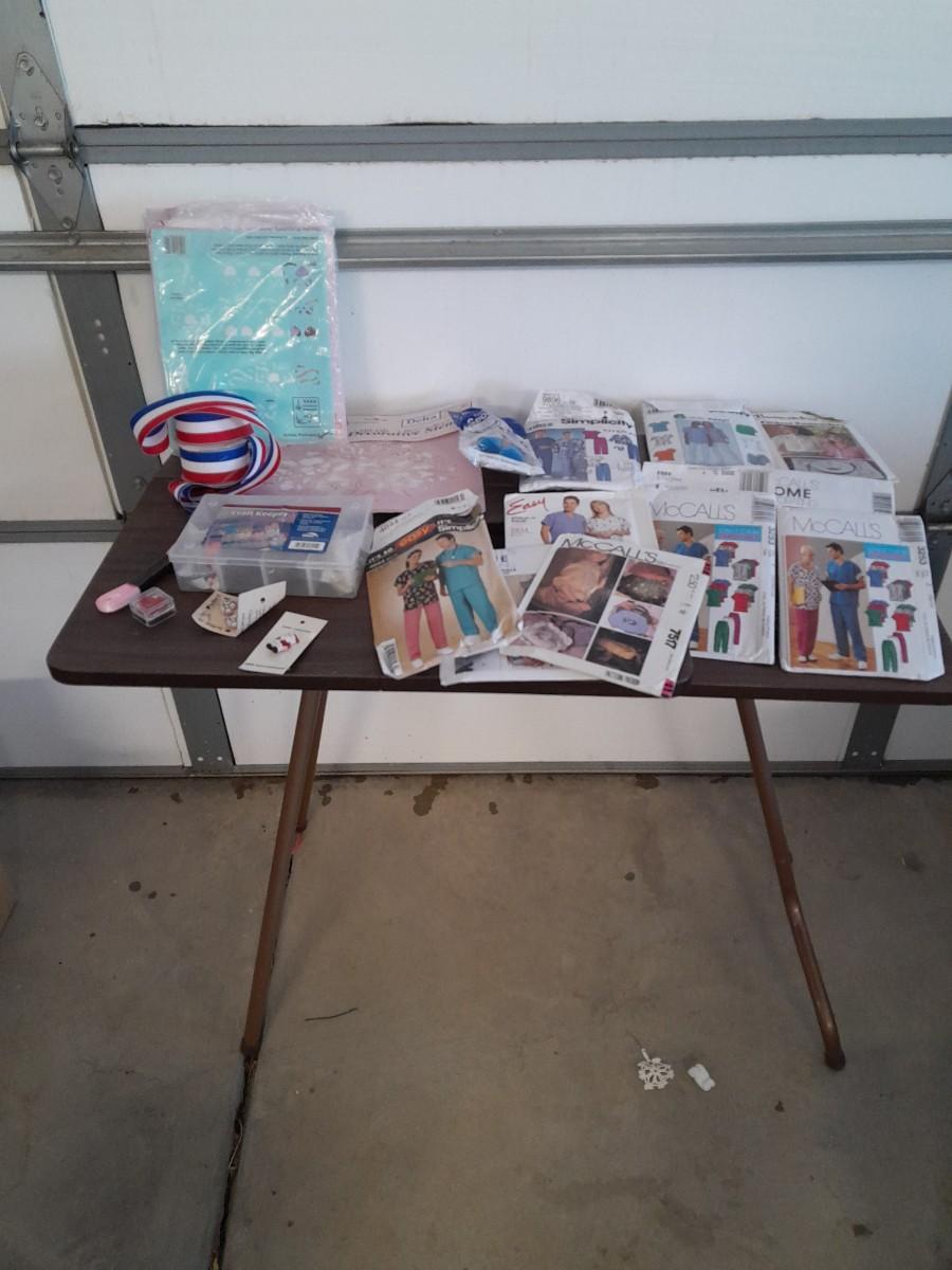 SEWING TABLE, PATTERNS, MATERIAL, RIBBON AND NOTIONS