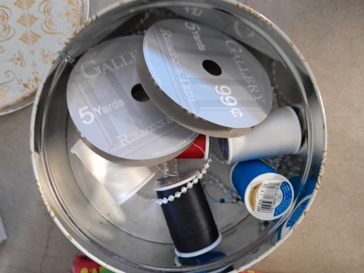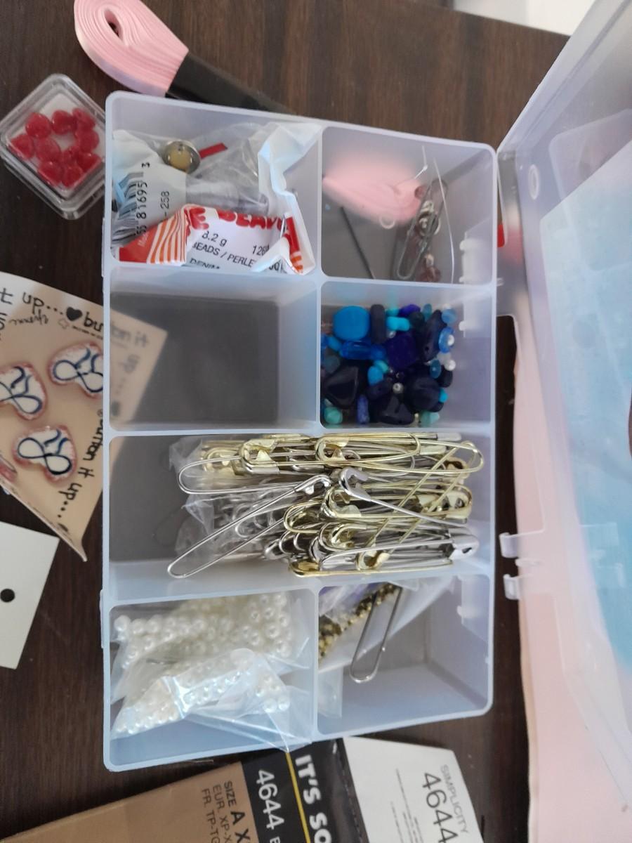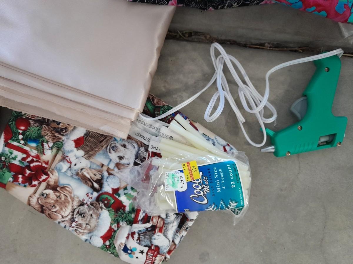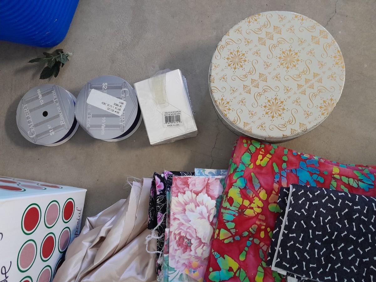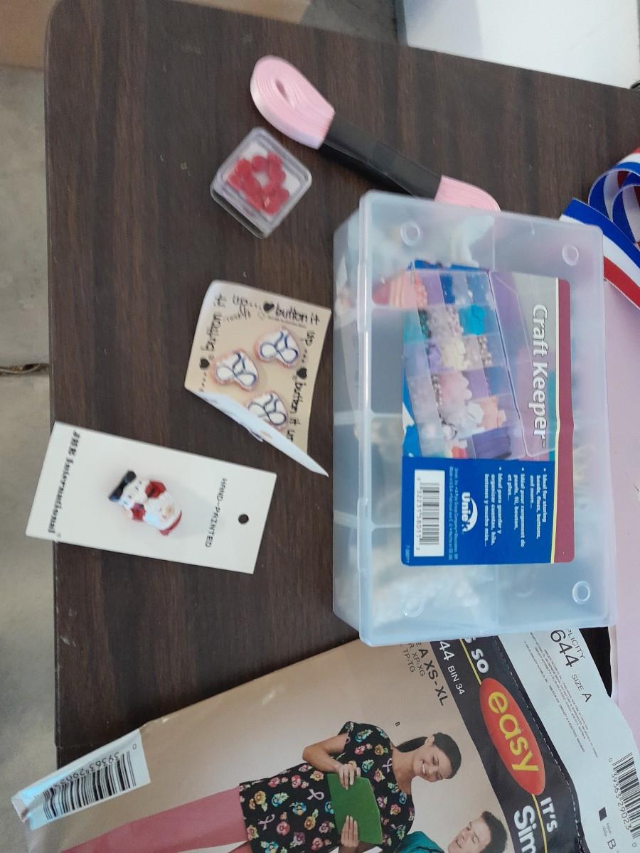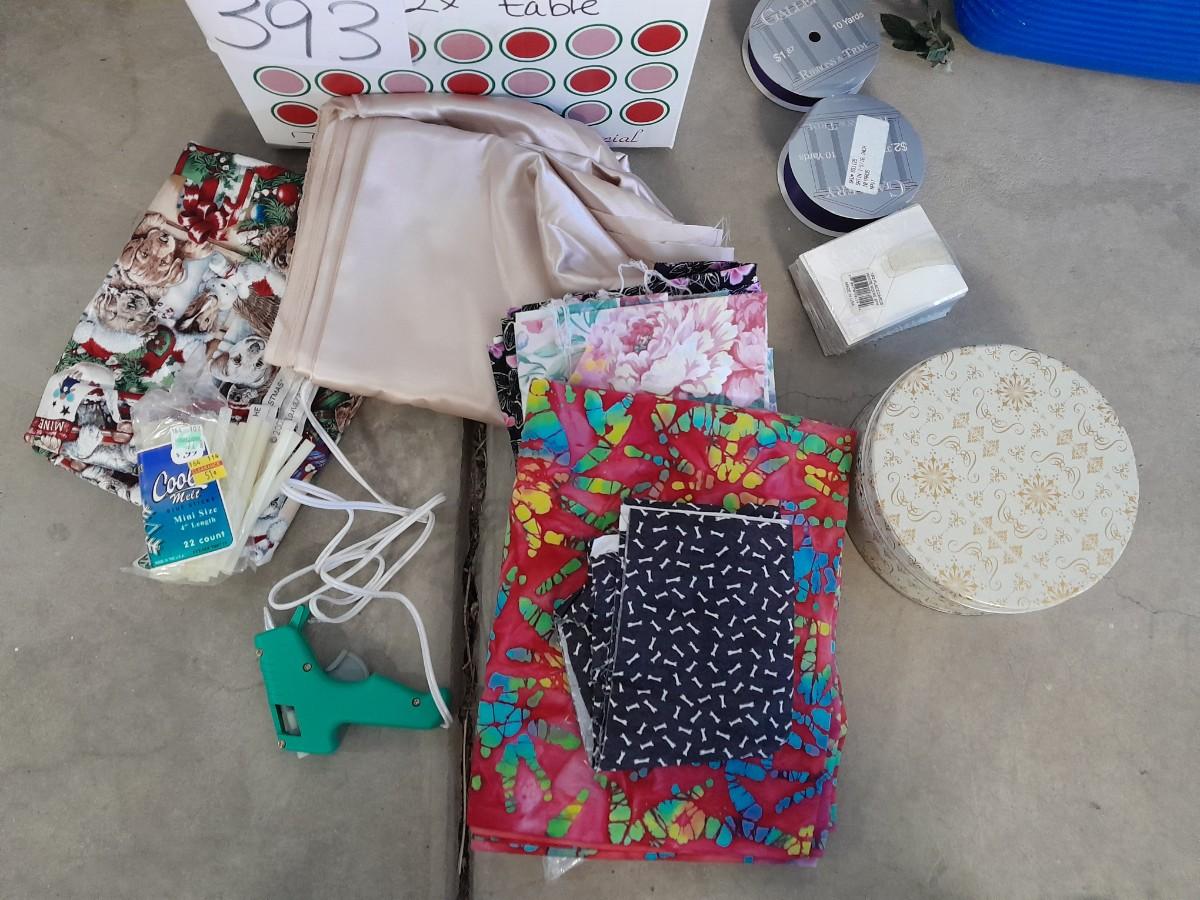 SEWING TABLE, PATTERNS, MATERIAL, RIBBON AND NOTIONS