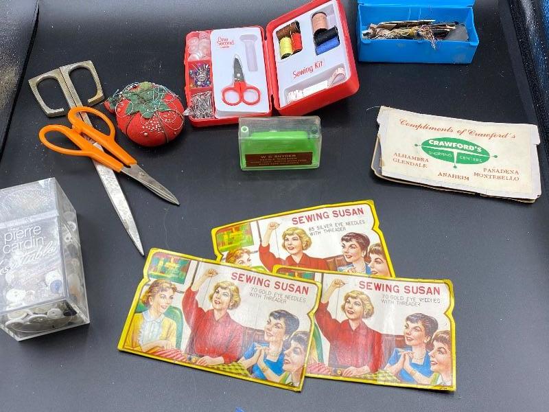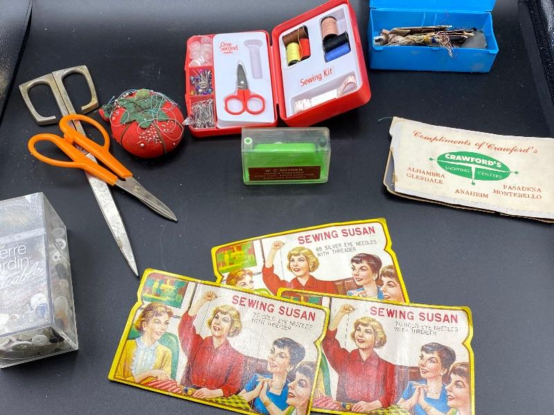 Mixed Sewing Kit Lot. A little bit of everything. Vintage spools of thread and needle books. 3 wood spool holders. Scissors, buttons, pins, etc. all your sewing basket needs, except the basket.