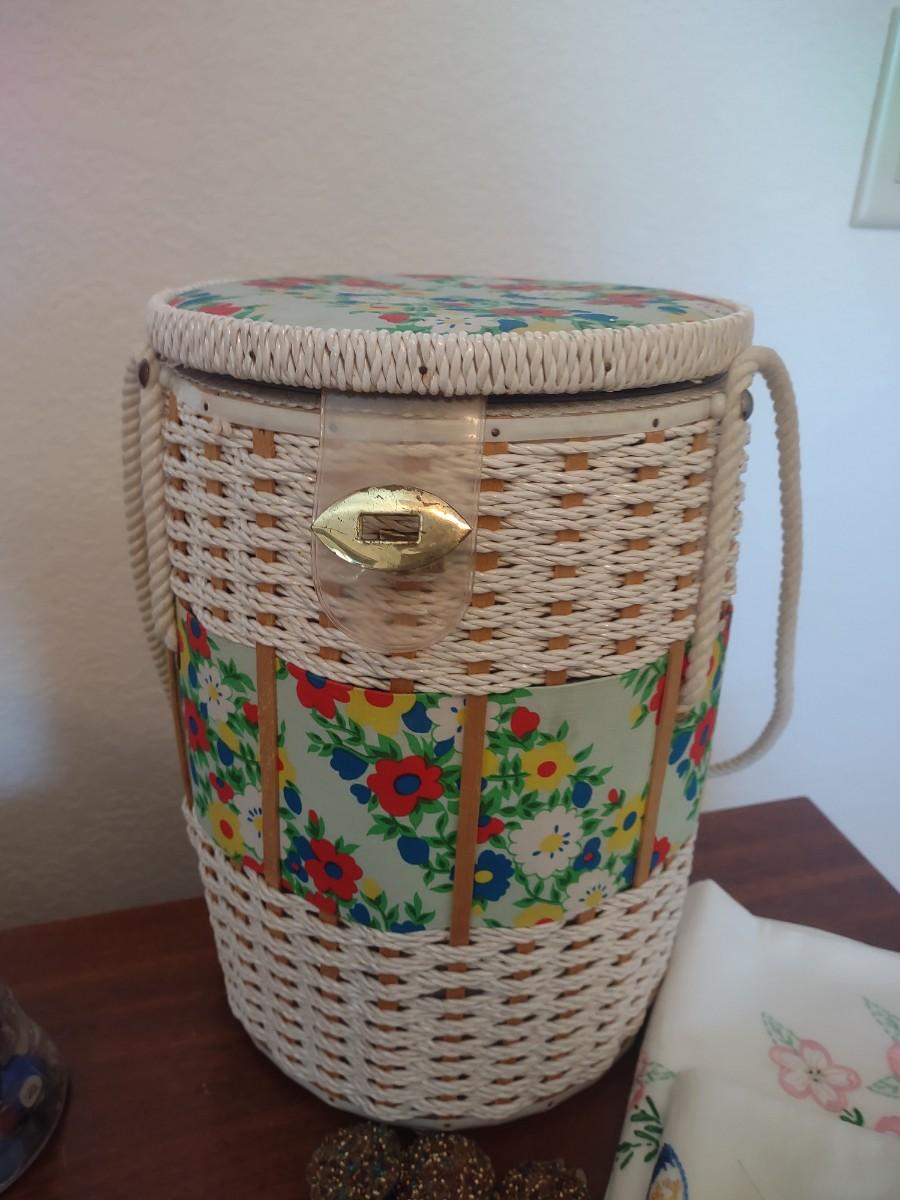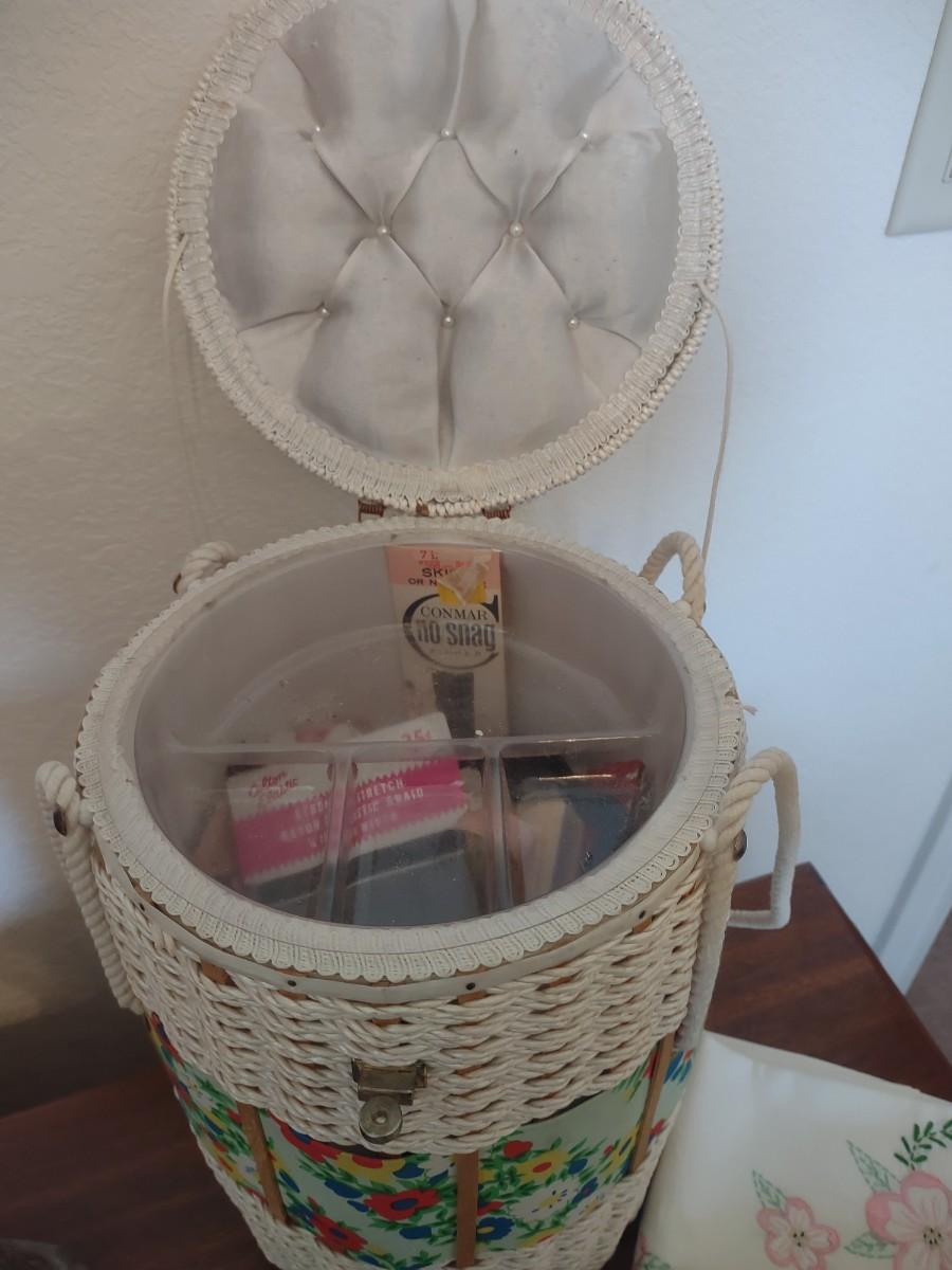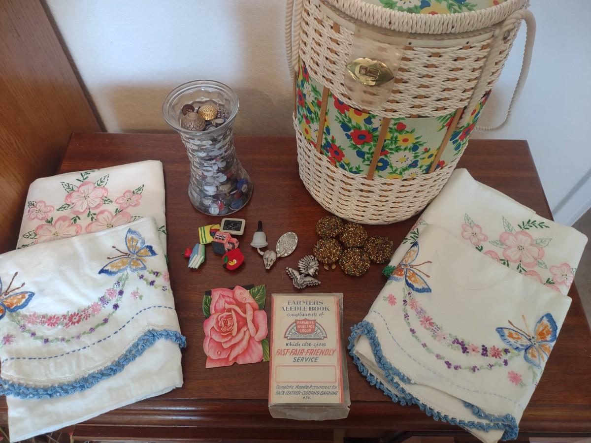 WICKER SEWING BASKET, OLD BUTTONS, EMBROIDERED PILLOWCASES AND MORE