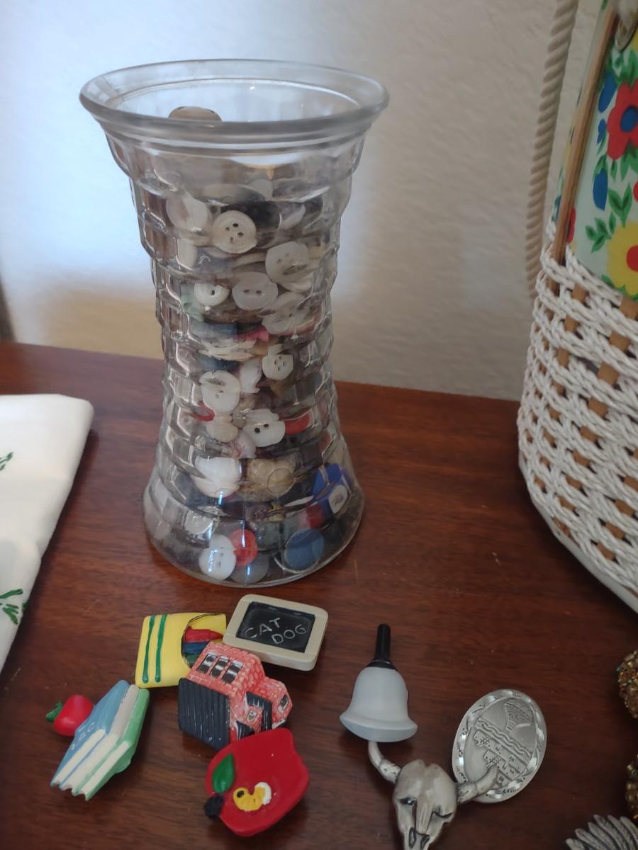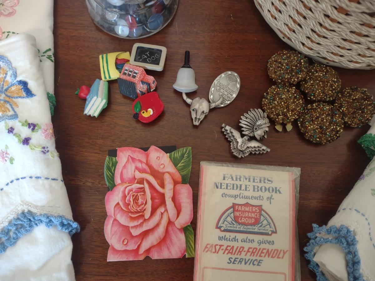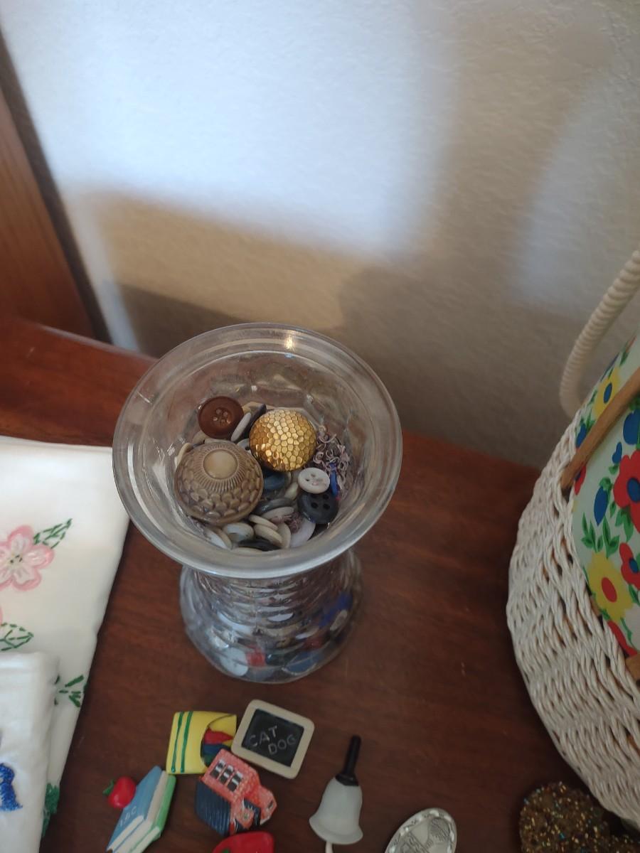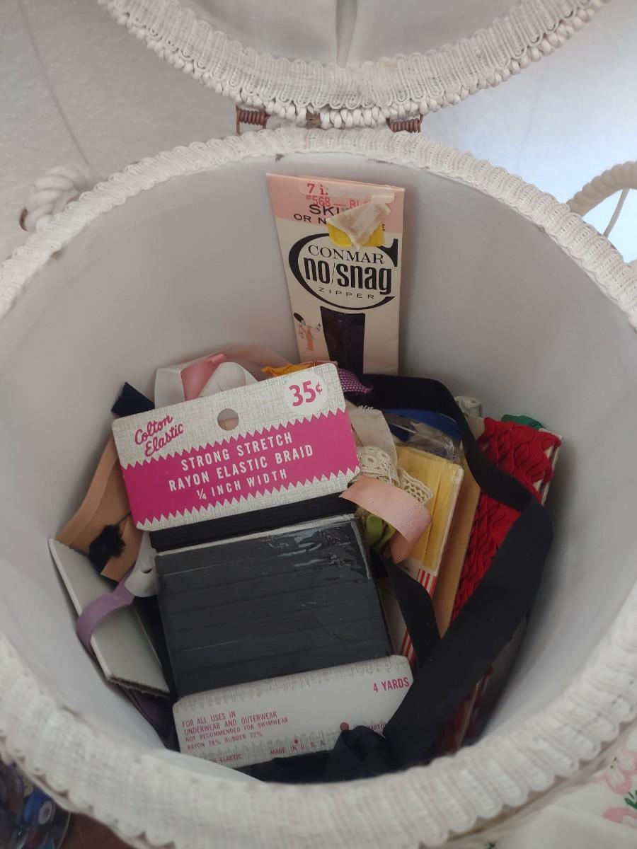 WICKER SEWING BASKET, OLD BUTTONS, EMBROIDERED PILLOWCASES AND MORE