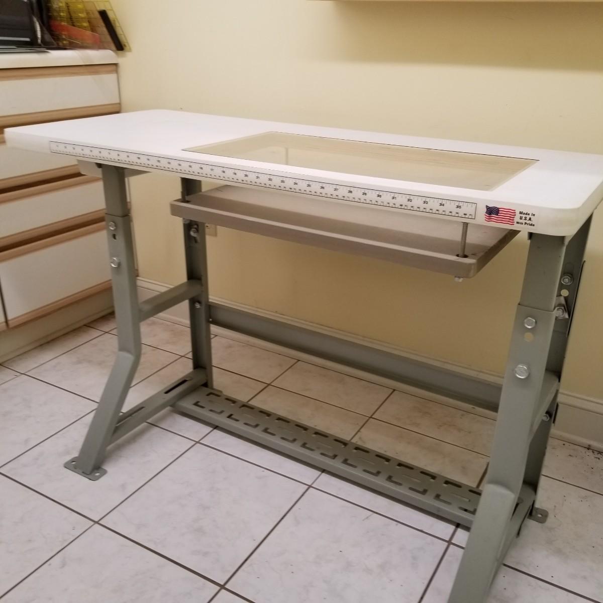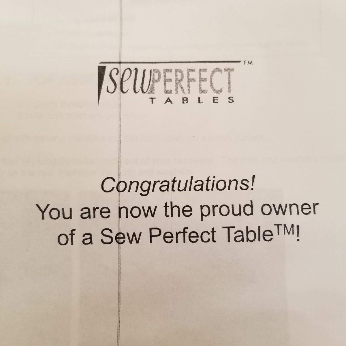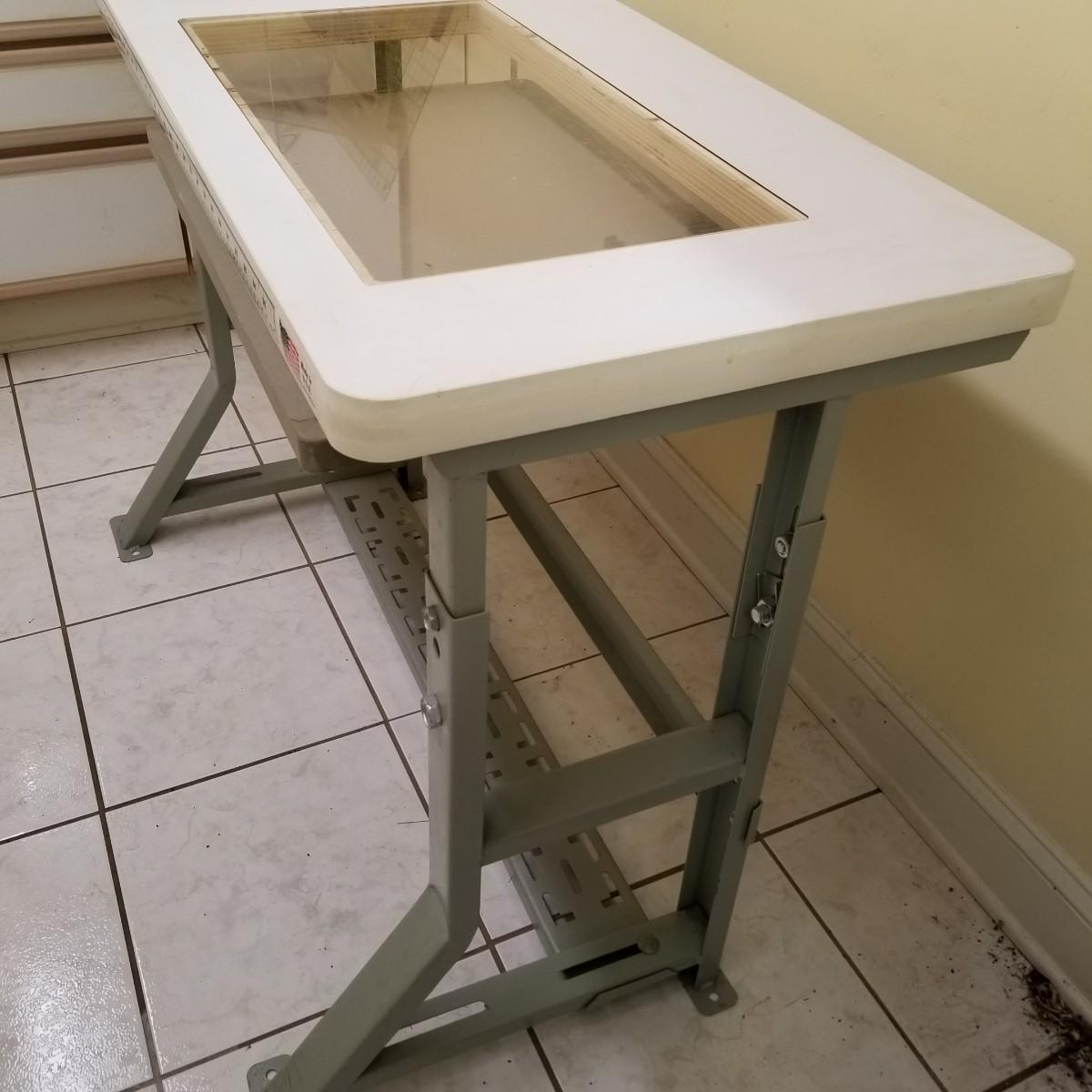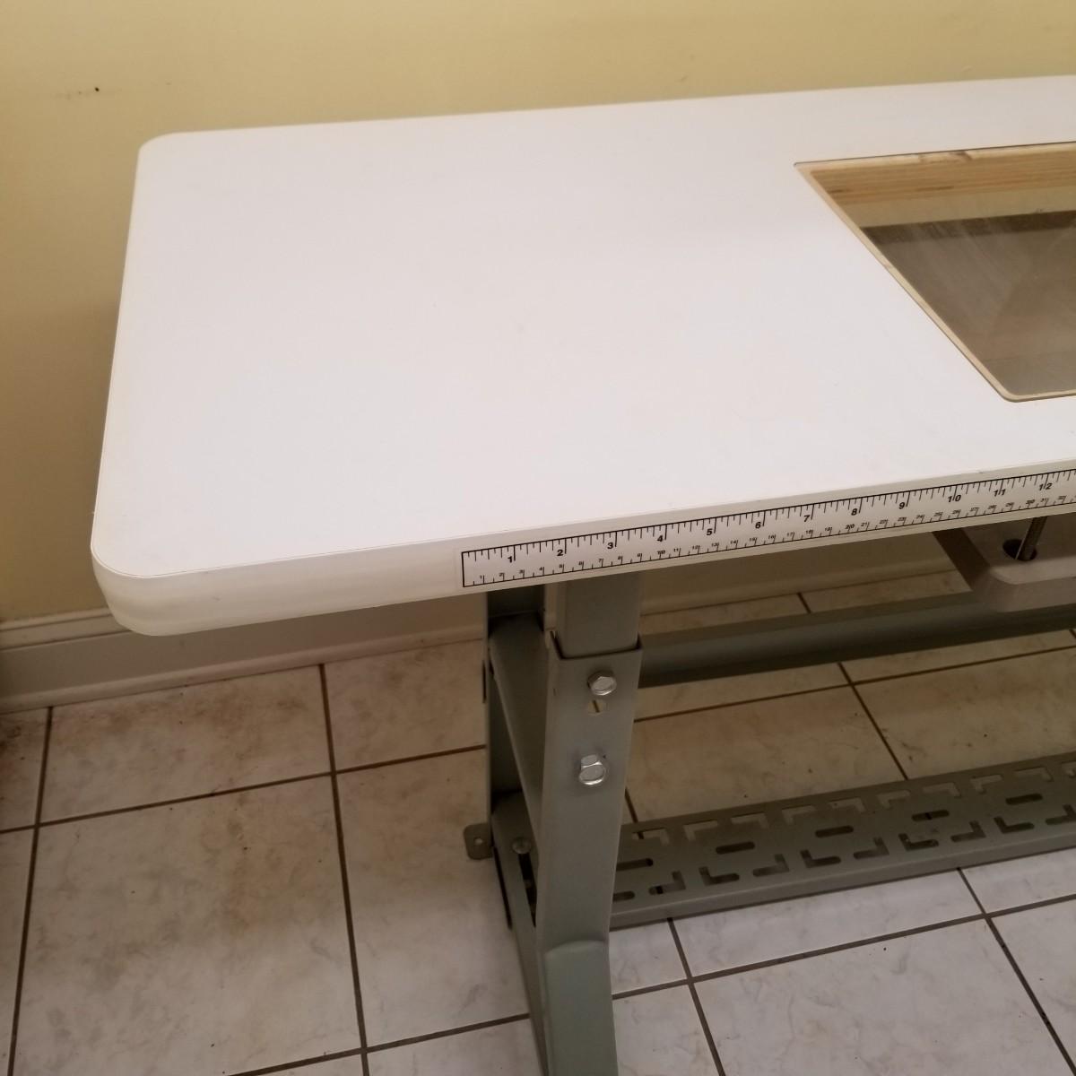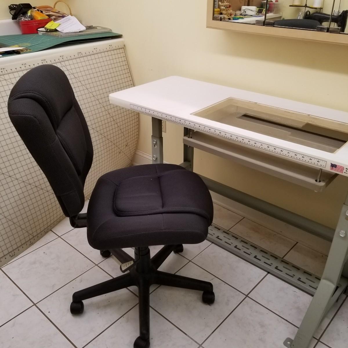 Sewing work table by Sew Perfect Company. Table has opening for sewing machine, one solid and one cutout plate and adjustable shelf to hold sewing machine. Measures 48"x20"x30", has some adjustment for height. Measuring ruler attached to front of table. Black task chair has five caster base, measures 21"x28"x39", has seat height of 20" and is also adjustable. See photos for details. Local pickup only.