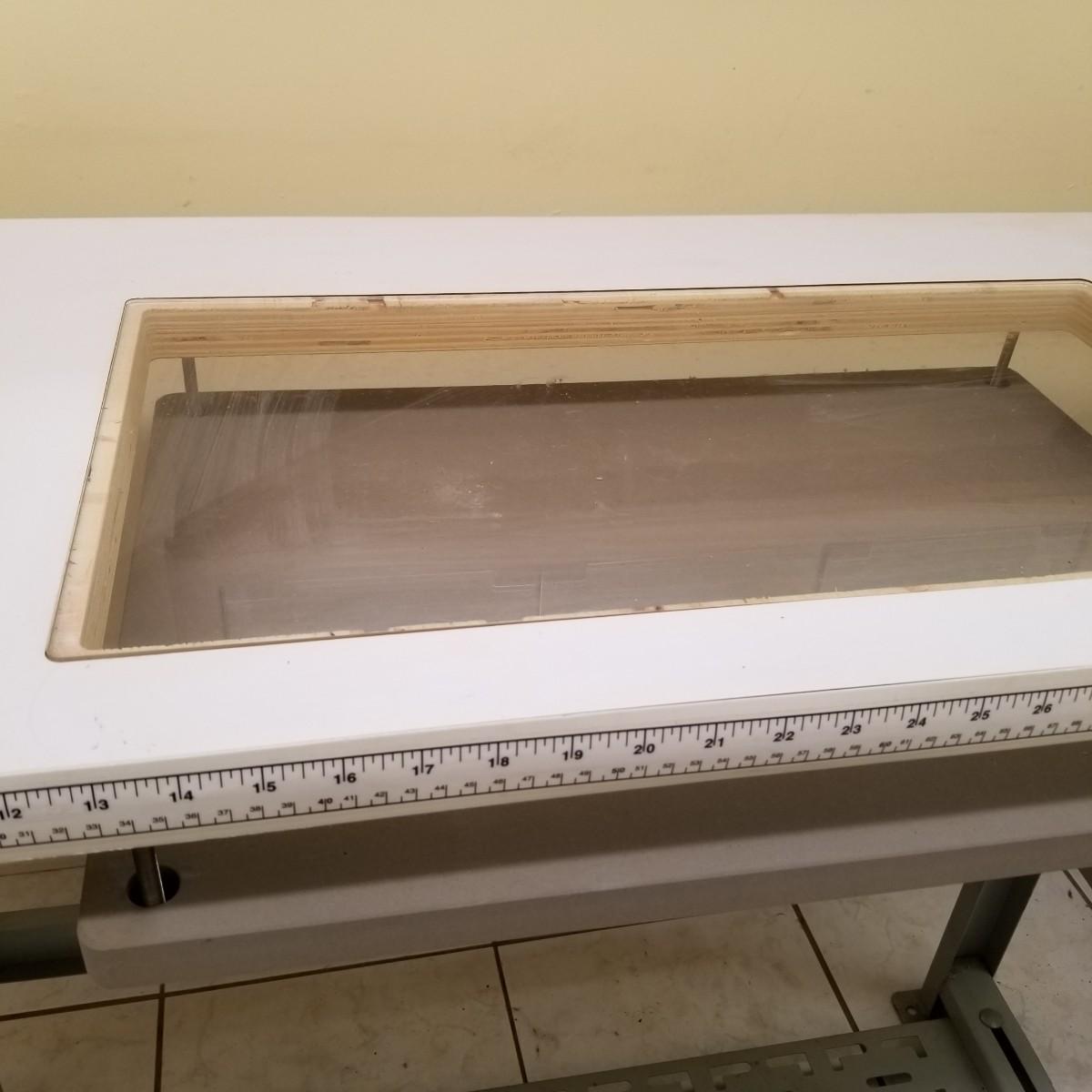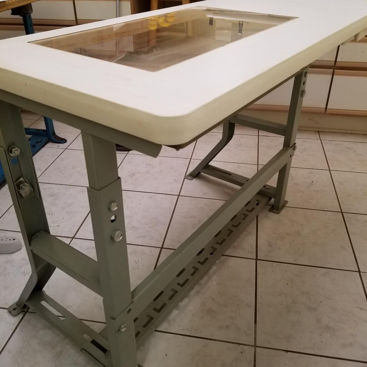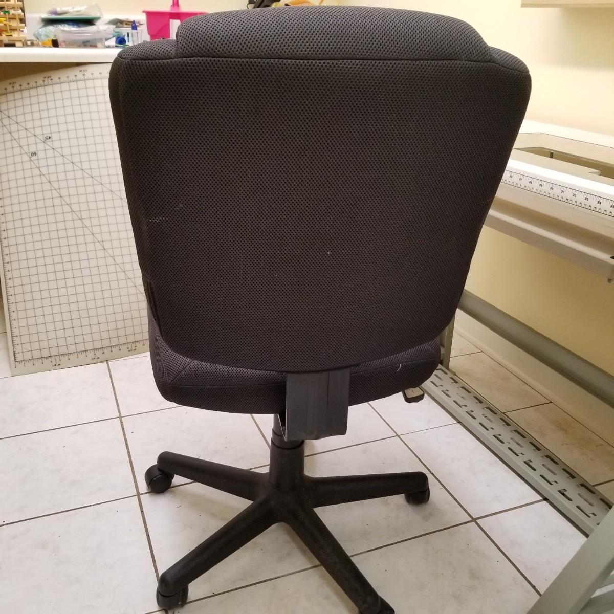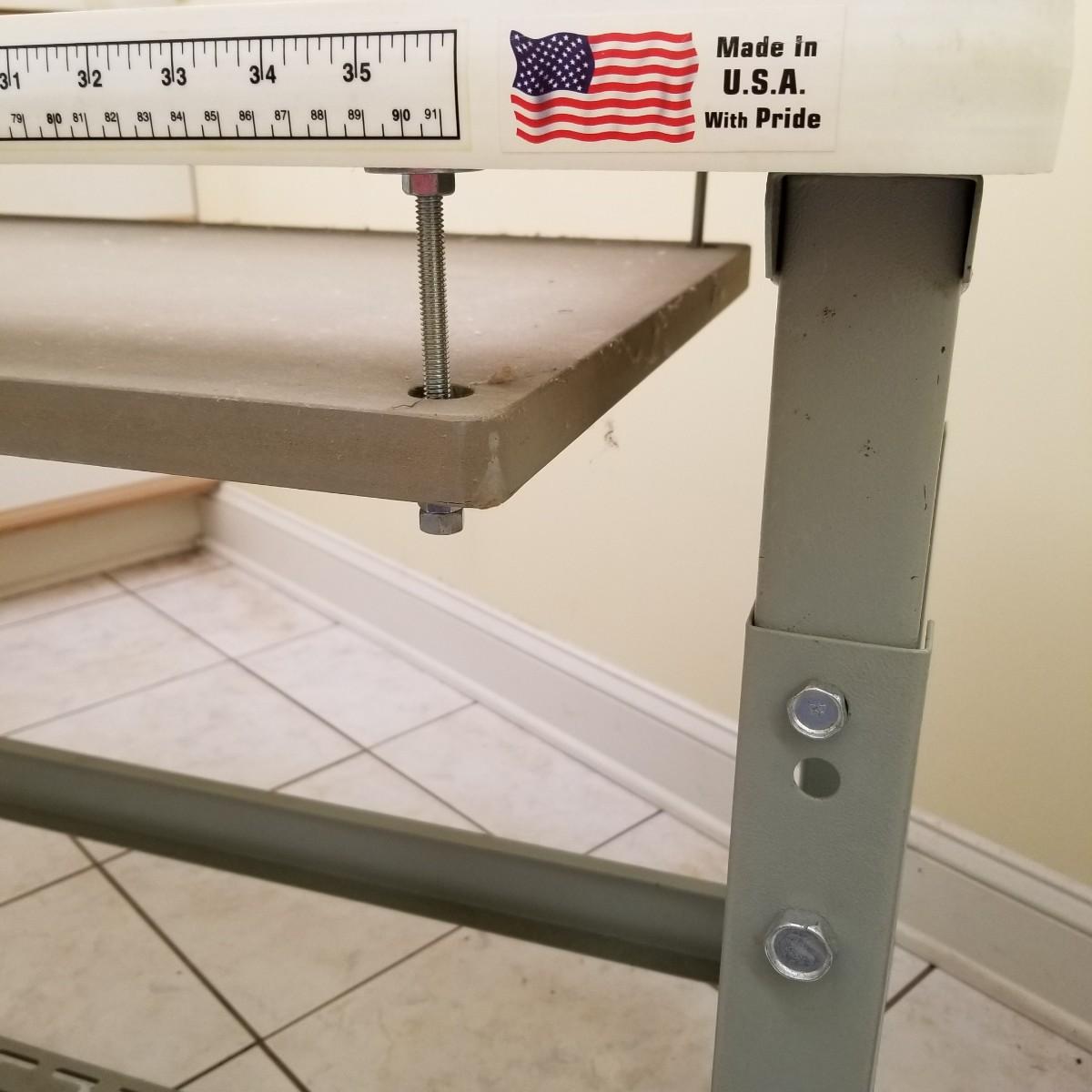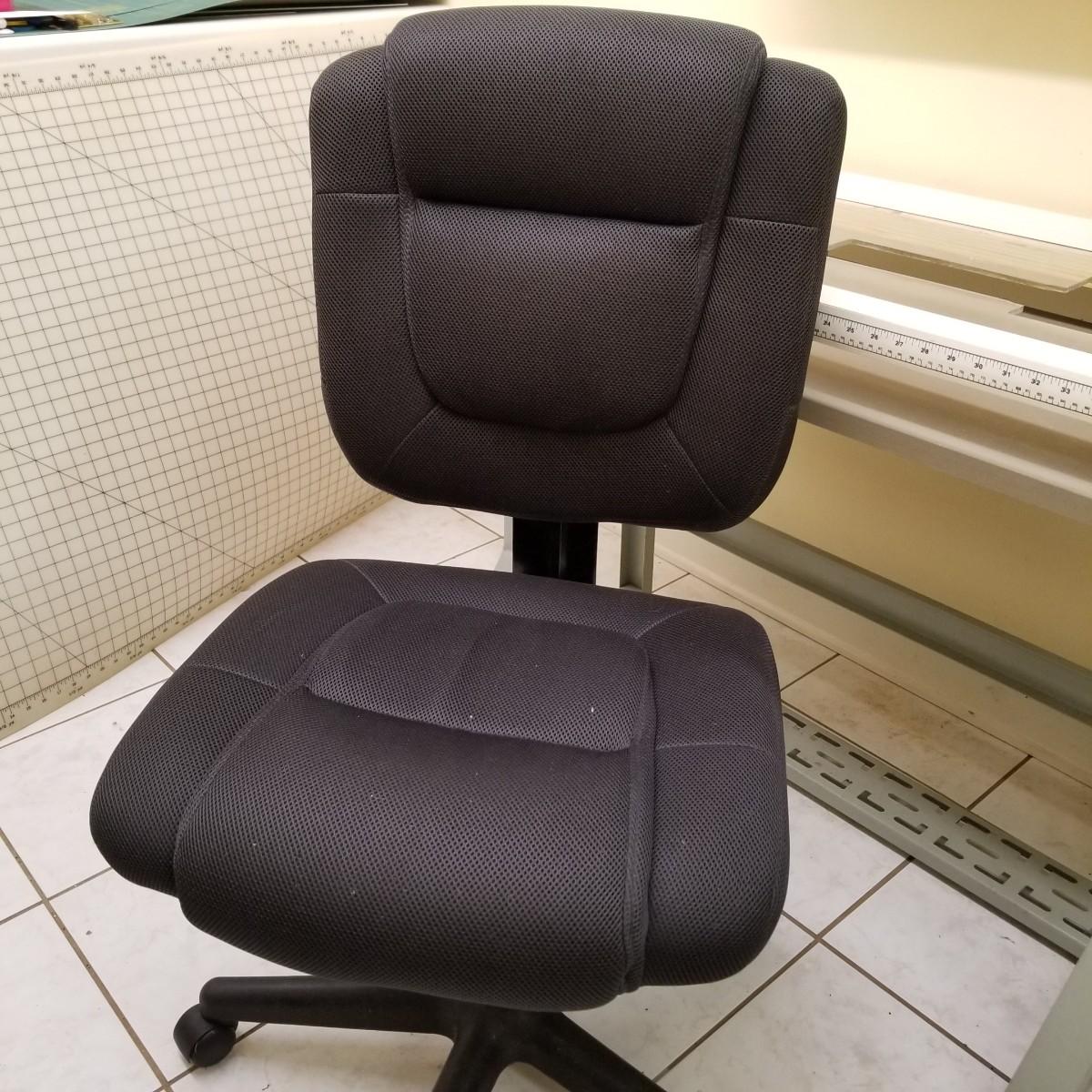 Sewing work table by Sew Perfect Company. Table has opening for sewing machine, one solid and one cutout plate and adjustable shelf to hold sewing machine. Measures 48"x20"x30", has some adjustment for height. Measuring ruler attached to front of table. Black task chair has five caster base, measures 21"x28"x39", has seat height of 20" and is also adjustable. See photos for details. Local pickup only.