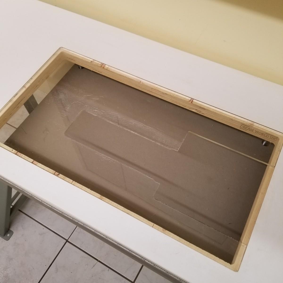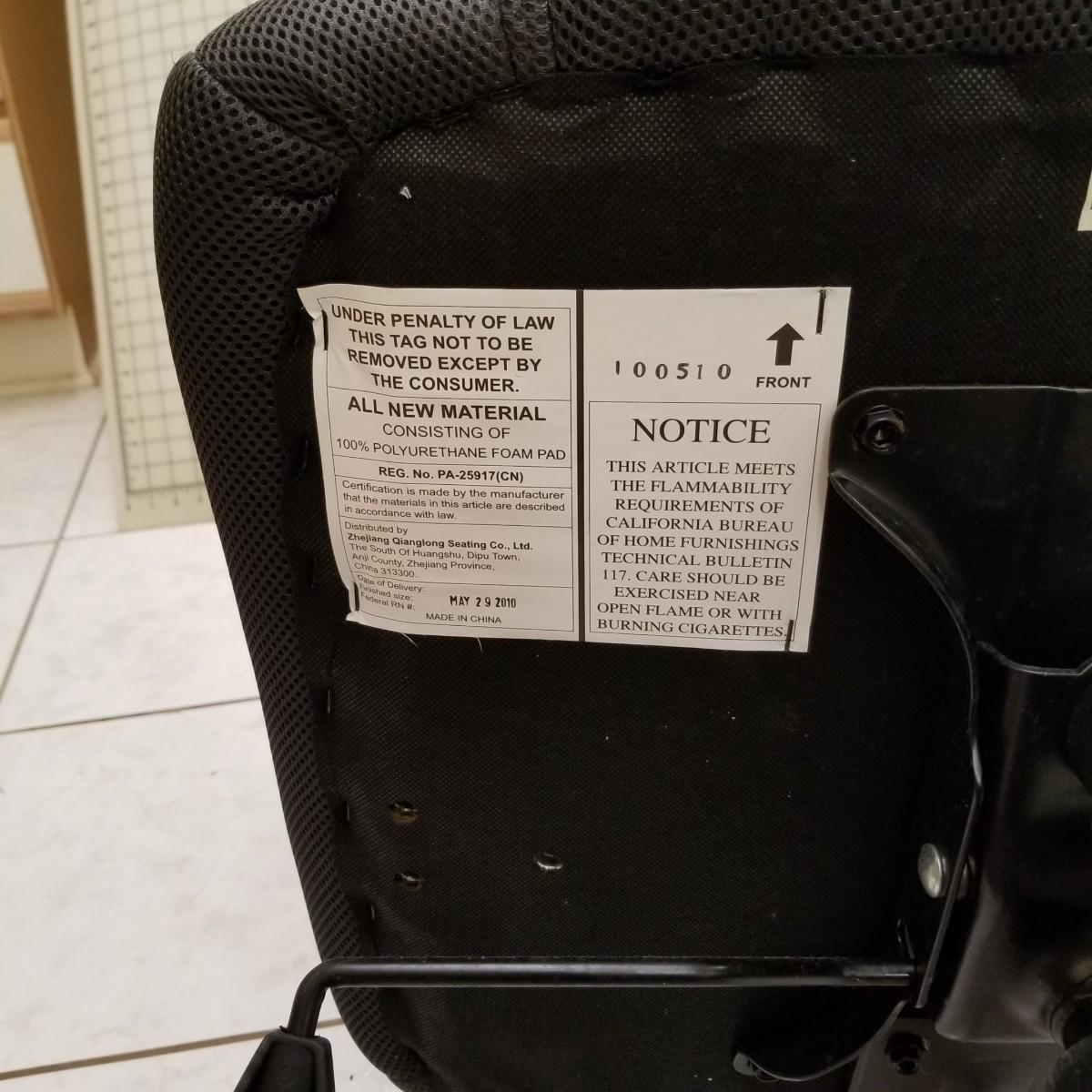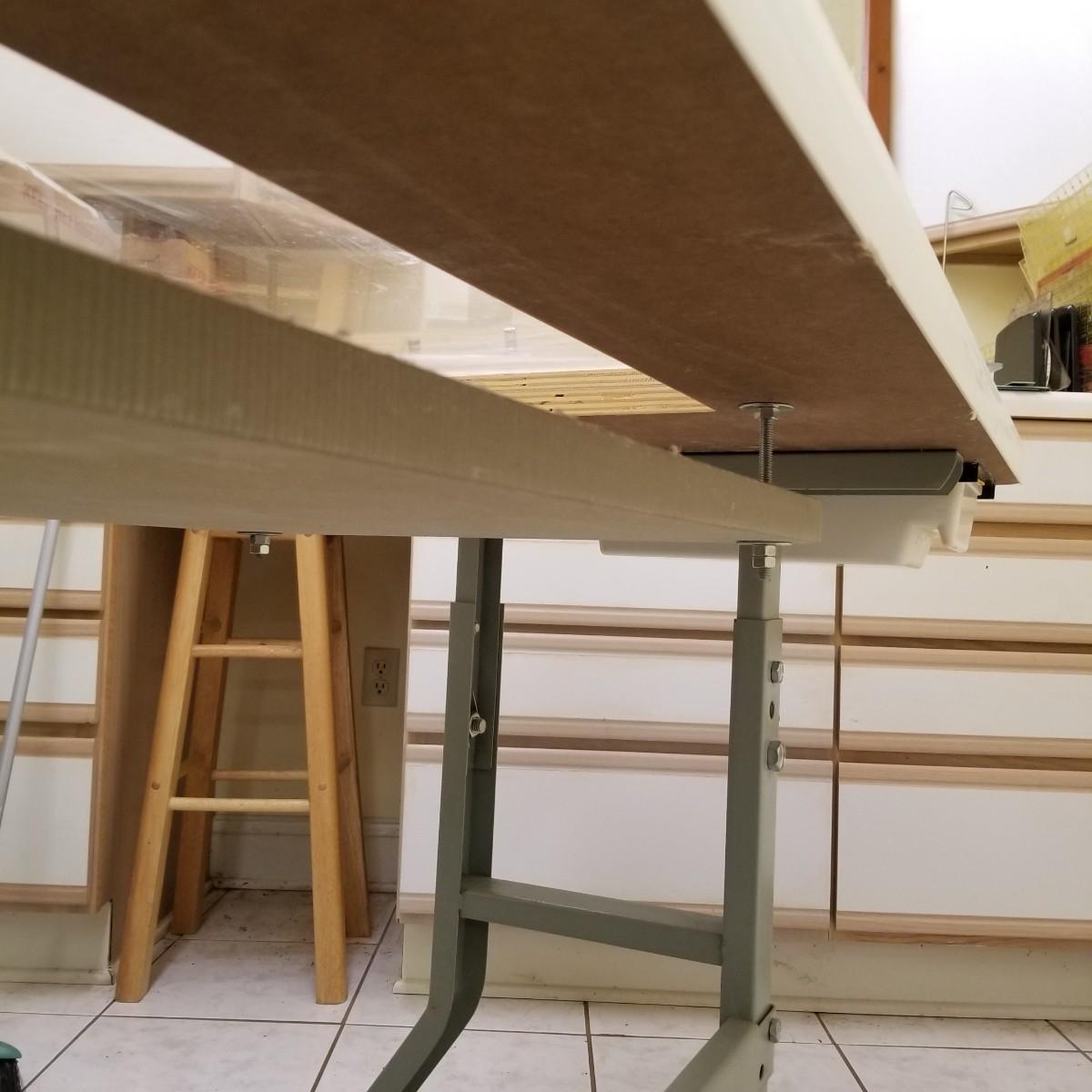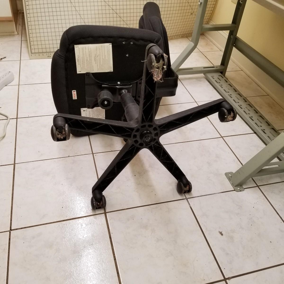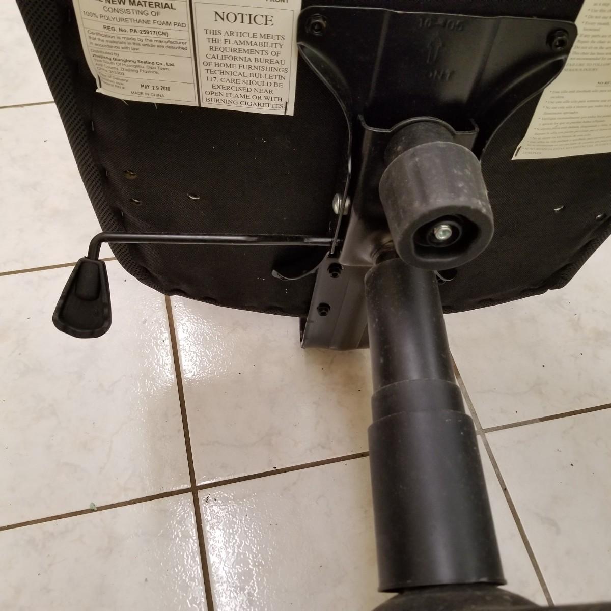 Sewing work table by Sew Perfect Company. Table has opening for sewing machine, one solid and one cutout plate and adjustable shelf to hold sewing machine. Measures 48"x20"x30", has some adjustment for height. Measuring ruler attached to front of table. Black task chair has five caster base, measures 21"x28"x39", has seat height of 20" and is also adjustable. See photos for details. Local pickup only.