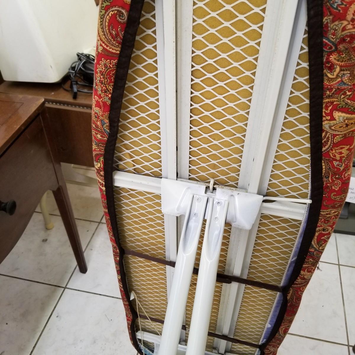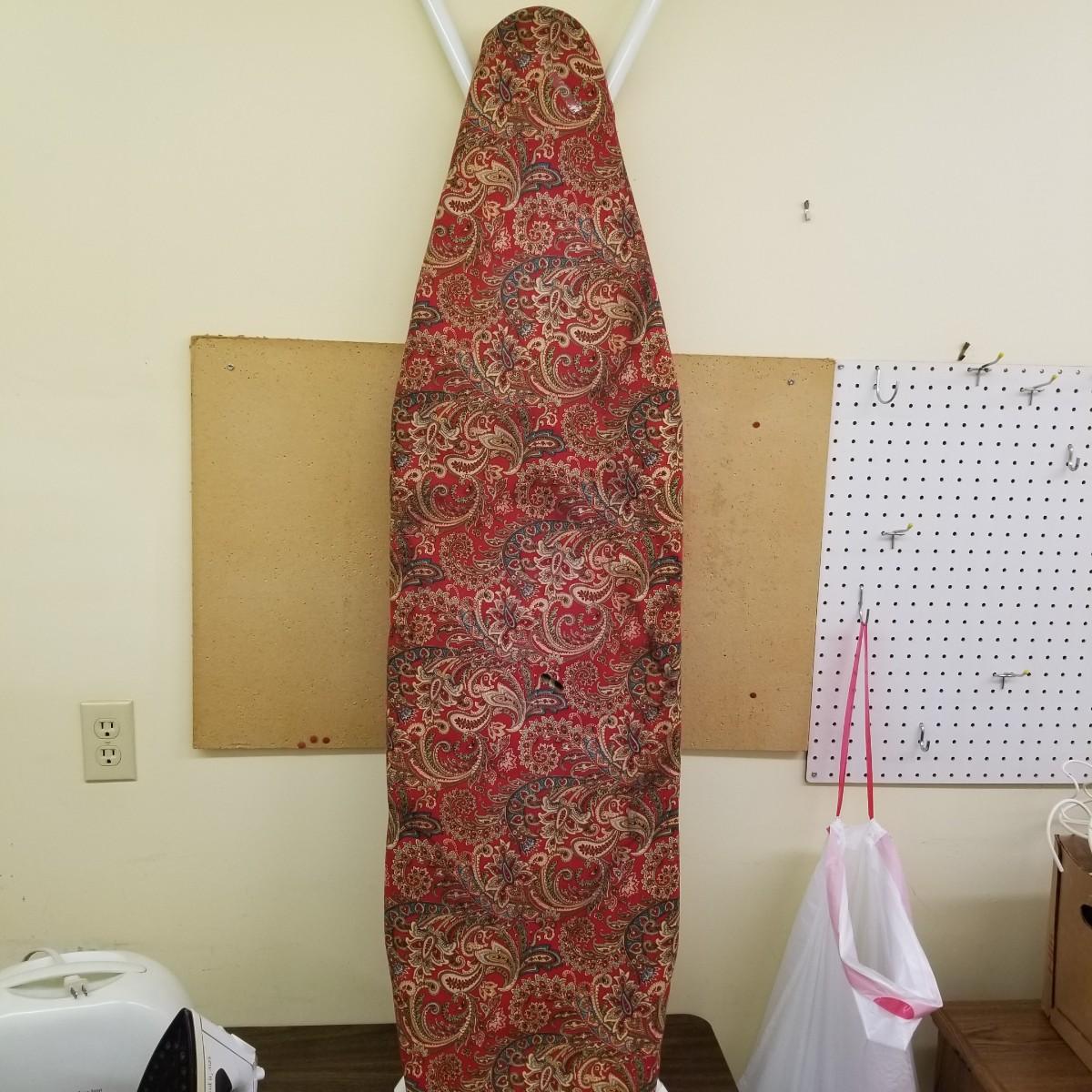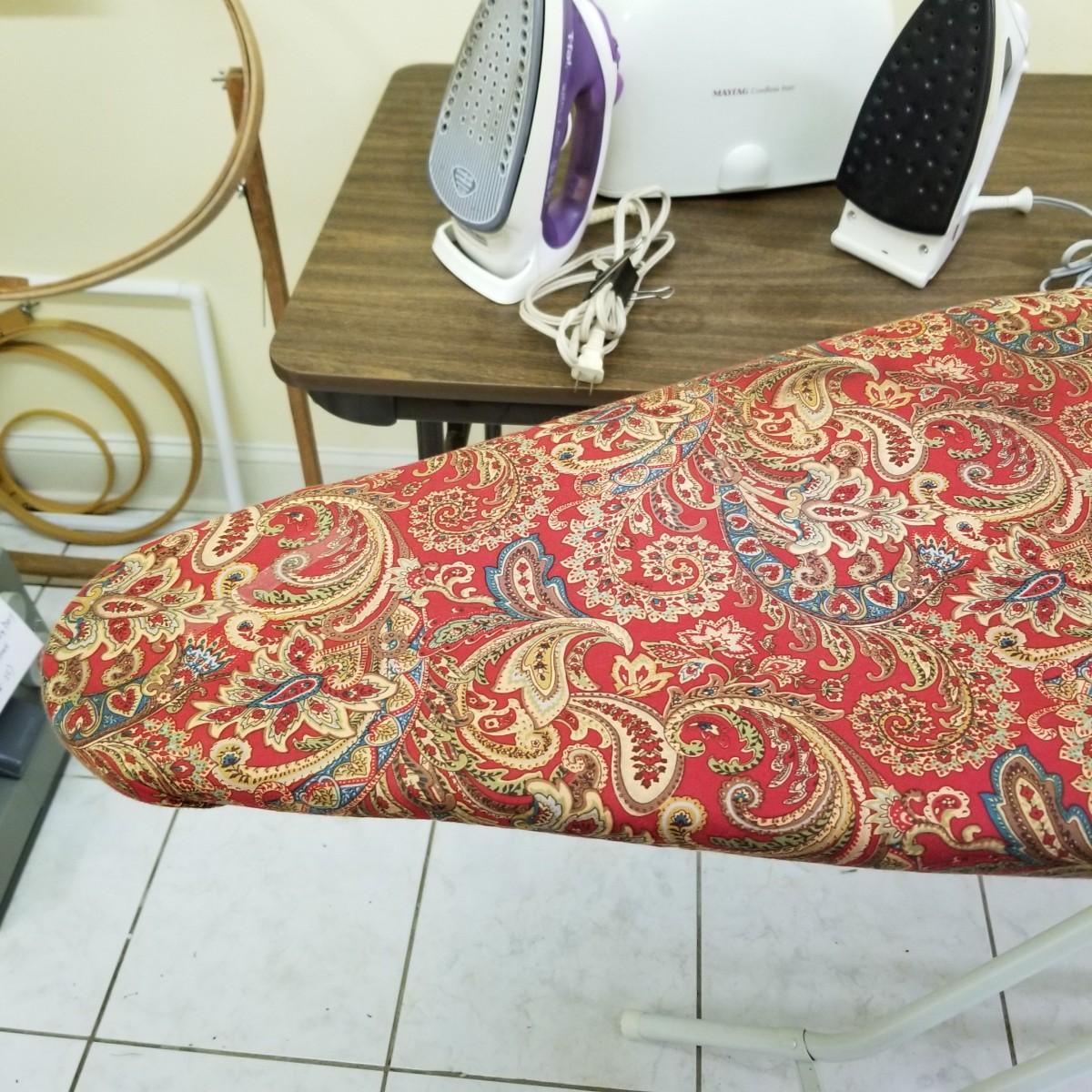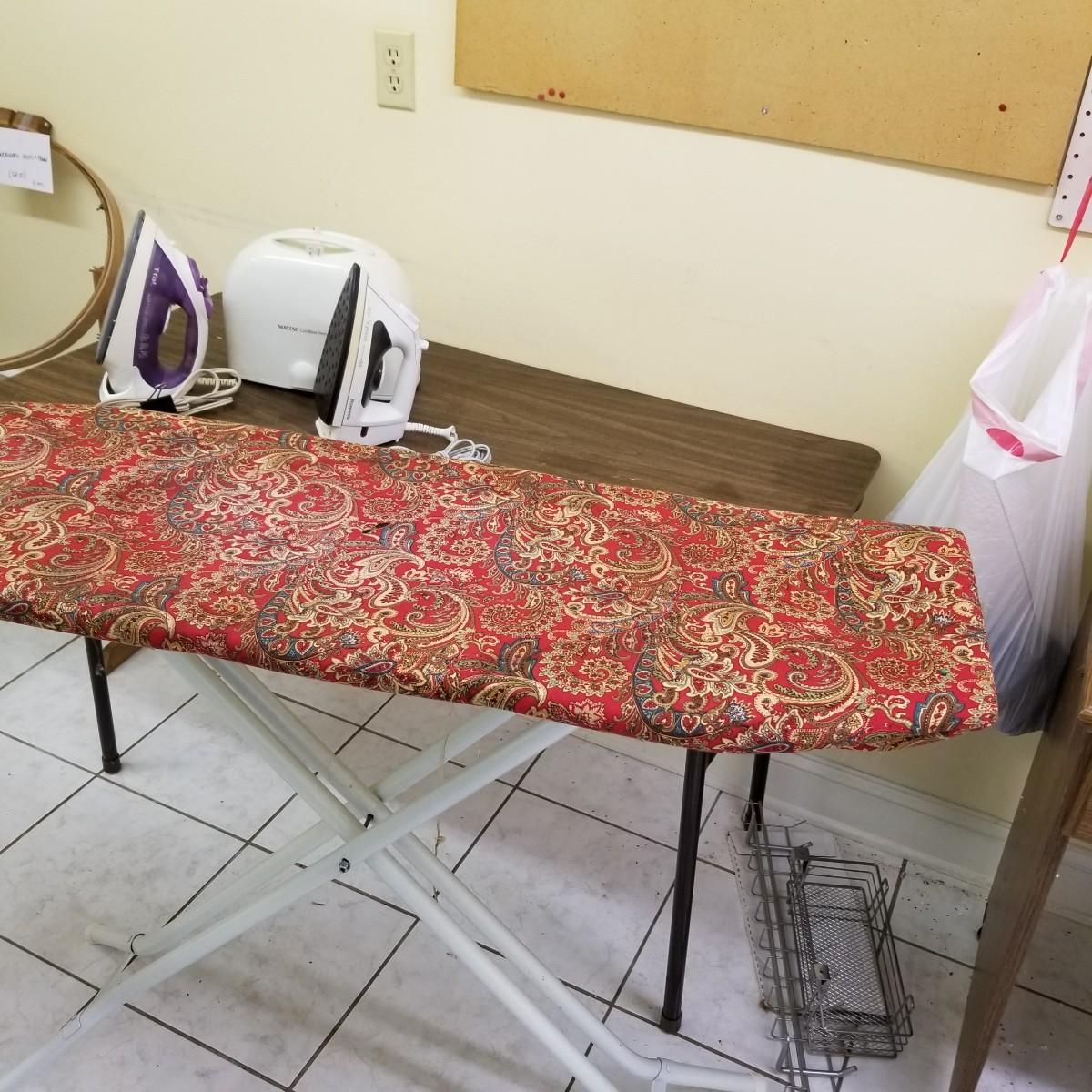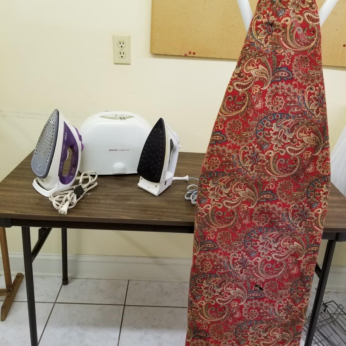 One standard size Seymour brand ironing board, 14.5"x55" with adjustable height. Cover has small hole in it. Three steam irons; one T-Fal Ultraglide, one Rowenta Sew n Press, and a Maytag cordless iron with charging stand and cover. All irons tested working. See photos for details. Local pickup only.