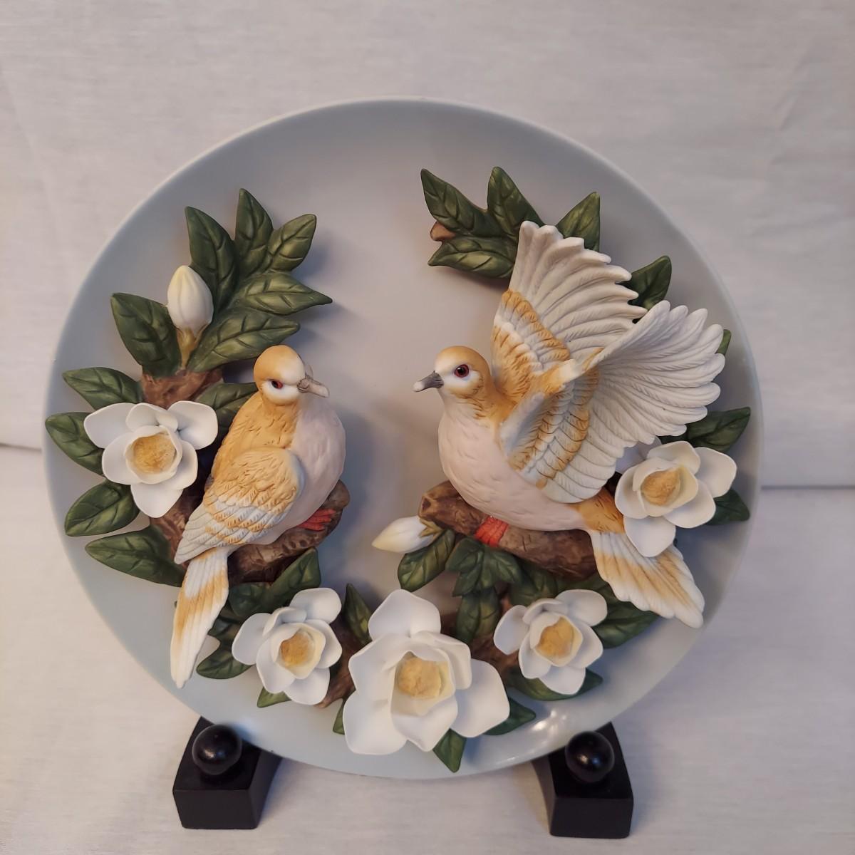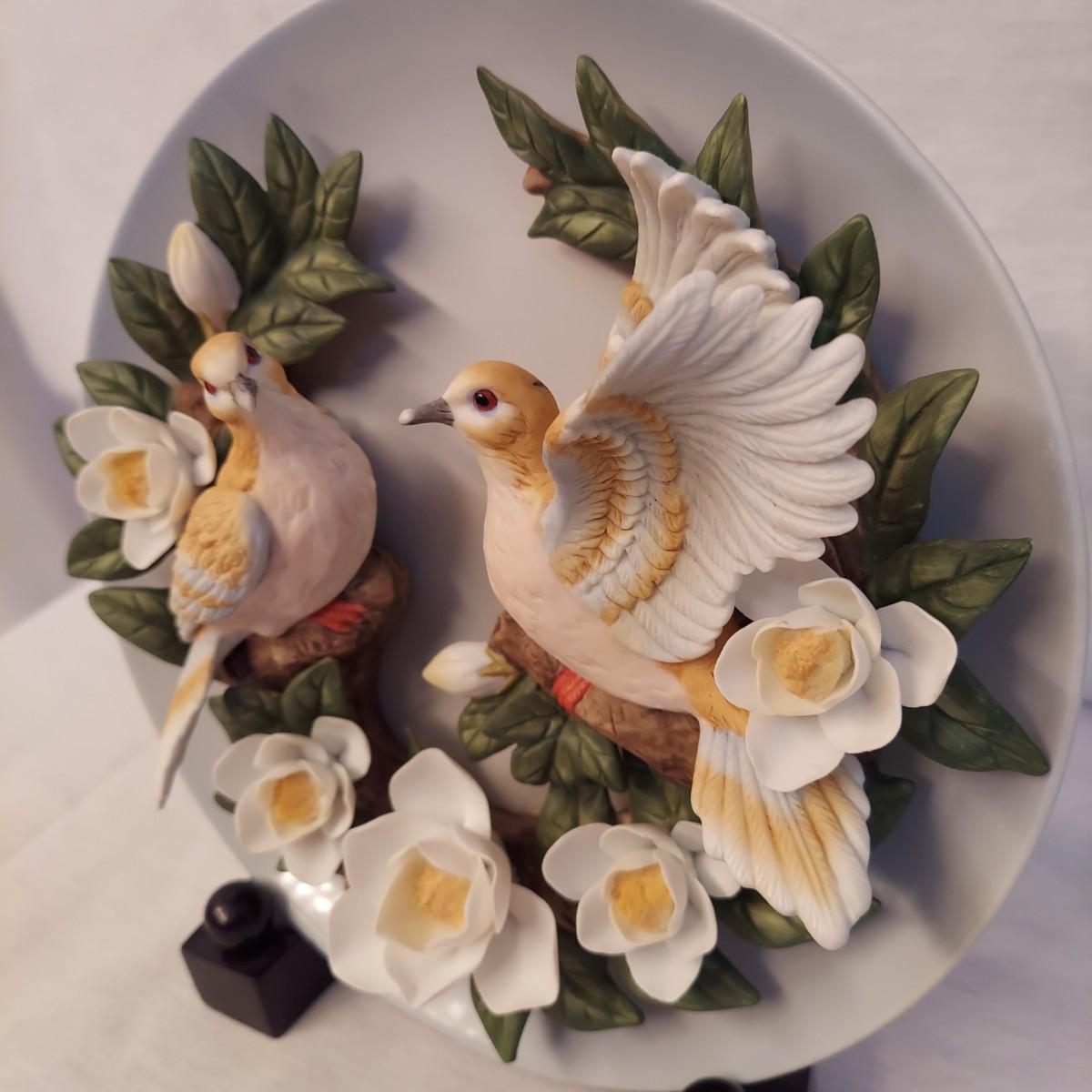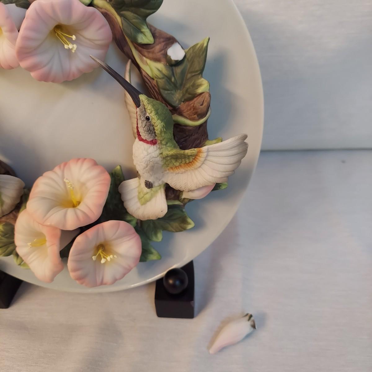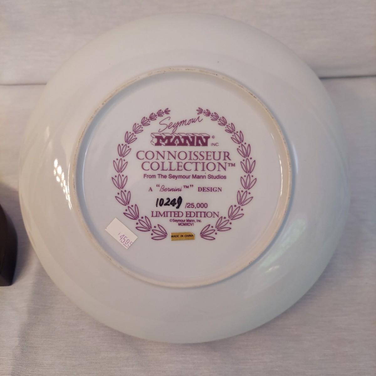 Seymour Mann Studios Connoisseur Collection limited edition collectible bird plates. The hummingbird plate has a few broken pieces. One is included to be glued back on. The dove plate is #514 of 25,000. The hummingbird plate is #10249 of 25,000. They come with wooden stands. Plates measure 9”D. Shipping available