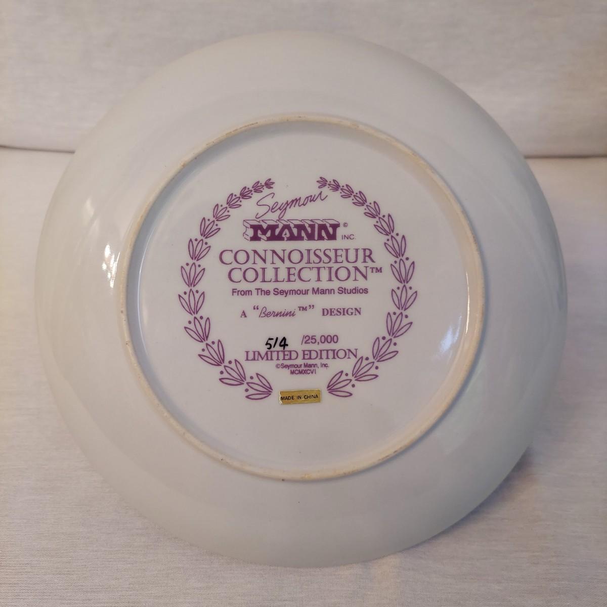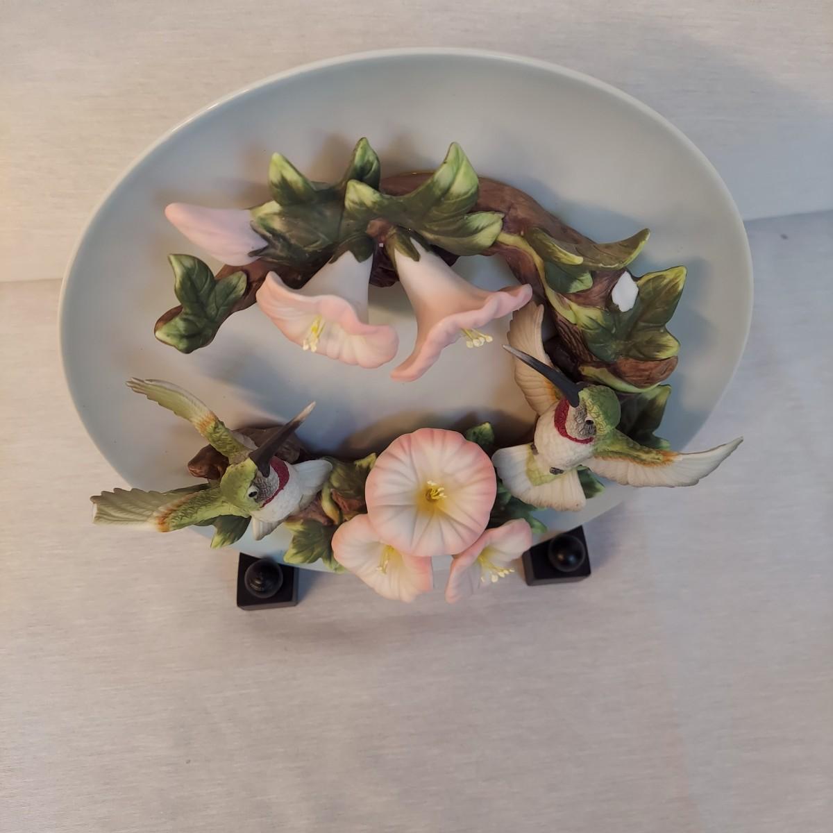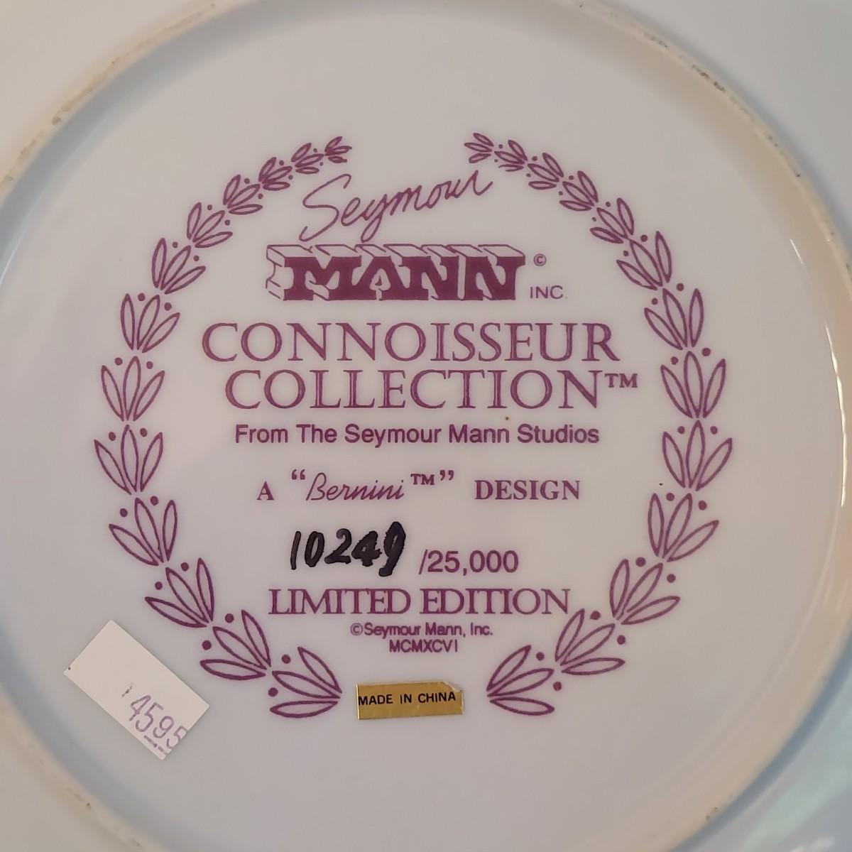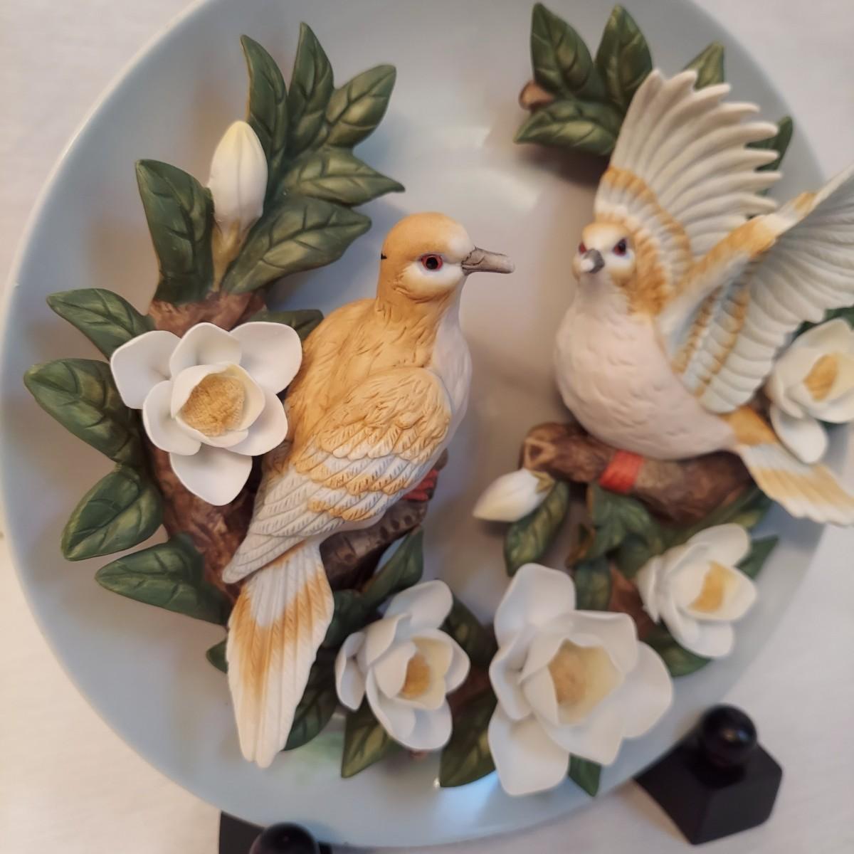 Seymour Mann Studios Connoisseur Collection limited edition collectible bird plates. The hummingbird plate has a few broken pieces. One is included to be glued back on. The dove plate is #514 of 25,000. The hummingbird plate is #10249 of 25,000. They come with wooden stands. Plates measure 9”D. Shipping available