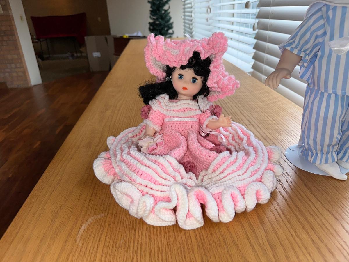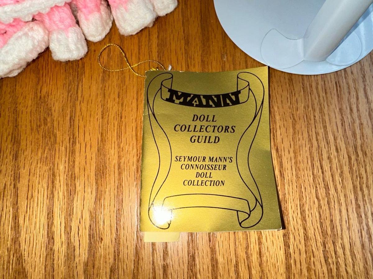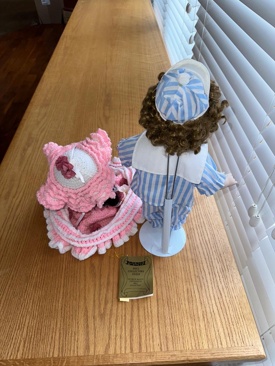 SEYMOUR MANN SAMMY PORCELAIN DOLL AND HAND CROCHETED BED PILLOW DOLL