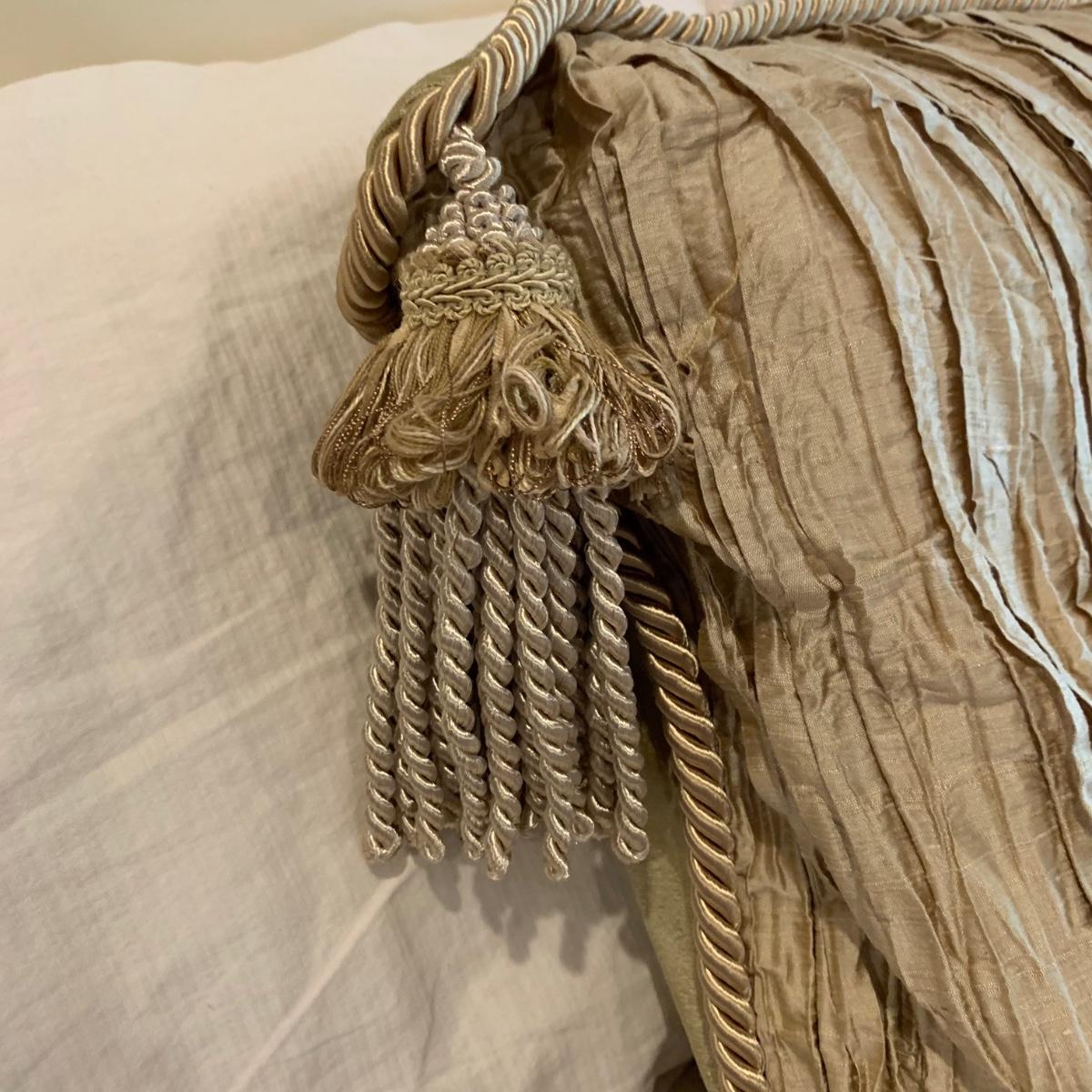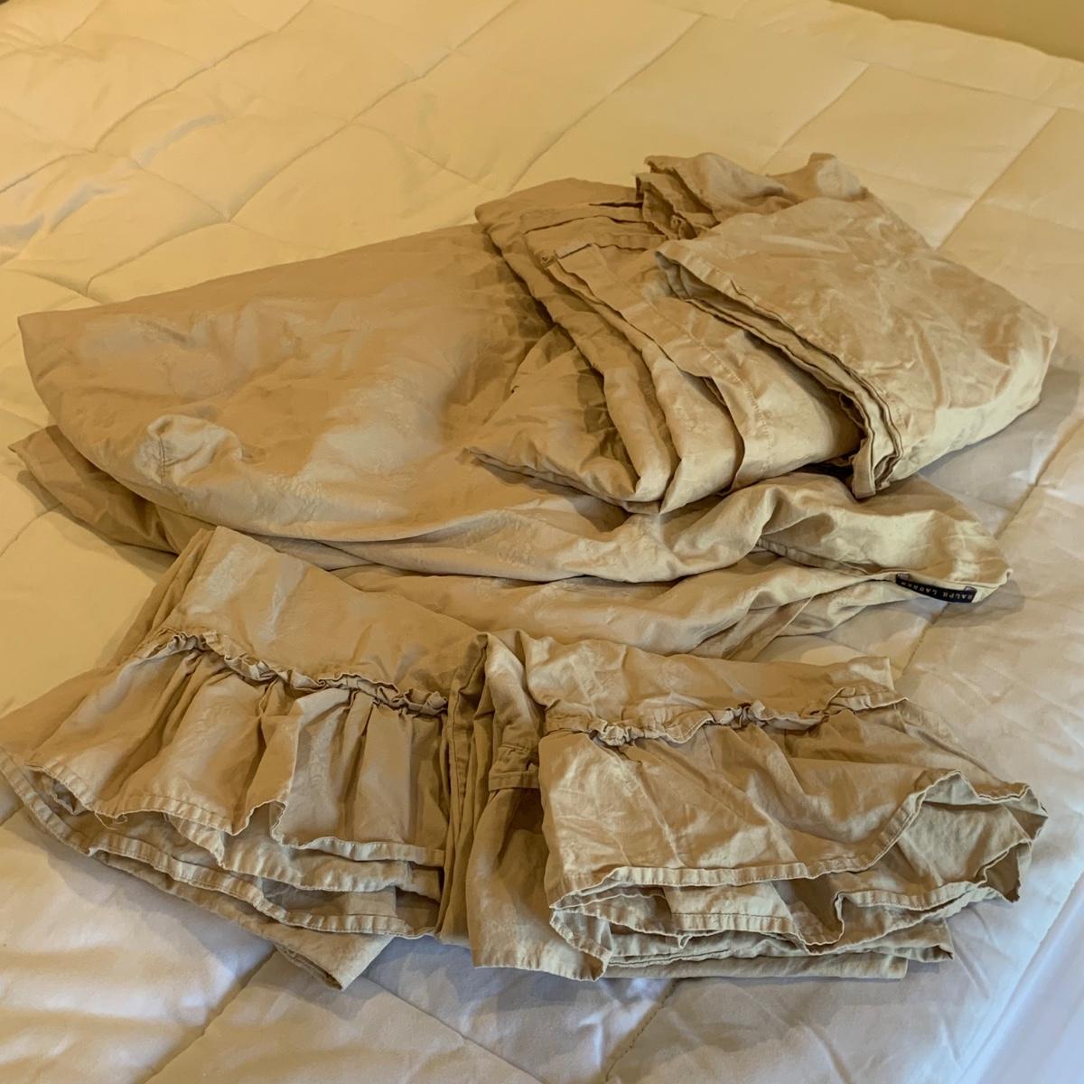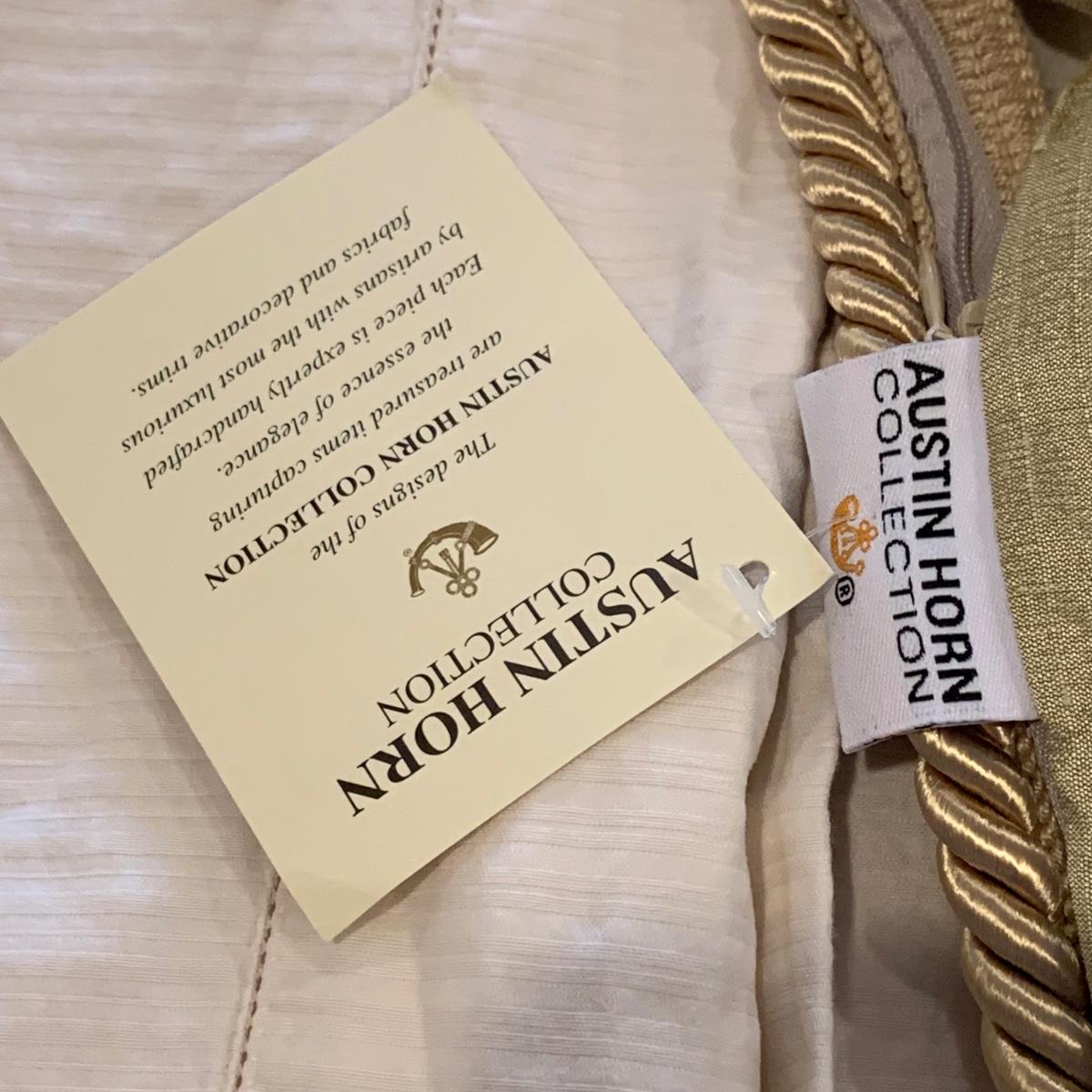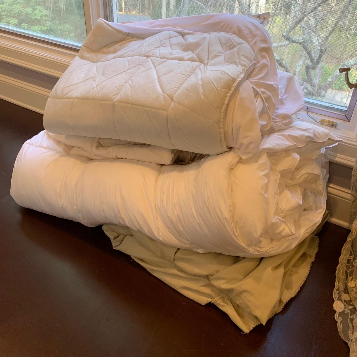 Two queen size sheet sets, one by Sferra and the other Ralph Lauren. The Ralph Lauren set is a cotton/silk blend that feels luxurious. Also included is a silk Austin Horn pillowcase with tassels and a Dian Austin queen size duvet cover, as well as a king size Cuddledown duvet with king size linen duvet cover. There is also a Ralph Lauren queen size mattress pad.